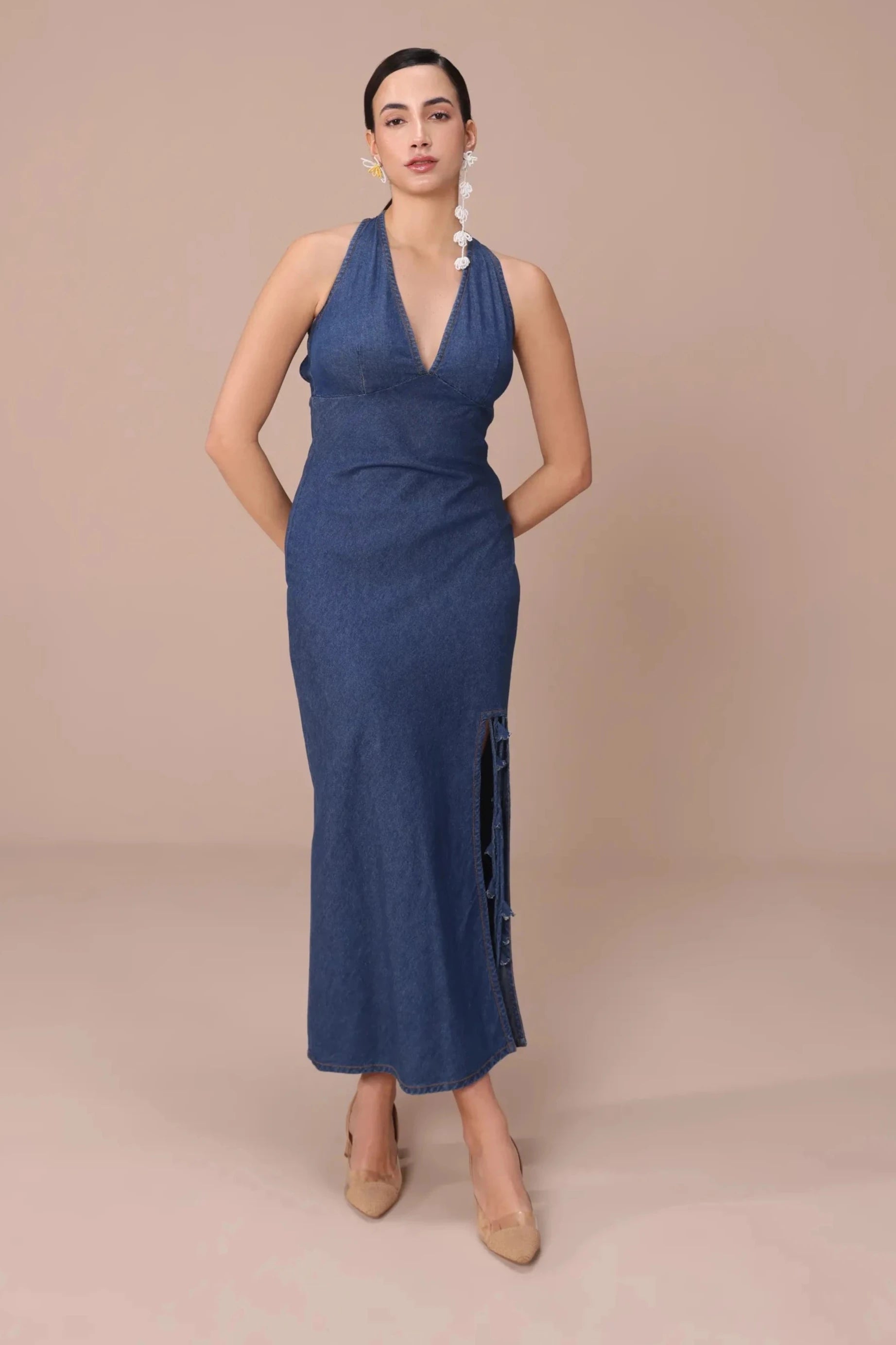 The Blue Denim High Slit Dress combines the timeless appeal of denim with a daring, high-slit design for a bold yet elegant look. Featuring a flattering fitted silhouette and a sleek, modern cut, this dress is perfect for making a statement. The high slit adds a touch of sophistication, while the blue denim fabric ensures versatility for both casual and evening wear. Whether paired with sandals for a laid-back vibe or heels for an elevated look, this dress is an essential piece for anyone seeking effortless style with a hint of edge.