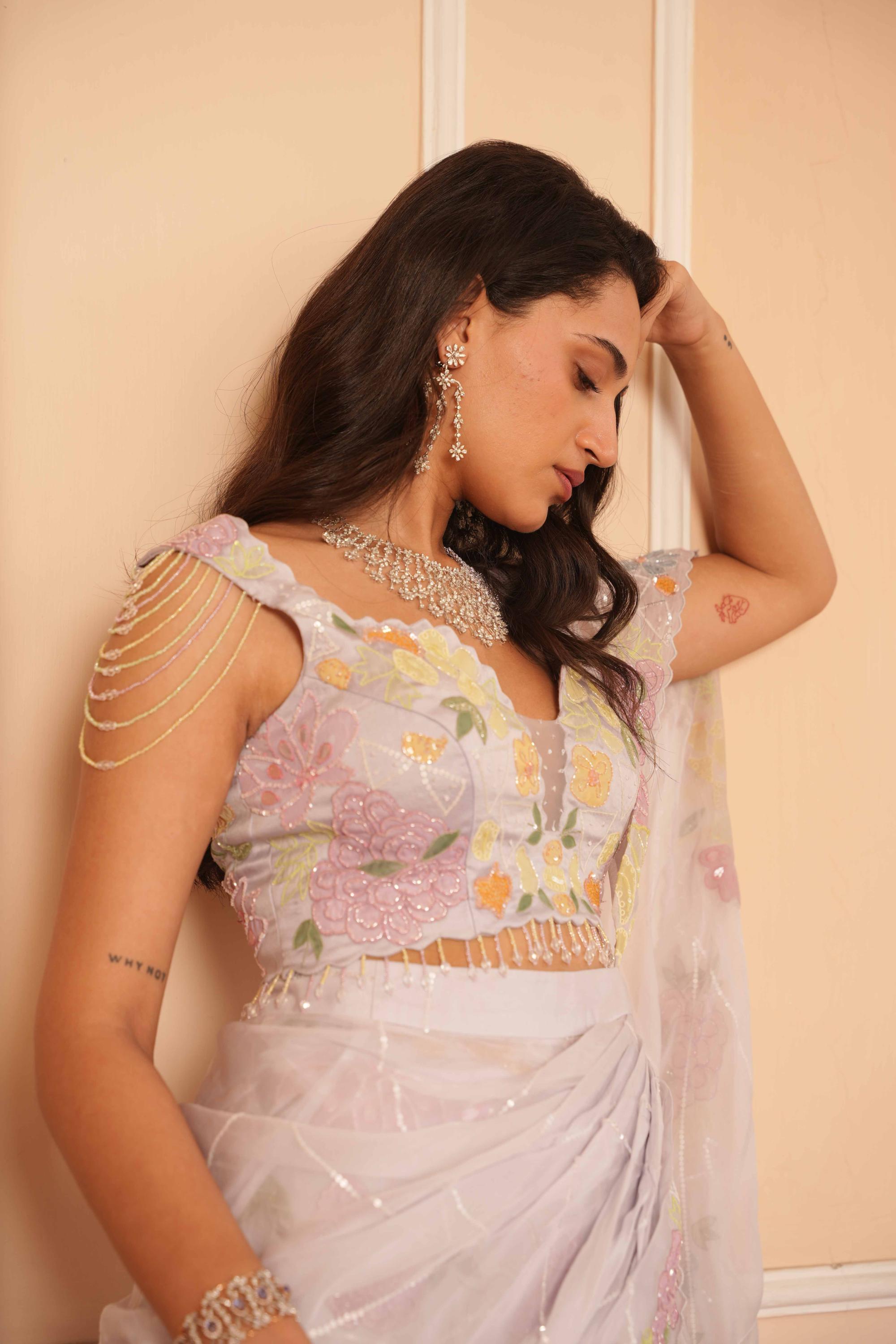 The Blue Dil Se Kiara Drape Saree is a fluid fusion of elegance, ease, and understated drama. Cloaked in a serene blue hue and sculpted in a contemporary draped silhouette, this saree is for the modern muse who honors tradition but dresses with her own rhythm. The name Kiara, meaning “bright” and “graceful,” mirrors the saree’s gentle flow, subtle shimmer, and confident charm. Perfect for receptions, cocktail evenings, or statement celebrations. Pair with crystal accessories and sleek heels for a look that’s radiant, refined, and deeply dil se.