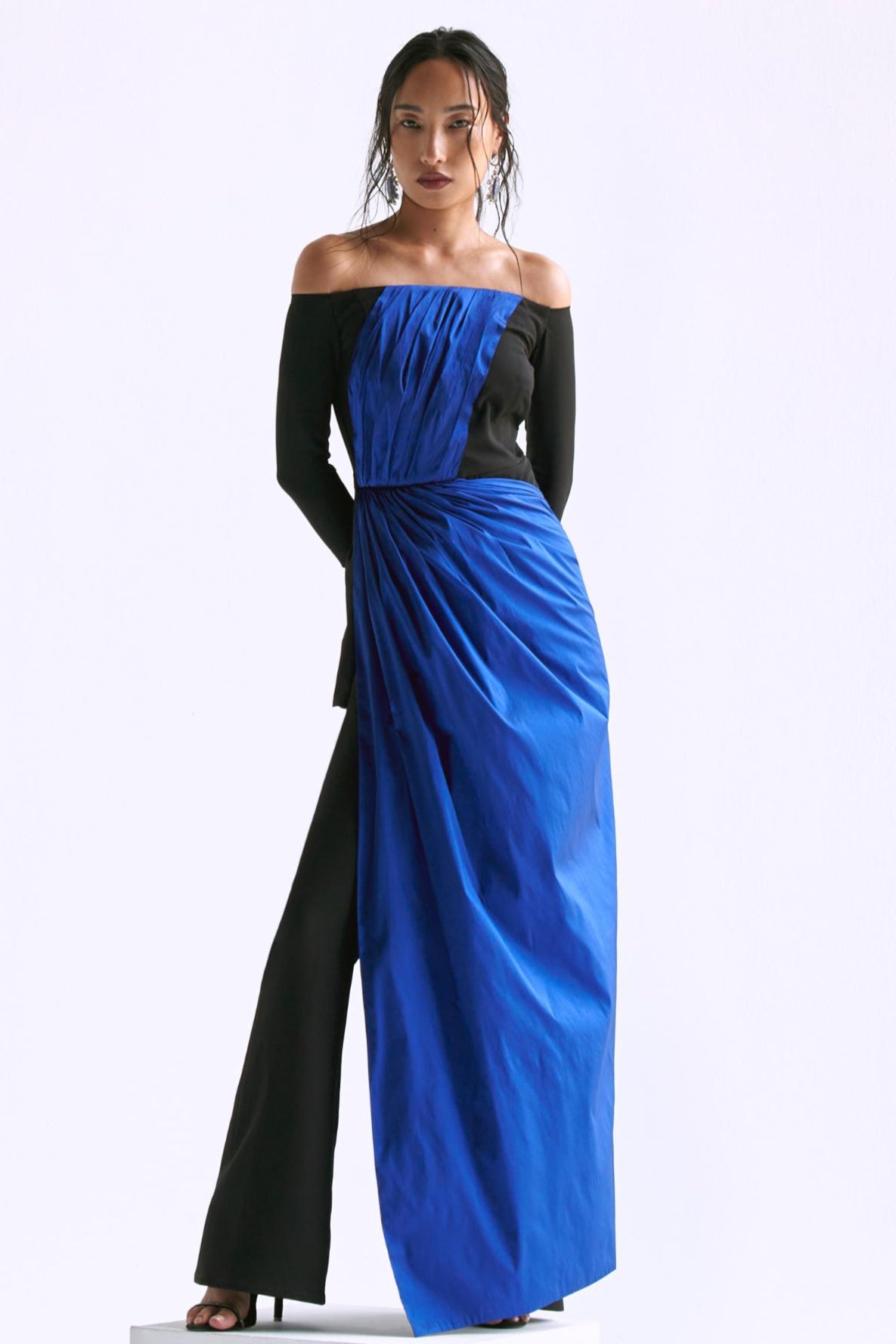 The Blue Draped Contrast Reim Co-Ord Set seamlessly blends modern design with luxurious sophistication. Featuring a striking contrast color palette, this set exudes both style and confidence. The draped detailing on the top creates a fluid, elegant silhouette, while the tailored fit of the trousers ensures a flattering, streamlined look.