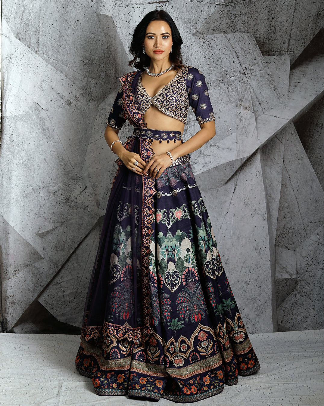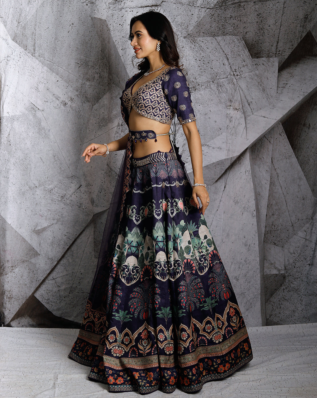 Step into elegance with the blue floral paradise lehenga, where geometric and floral motifs come together in a breathtaking design. This digitally printed blue lehenga features a beautifully embroidered belt adorned with the brand’s logo at the center. The blouse is a work of art with its gold kasab embroidery and shimmering mirror work. Completing the look are a matching dupatta and a coordinating waist belt, offering a sophisticated and stylish ensemble perfect for any special occasion.