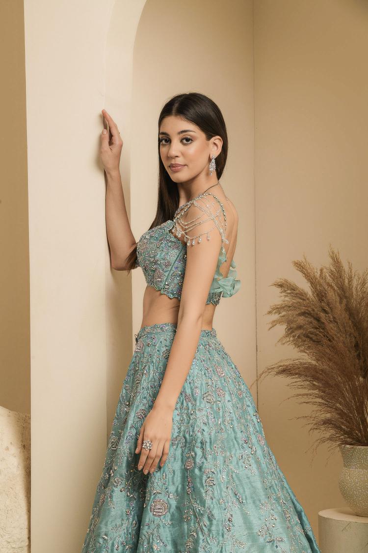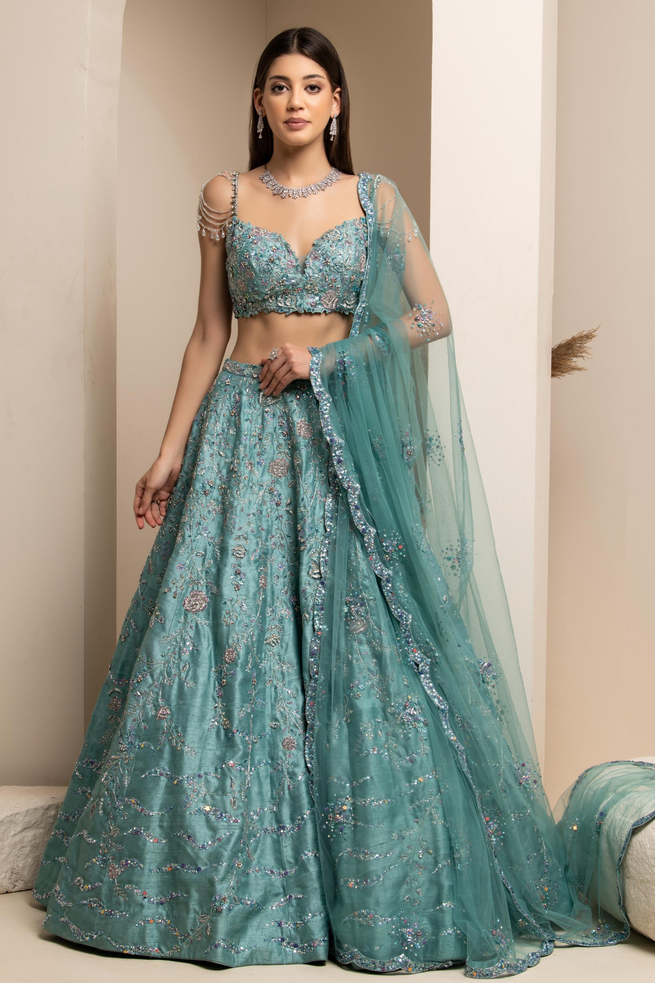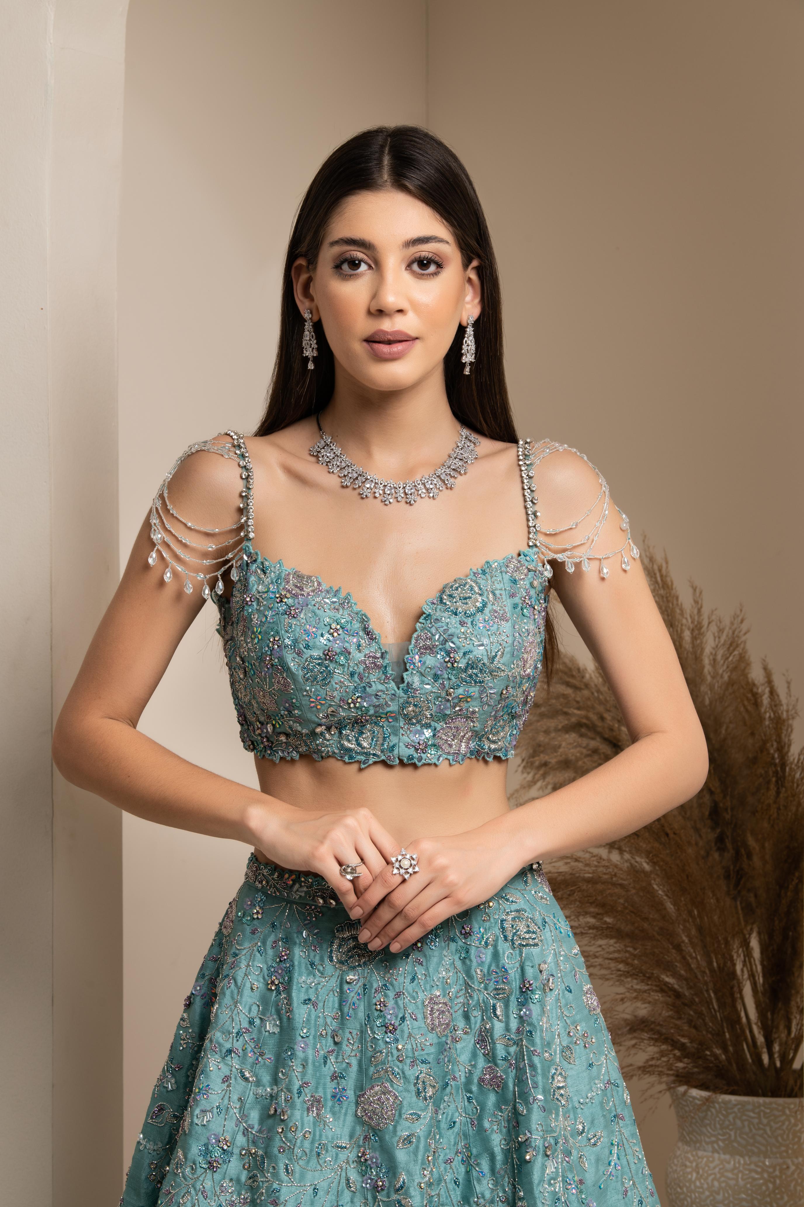 Embrace timeless elegance with this blue-green embroidered lehenga set, a stunning fusion of rich hues and intricate craftsmanship. Delicately adorned with exquisite embroidery, this ensemble exudes regal charm, making it a perfect choice for weddings, festive celebrations, and grand soirŽes. The harmonious blend of blue and green tones enhances its ethereal appeal, while the flowing silhouette of the lehenga paired with a meticulously crafted blouse ensures effortless sophistication.