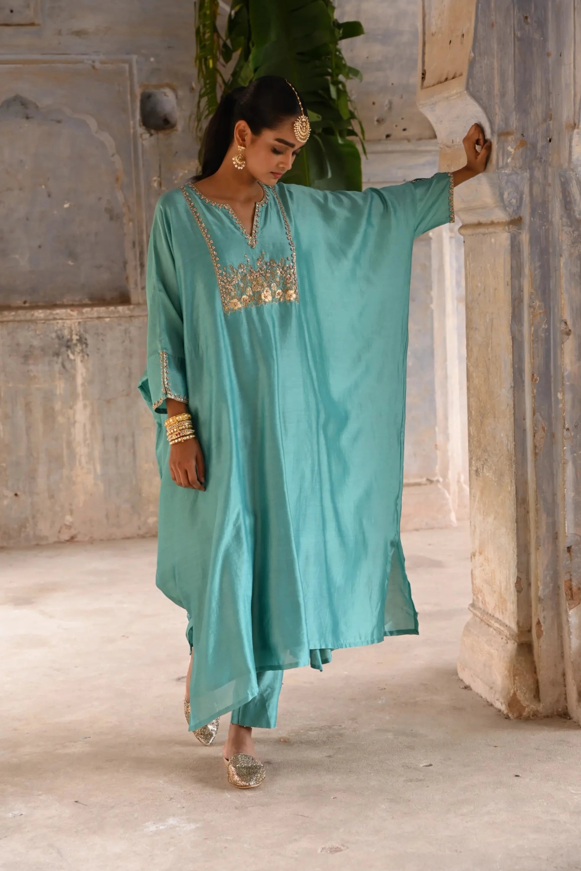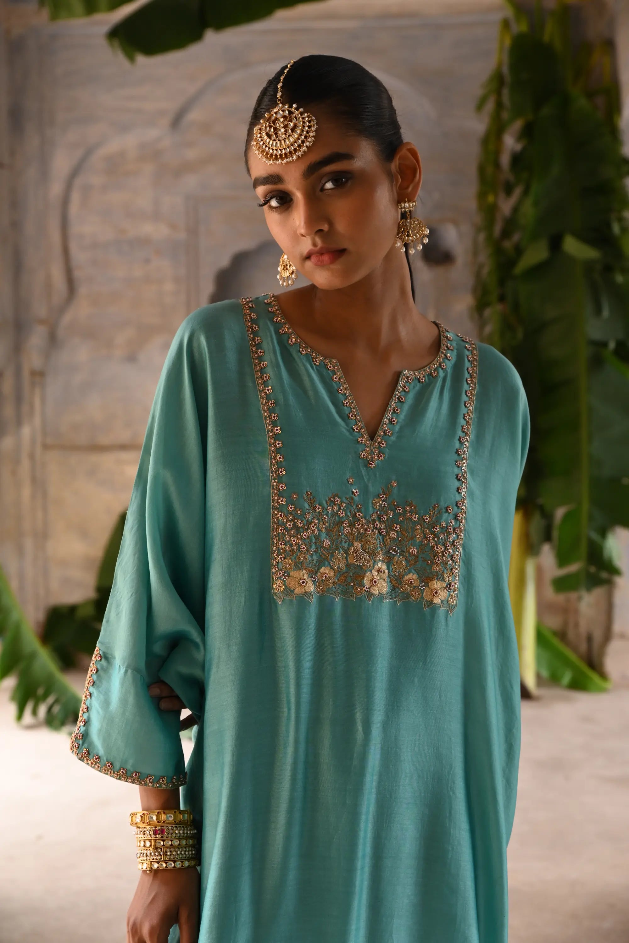 Embrace effortless elegance with our Blue Hand Embroidered Kaftan. This stunning piece features intricate hand embroidery that showcases the artistry of skilled artisans, adding a unique touch to the flowing silhouette. The vibrant blue hue exudes sophistication, making it perfect for casual outings, beach days, or festive celebrations.