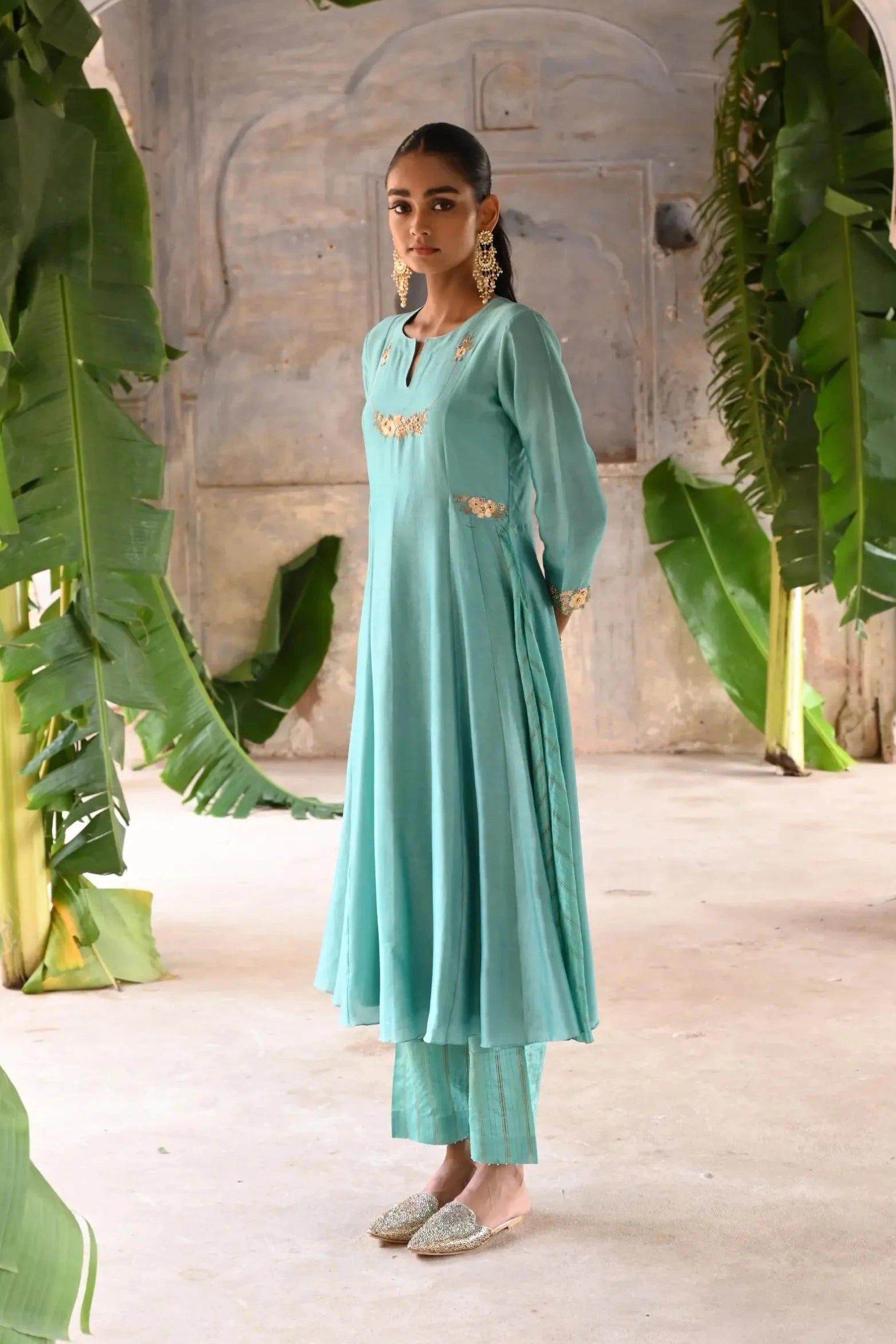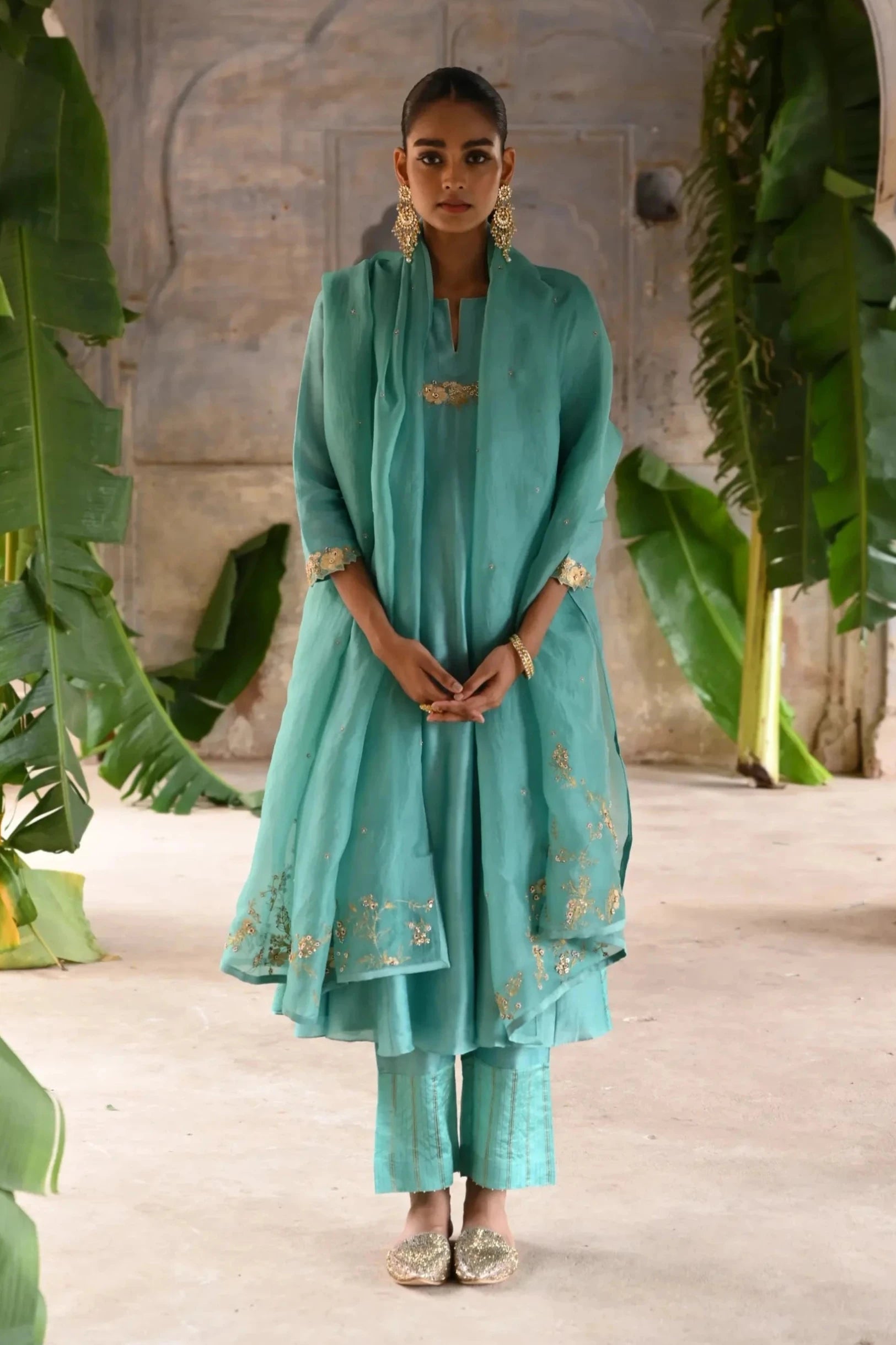 Embrace elegance with our Blue Kalli A-Line Kurta Set. This stunning ensemble features a beautifully crafted A-line kurta adorned with the traditional kalli design, creating a graceful silhouette that flatters all body types. The rich blue hue adds a vibrant touch, making it perfect for festive occasions, family gatherings, or casual outings.