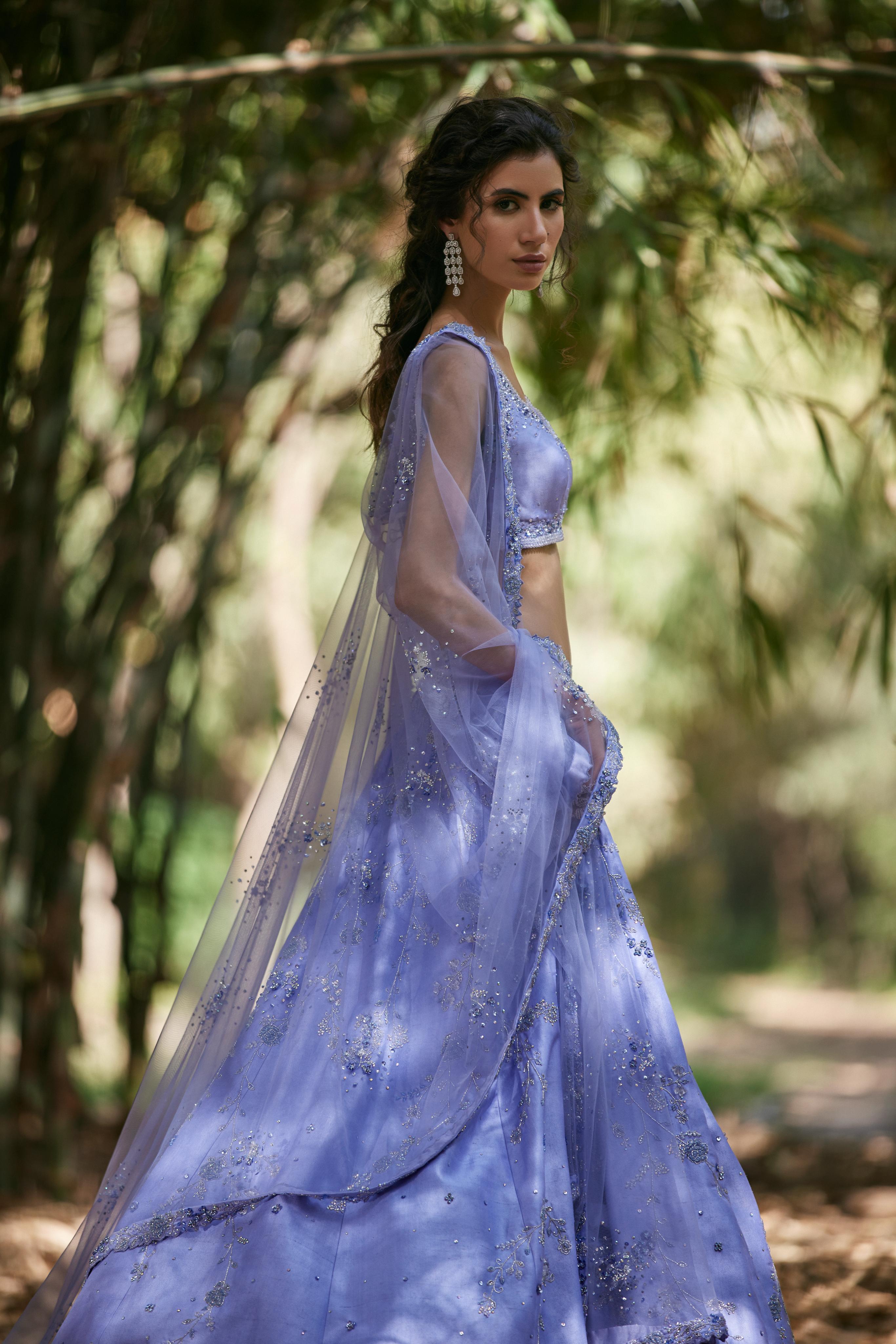 This periwinkle lehenga set is embellished with sparkling crystals and sequins, featuring an exquisite floral design. The blouse is embroidered with a delicate scatter of sequins and crystals, adding a touch of glamour. The lehenga and dupatta are both intricately embroidered with floral motifs, creating a harmonious and elegant look. The modern ensemble is completed with a beautifully cutwork-edged dupatta, perfect for making a statement at any special occasion.