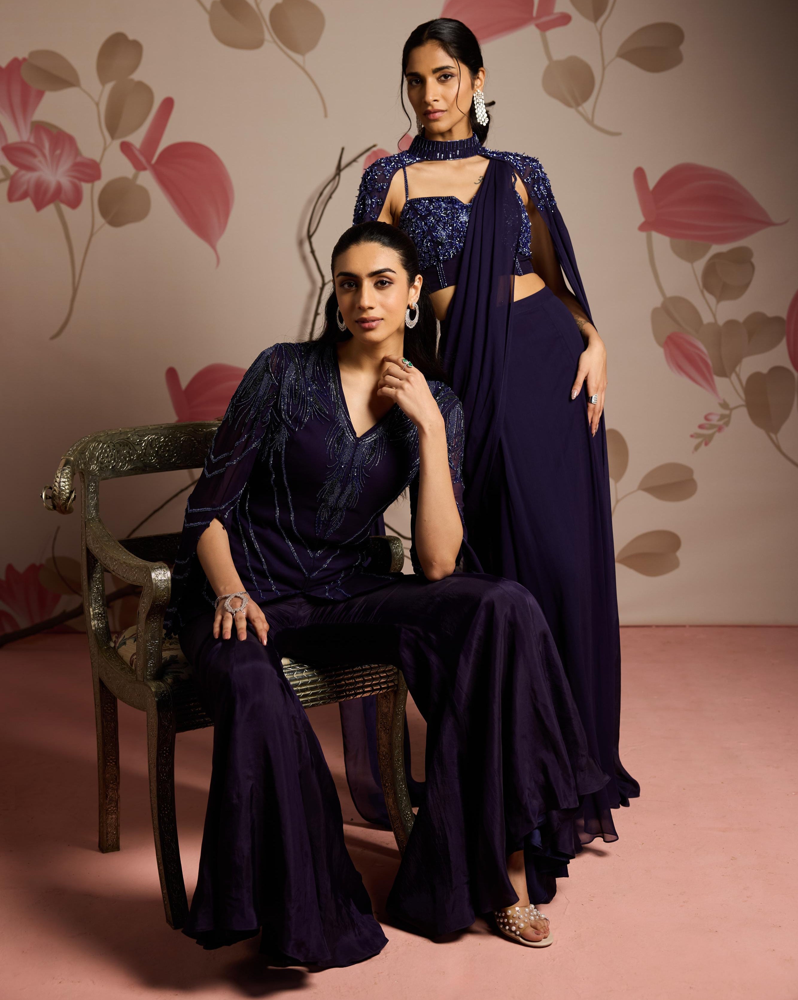 The Blue Lavender Under Bloom Concept Saree with Cape is a contemporary and elegant fusion of traditional saree styling and modern sophistication. Featuring a soothing blue lavender hue, this saree is adorned with delicate floral details that evoke the tranquility and beauty of blooming flowers. The unique cape addition adds a touch of drama and elegance, creating a fluid, modern silhouette. Perfect for weddings, festive events, or special celebrations, this saree offers both comfort and style, while its nature-inspired design brings a refreshing twist to classic femininity. A beautiful choice for those who appreciate bold yet graceful fashion.