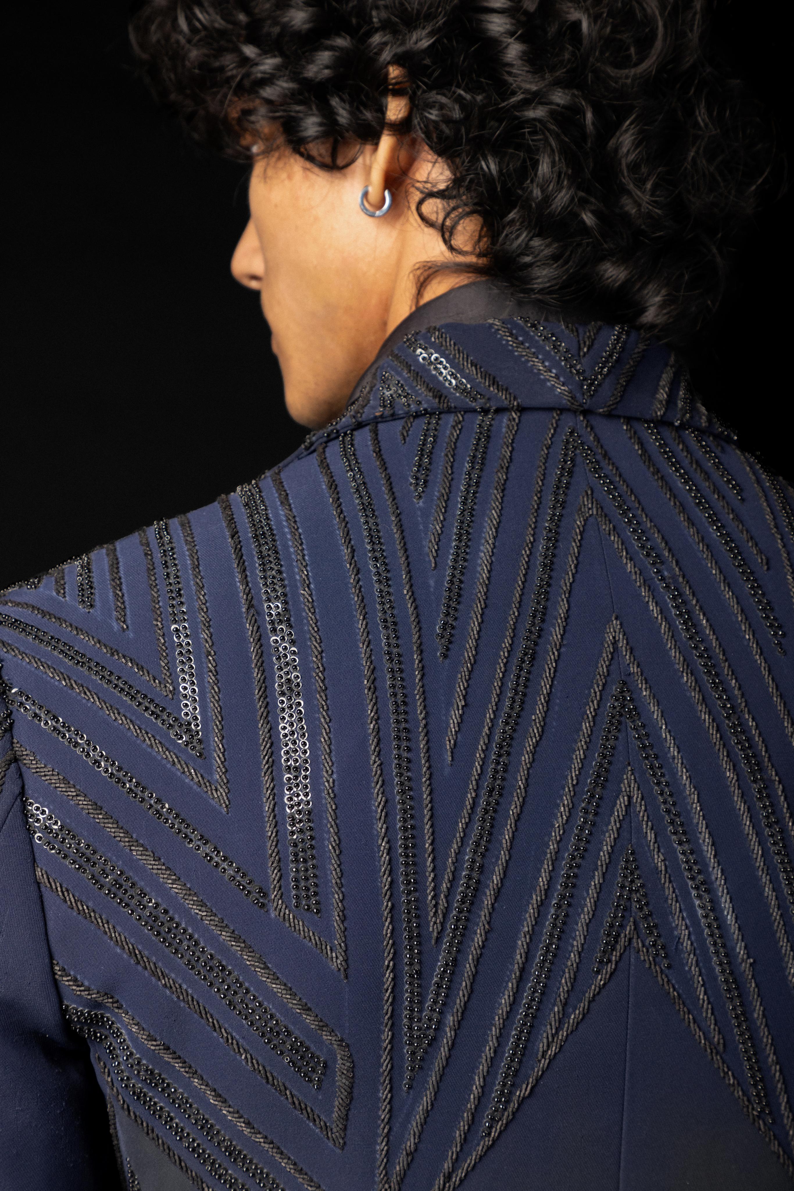 Exude modern sophistication with the Blue Linear Tuxedo, a refined combination of bold color and sleek design. Featuring a striking blue hue with subtle linear detailing, this tuxedo offers a fresh take on classic formalwear. Paired with perfectly tailored black trousers, it creates a sharp, polished look suitable for any upscale occasion. Whether you're attending a wedding, gala, or black-tie event, the Blue Linear Tuxedo delivers a timeless yet contemporary style, ensuring you stand out with confidence and elegance.