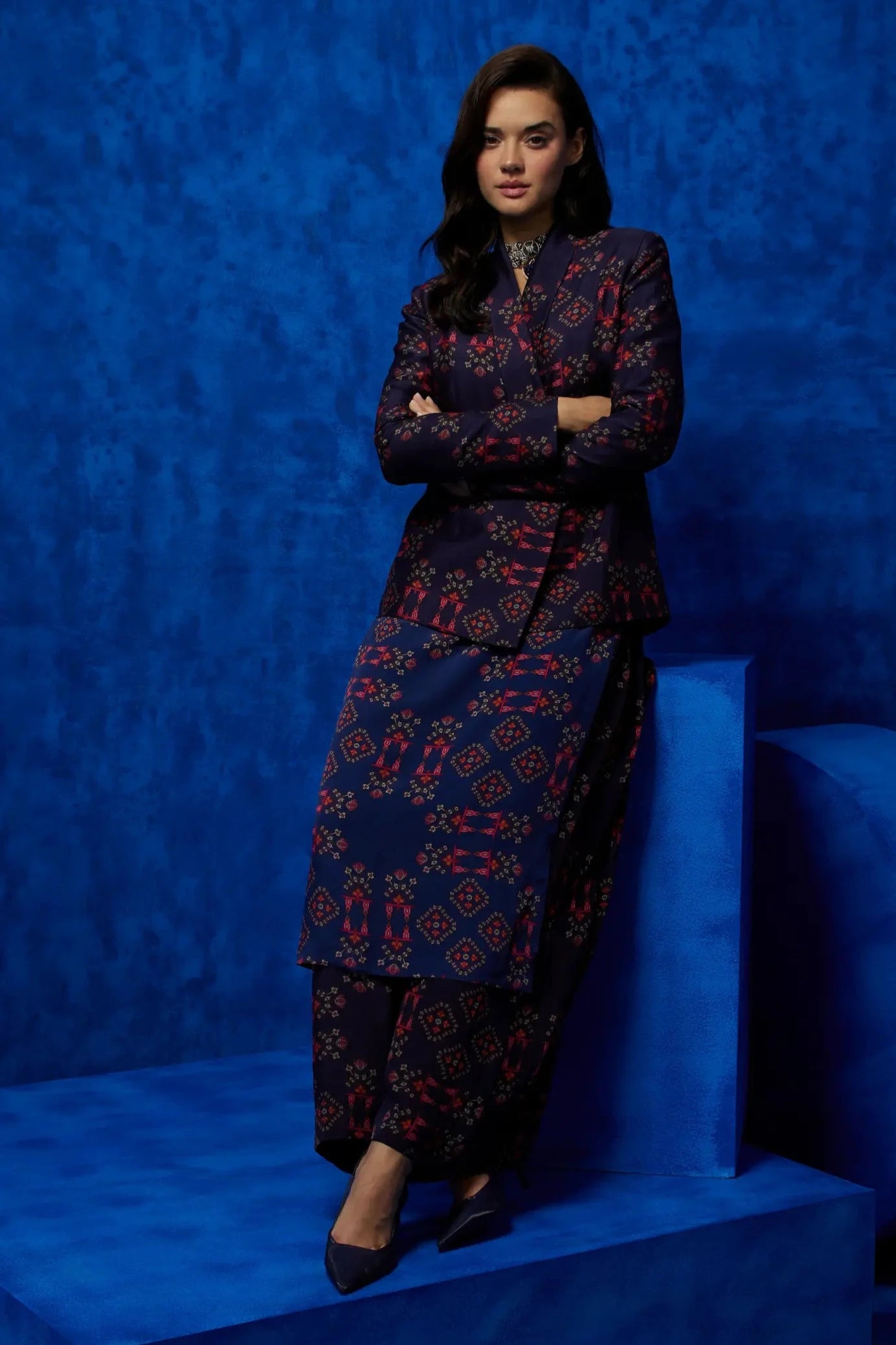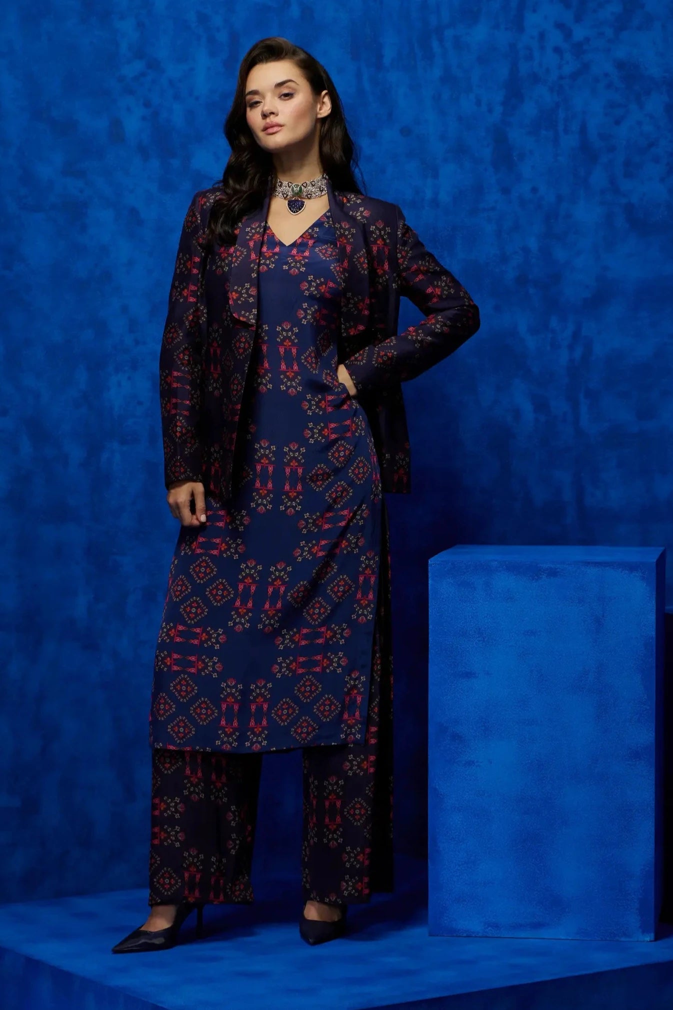 Chic and contemporary, this blue long tunic with pleated trouser and blazer set is the perfect balance of style and sophistication. The long tunic offers a flattering, relaxed silhouette, while the pleated trousers add a touch of refinement and movement. Paired with a tailored blazer, this ensemble is ideal for office wear, formal gatherings, or smart-casual events. Effortlessly stylish and versatile, itÕs a must-have for a polished, modern look.