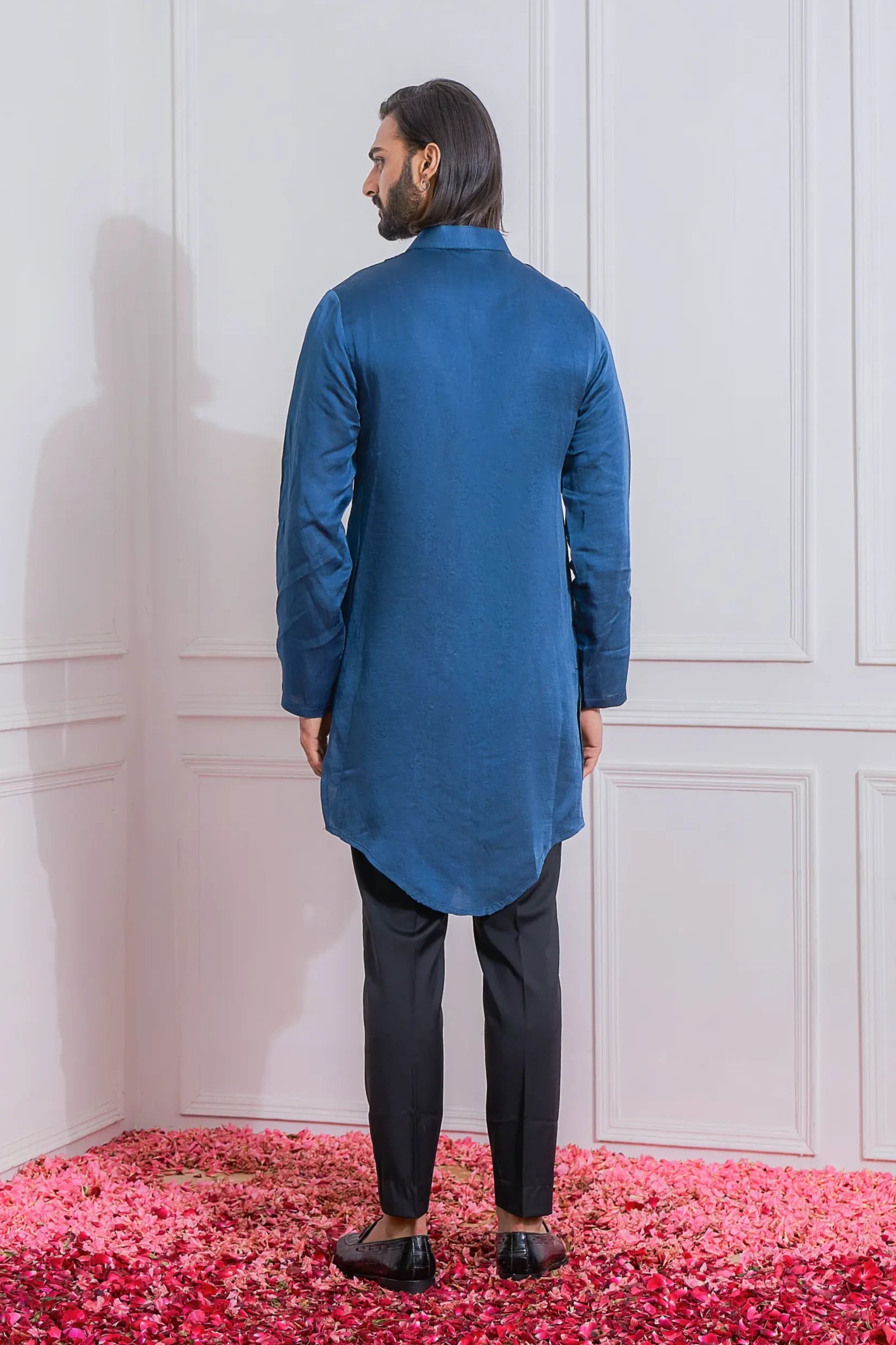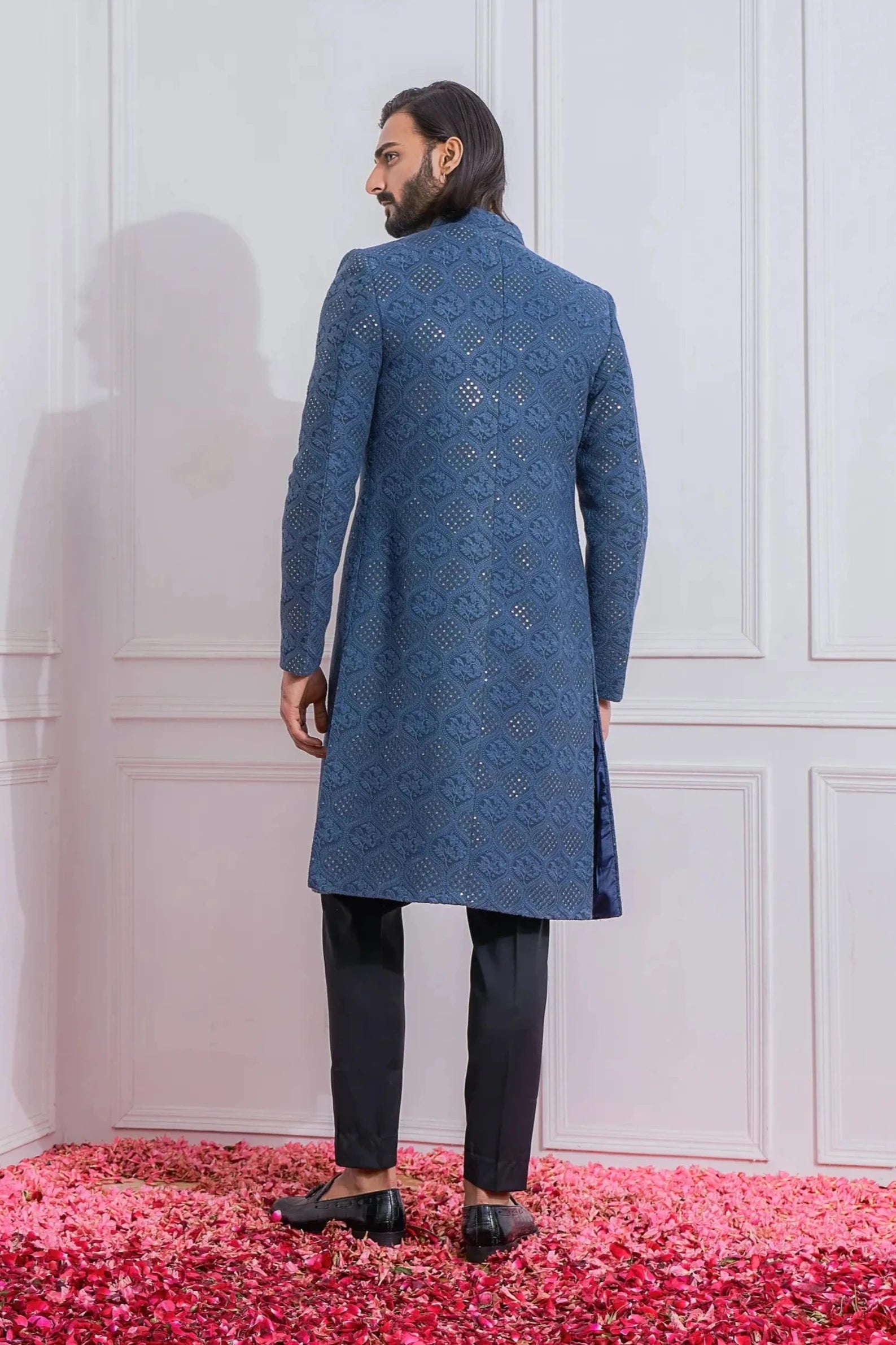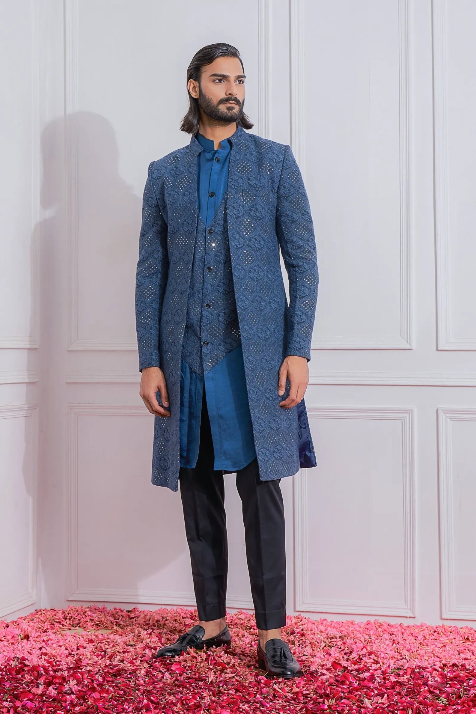 Introducing the Blue Mansehra Indo Set, a captivating fusion of traditional craftsmanship and contemporary style. This elegantly designed ensemble features a stylish kurta paired with a coordinating jacket, crafted from high-quality fabric to ensure both comfort and sophistication. The striking blue hue adds a bold and vibrant touch, making it perfect for weddings, festive occasions, and special gatherings.