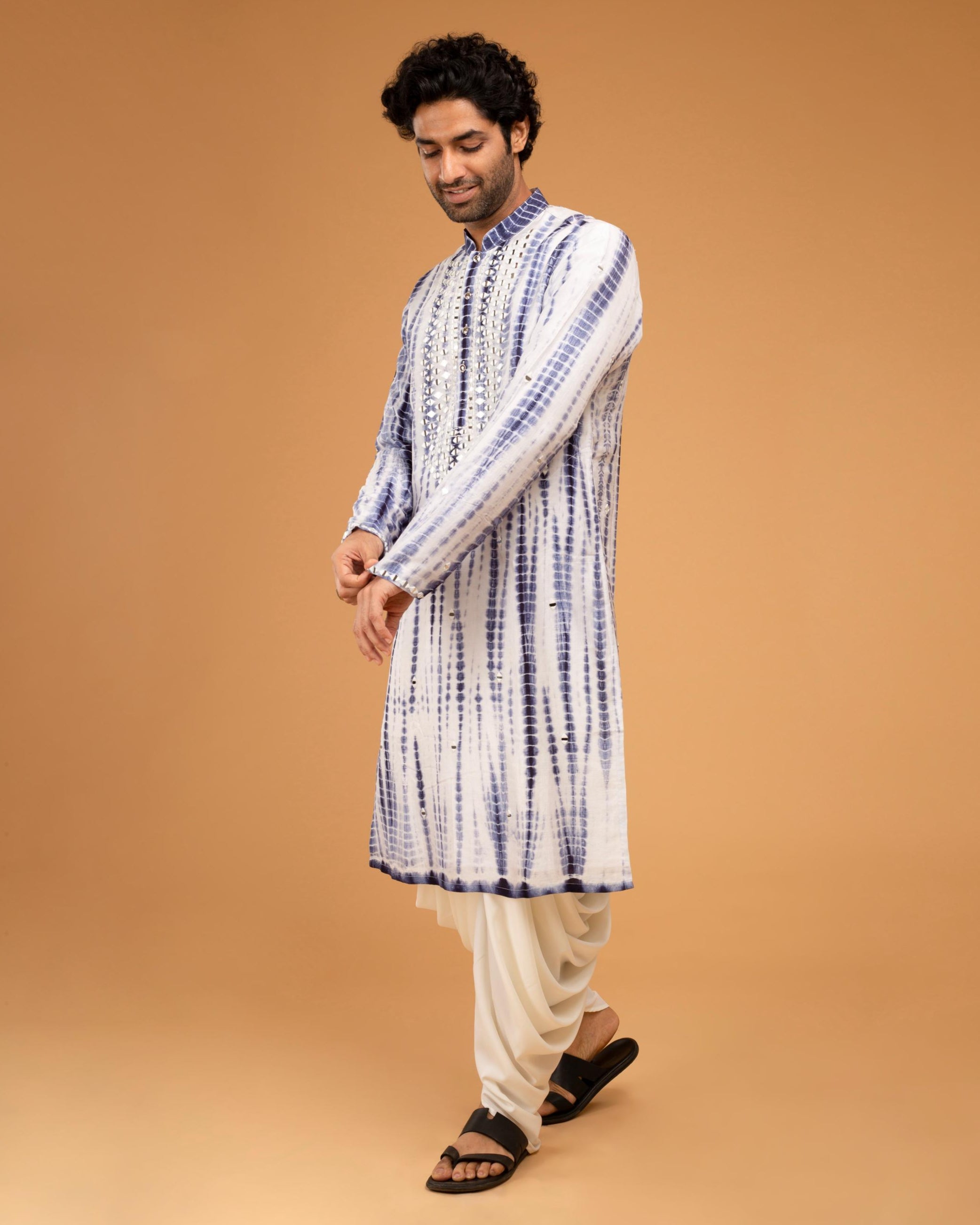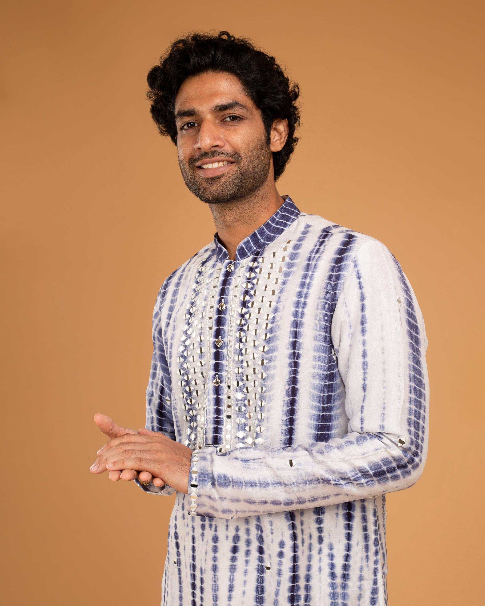 Striking and celebratory, the Blue Mirror Kurta Set is designed to command attention with refined sparkle. Crafted in a rich blue hue, the kurta is adorned with intricate mirror work that reflects light beautifully, adding movement and dimension. Paired with coordinated bottoms, this set is ideal for sangeet nights, festive gatherings, or wedding celebrations where tradition meets bold styling. The Blue Mirror Kurta Set is perfect for the modern man who isn’t afraid to shine while keeping cultural roots intact.