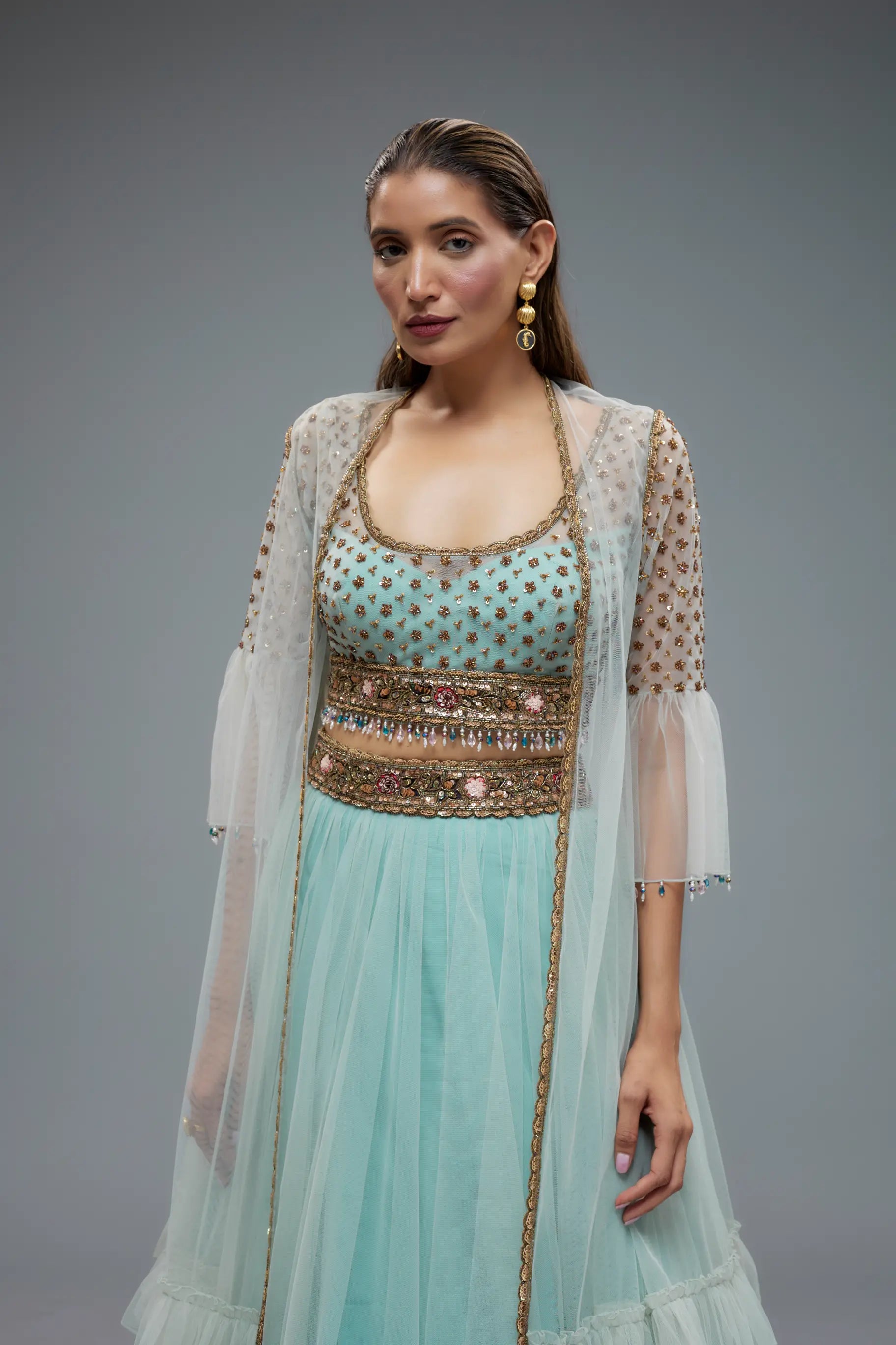 Step into a world of luxury and sophistication with the Blue Net Jacket Lehenga a stunning ensemble that fuses modern fashion with traditional charm. The flowing blue net lehenga is paired with a stylish net jacket offering a unique and fashionable twist to the classic lehenga design. Perfect for weddings receptions or festive celebrations this lehenga set ensures you make a memorable statement wherever you go.