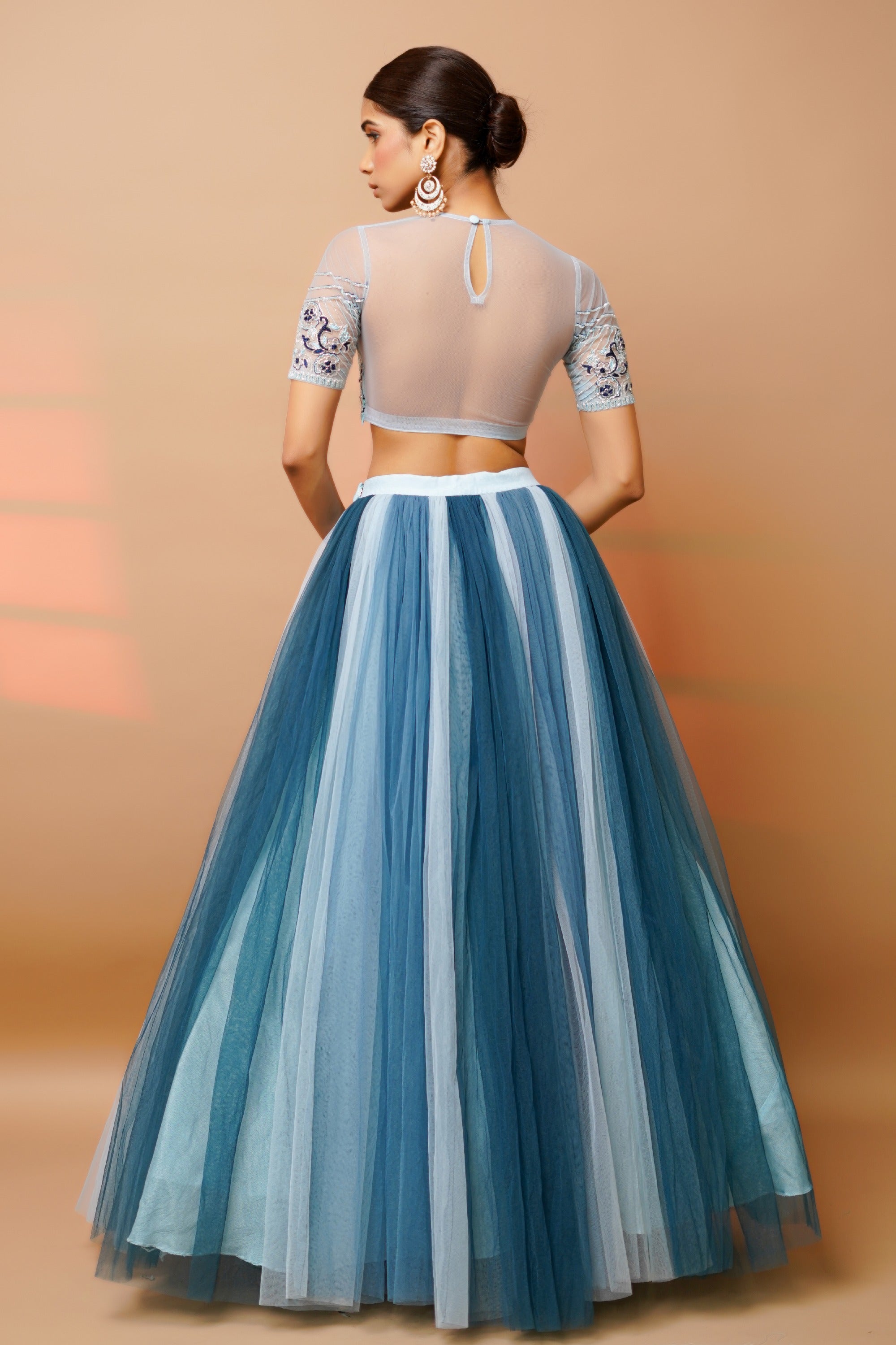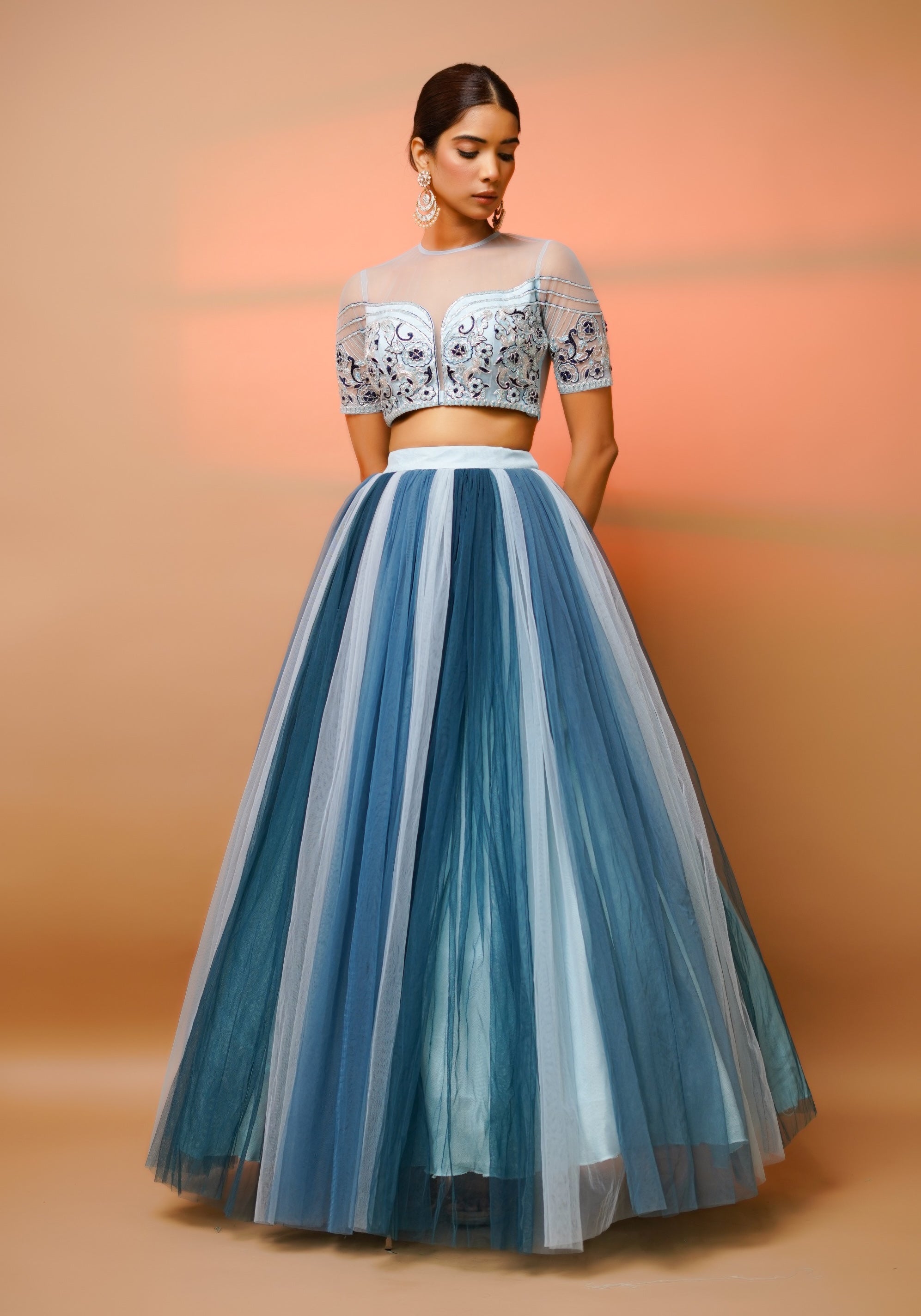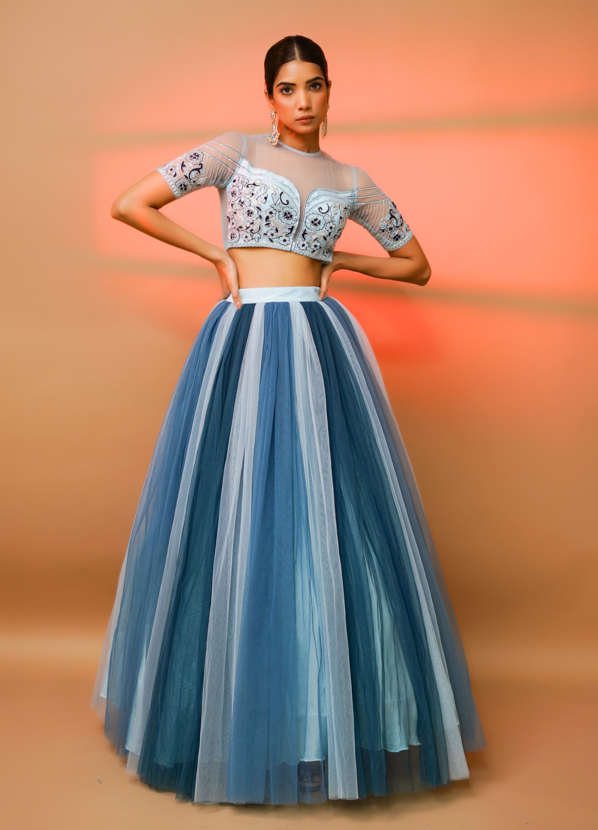 Elevate your wardrobe with this enchanting set, featuring a semi-transparent padded blouse adorned with exquisite floral embellishments. The handwork is meticulously crafted with resham, cutdana, naksi, and zari, adding a touch of intricate elegance. Paired with a net, multi-layered, tiered, and gathered high-waist skirt, this ensemble offers a dramatic yet refined silhouette. The skirt is lined for comfort and includes a cancan attachment for voluminous flair. Perfect for making a statement at upscale events or special occasions, this set combines timeless craftsmanship with modern sophistication.