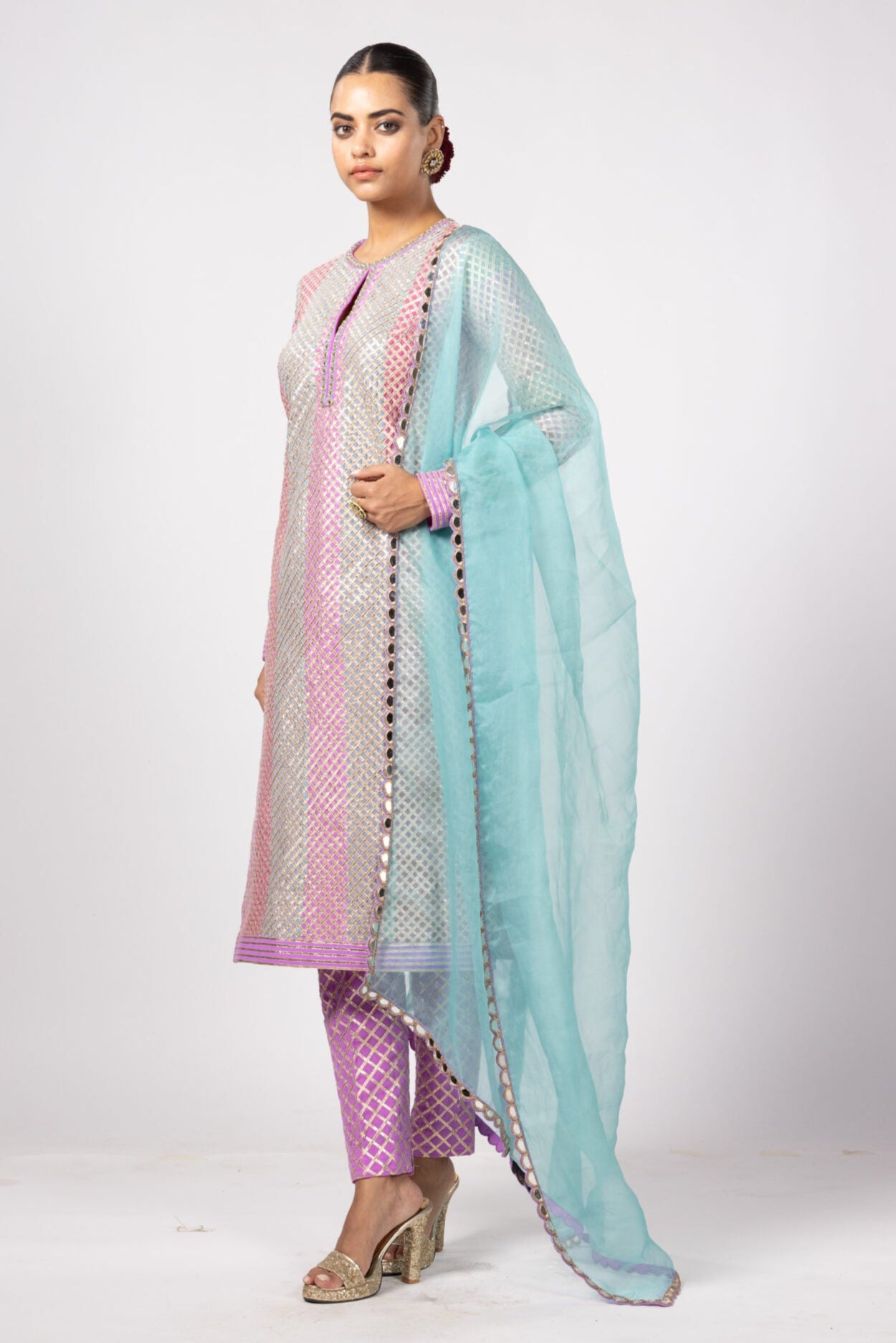 Elegant and easy to wear, the Blue Noorani Kurta with Pant is a versatile choice for festive occasions and intimate gatherings. The kurta, crafted in a rich blue hue, features subtle multicolor embroidery that adds a refined artisanal touch. Paired with tailored pants for a streamlined silhouette, this ensemble blends comfort with understated sophistication. Ideal for mehendi events, family functions, or pre-wedding festivities, it’s designed for the woman who values timeless tradition with modern sensibility.