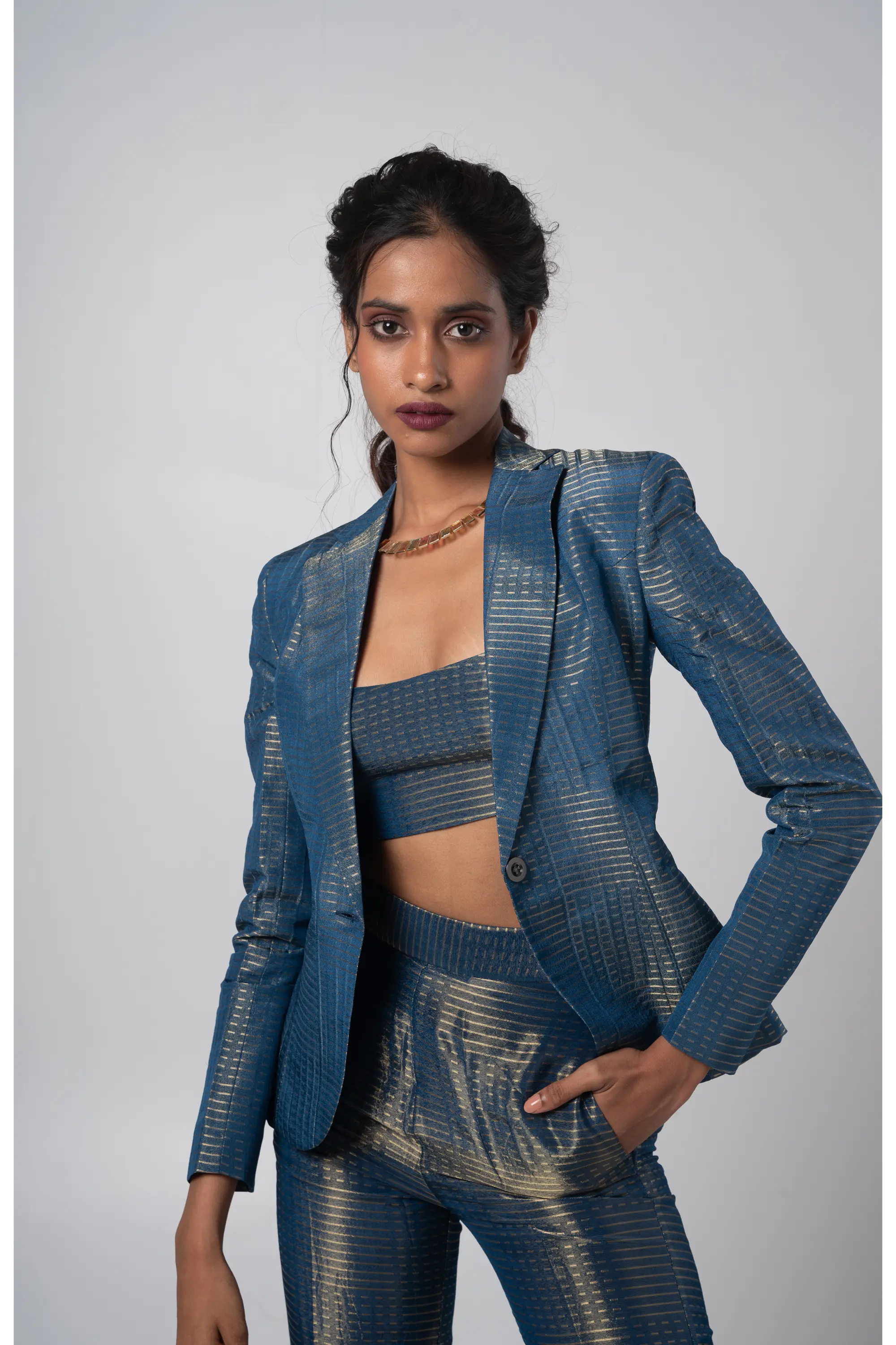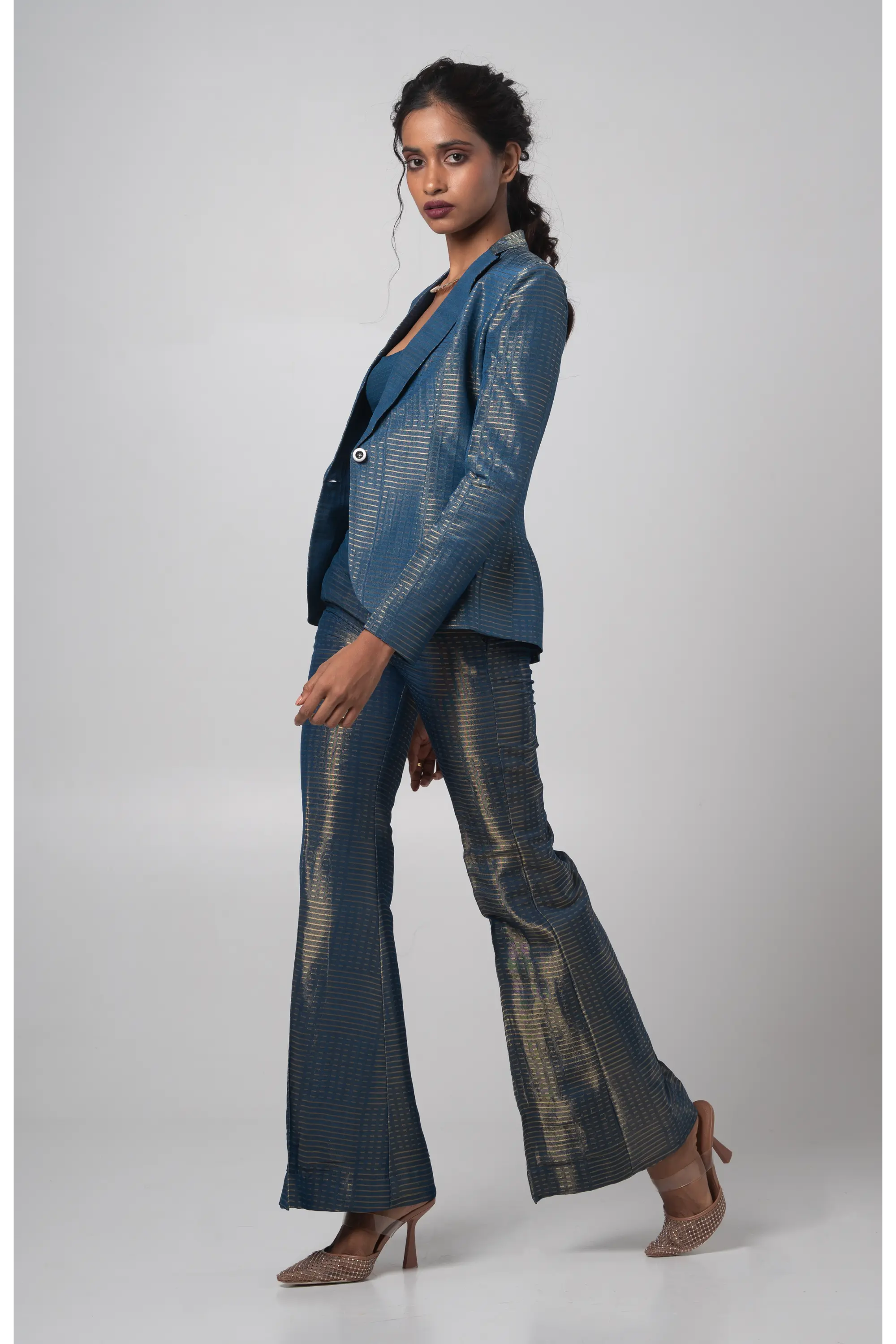 This stunning 3-piece set offers an exquisite combination of contemporary style and traditional craftsmanship. The ensemble includes a fully lined, form-fitting bustier, designed to enhance the figure with a sleek, flattering silhouette. Paired with flared trousers that offer both comfort and elegance, the trousers create a bold, flowing look that balances the fitted top. The structured blazer, crafted from a luxurious blend of Organza and Zari, adds an elevated, refined touch with its sophisticated weave and subtle shimmer. Ideal for high-fashion events, evening gatherings, or upscale occasions, this set exudes timeless elegance with a modern twist.