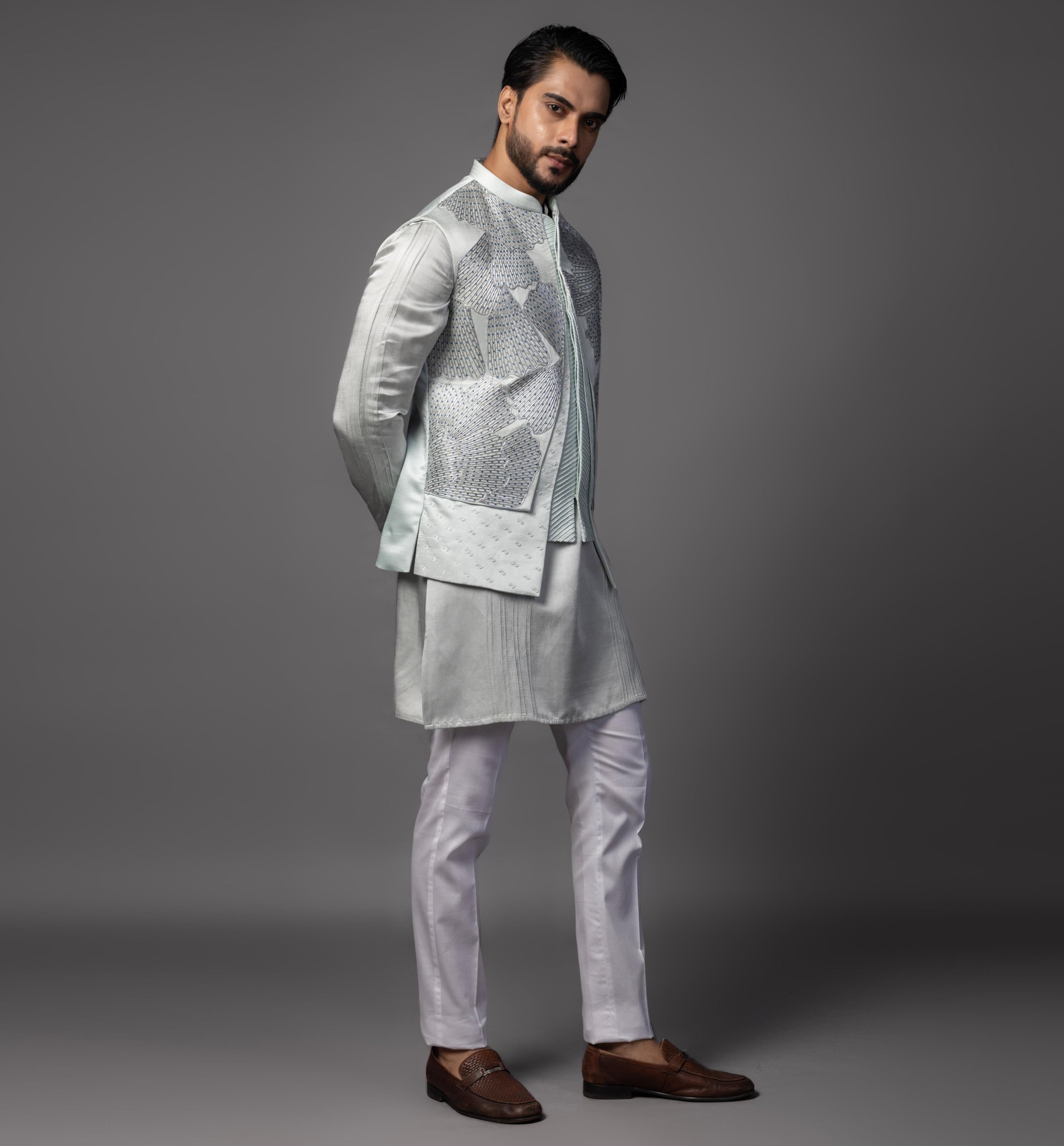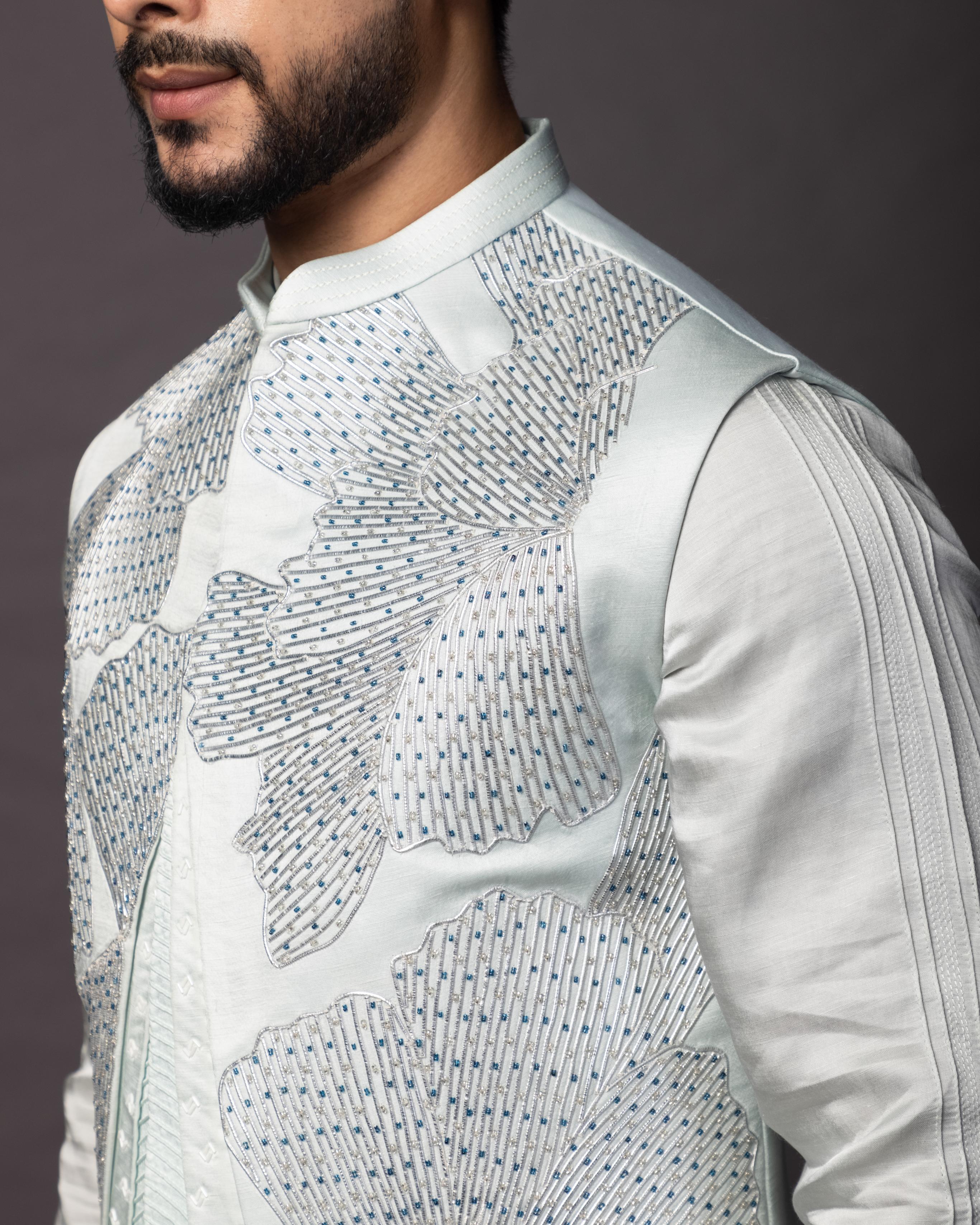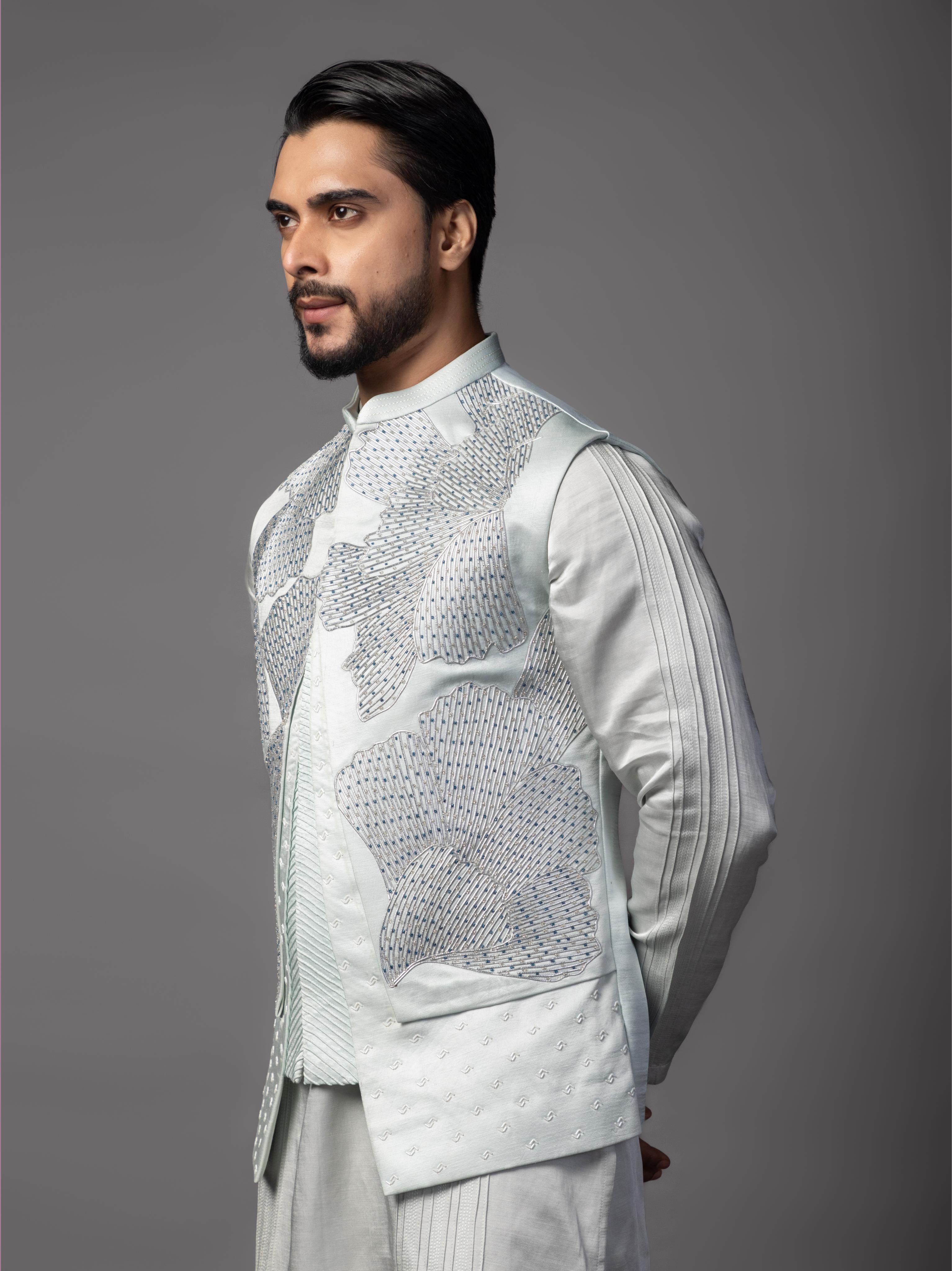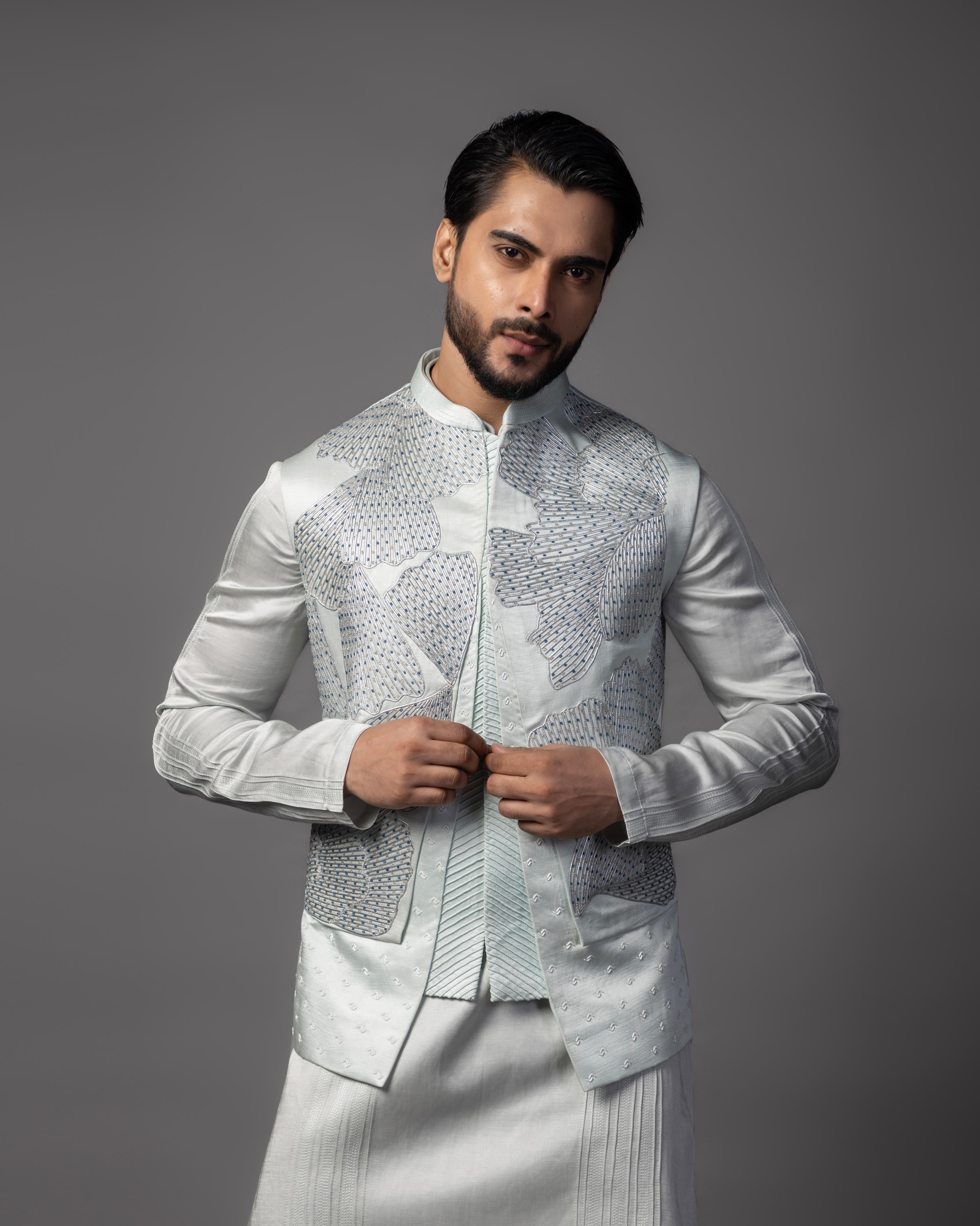Unveil sophisticated style with the Blue Petals Nehru Jacket, paired seamlessly with a classic kurta and pajama set. The jacket features intricate petal-shaped embroidery in a soothing blue hue, blending floral artistry with the regal charm of the Nehru style. This elegant ensemble offers a contemporary twist on traditional attire, perfect for weddings, festive celebrations, or formal gatherings. The comfortable kurta and pajama complete the look, offering both style and comfort. With its vibrant blue color and delicate floral design, this outfit is the epitome of refined sophistication and timeless appeal.