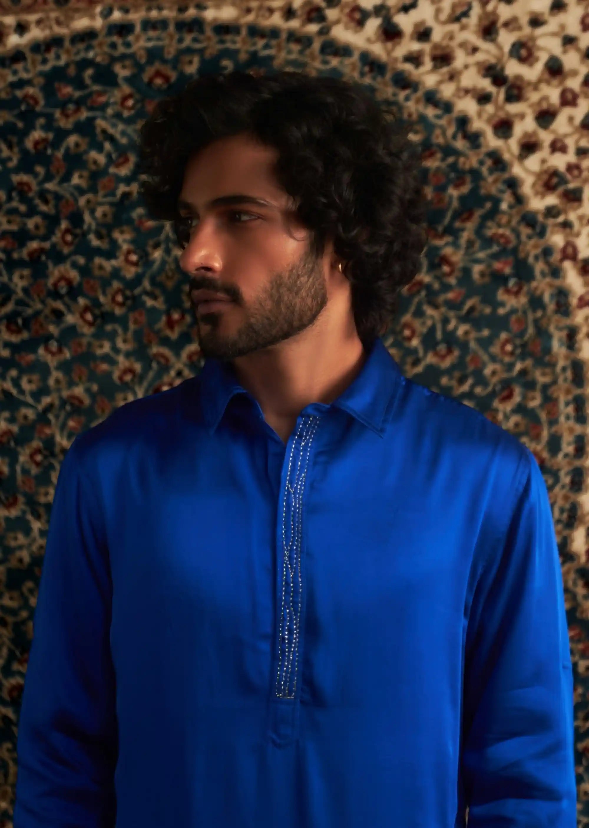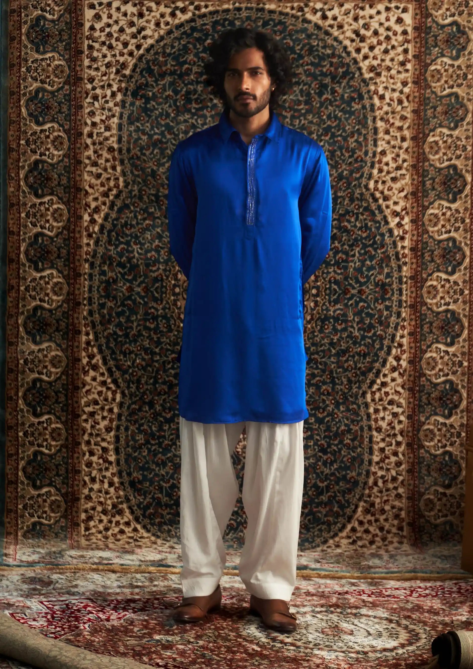 Elevate your style with our versatile blue Pathani kurta set, featuring subtle embroidery on the placket for a touch of sophistication. Paired with a classic white salwar, this outfit is ideal for mehendi, festive occasions, or casual gatherings. Effortlessly stylish and comfortable, it’s a must-have addition to your wardrobe, ensuring you make a statement with ease at every event. Embrace tradition with a modern twist!