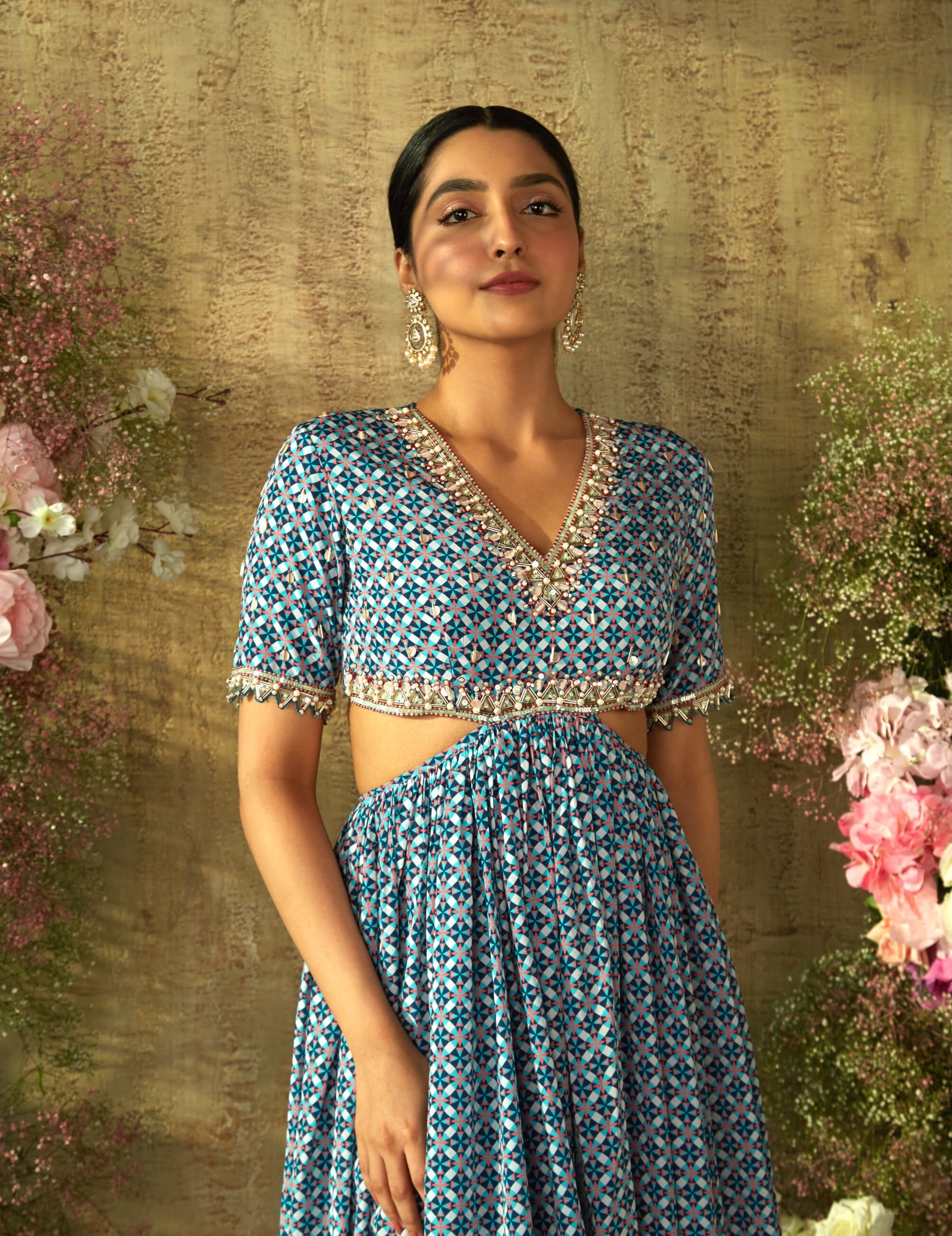 Elevate your style with our striking blue printed ensemble, featuring a chic cutout dress adorned with intricate patterns and a flattering center slit, paired perfectly with flowing flared pants. This outfit seamlessly blends sophistication with a touch of playful elegance, making it ideal for any special occasion where you want to make a statement.