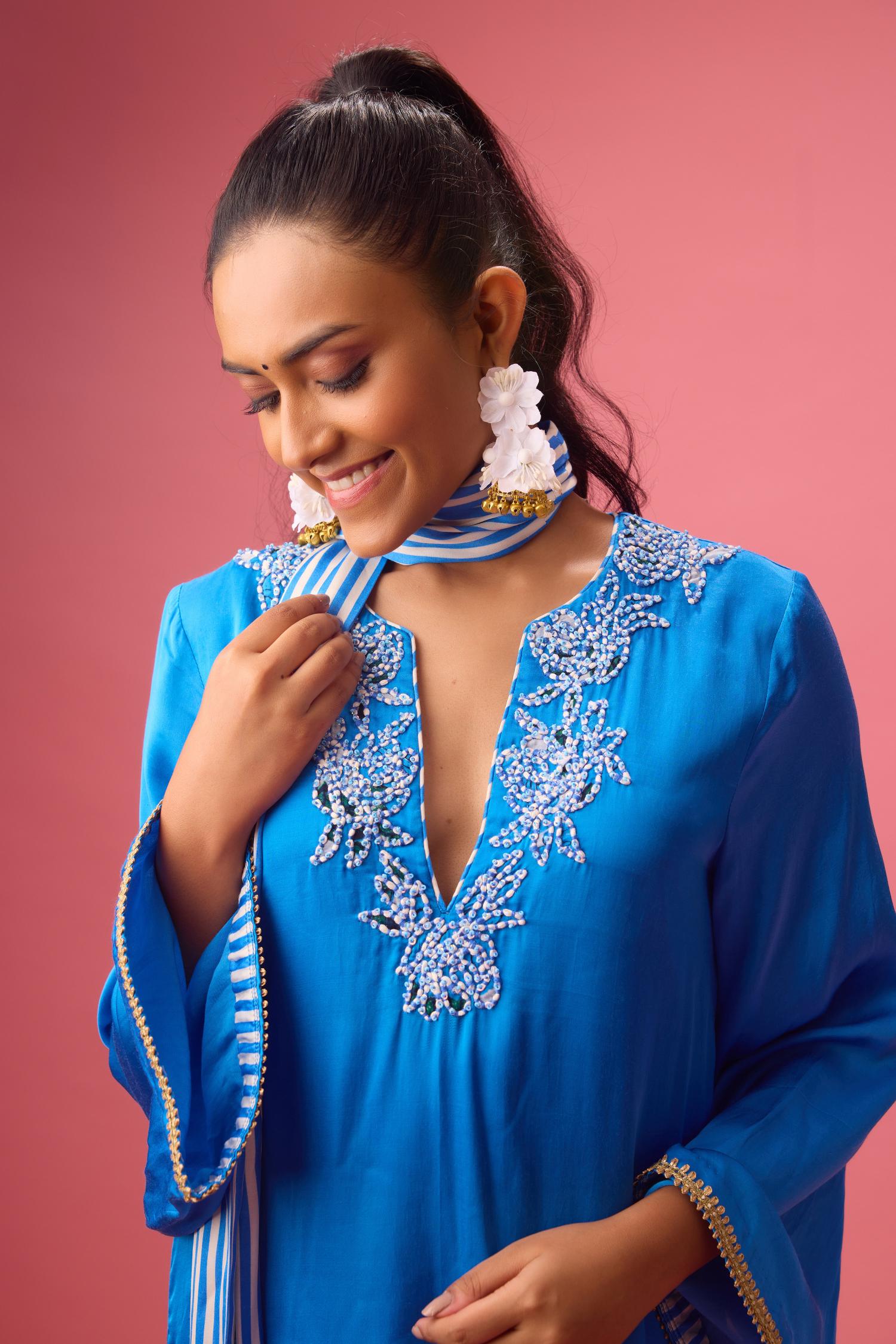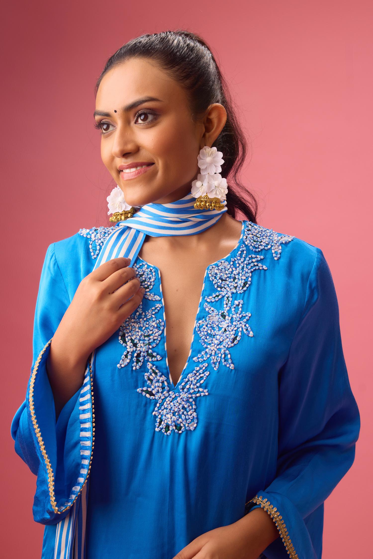 Blue printed handwork kurta with churidar paired with skinny scarf