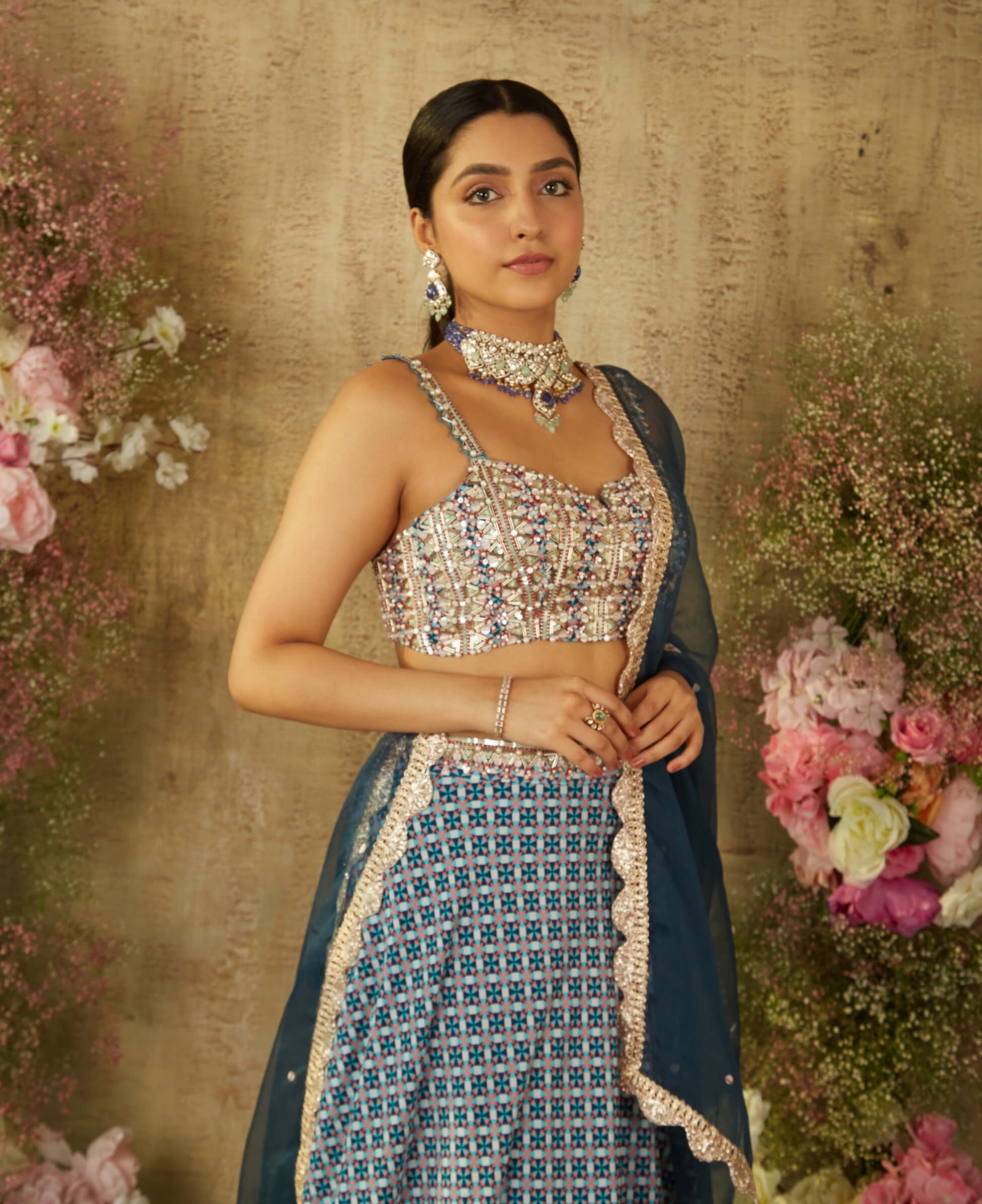 Featuring a printed blue lehenga adorned with a fully embroidered bustier and complemented by an ethereal organza dupatta, this ensemble exemplifies a harmonious blend of traditional charm and contemporary elegance. The intricate embroidery on the bustier adds a touch of opulence, enhancing the ensemble's overall grace and making it an ideal choice for weddings and celebratory occasions. The combination of vibrant print and delicate craftsmanship ensures a timeless appeal, capturing the essence of cultural richness with a modern twist.