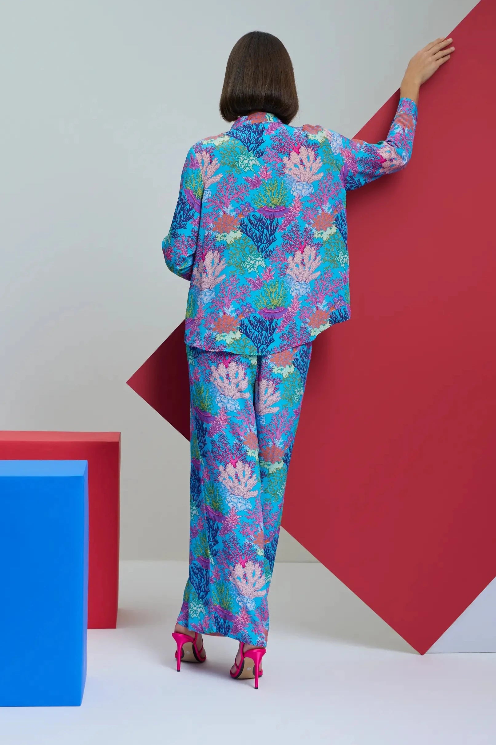 Make a bold statement with this blue printed oversize shirt with pants. Featuring a striking print and a relaxed, oversized fit, the shirt offers comfort and style, while the matching pants complete the look with effortless flair. Perfect for casual outings or relaxed gatherings, this versatile set blends modern design with a laid-back vibe, adding a pop of color to your wardrobe.