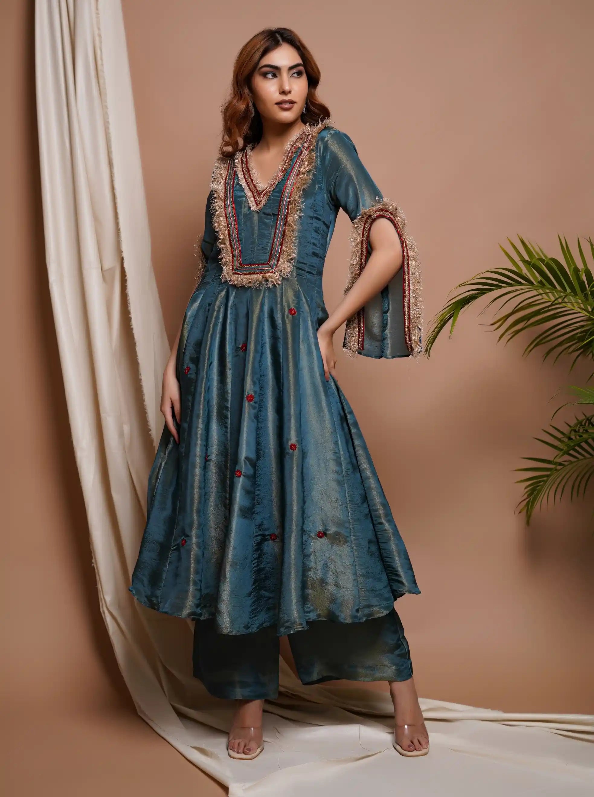 A stunning blue-red tissue silk anarkali suit set that exudes regal charm. The V-neckline is adorned with intricate heavy handwork and lace, while the sleeves are embellished with elaborate motifs. The ensemble includes a contrasting red palazzo and dupatta with lace and sequin details, elevating the outfit to a new level of sophistication.