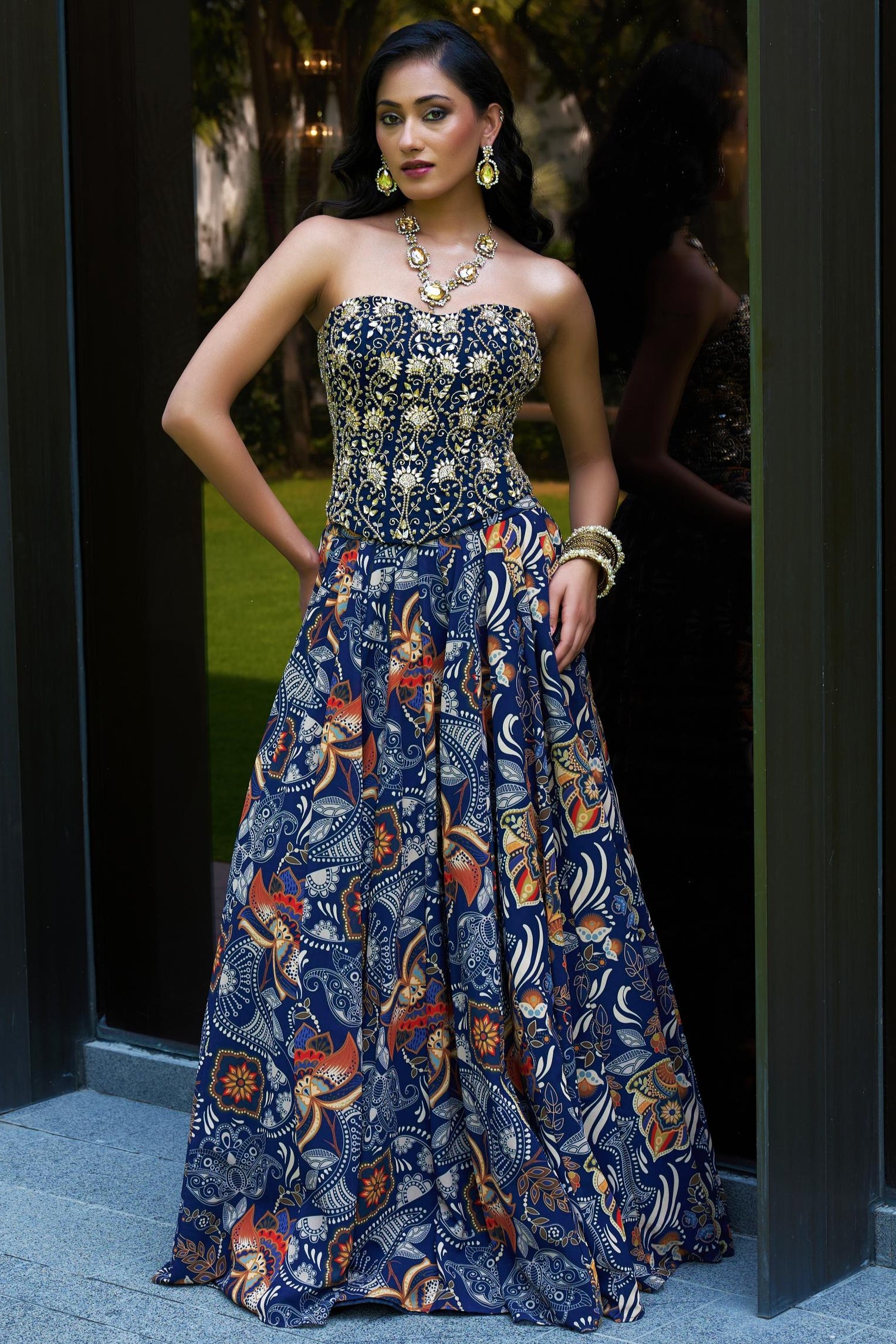 The Blue Shanaya Corset Lehenga Set is a bold and contemporary take on traditional festive wear. Featuring a structured corset blouse paired with a flowy embroidered lehenga, this set is perfect for weddings, receptions, and evening celebrations. The rich blue hue adds depth and drama, while the modern silhouette offers a chic, fashion-forward look. Ideal for those who love to make a statement with elegance and edge.