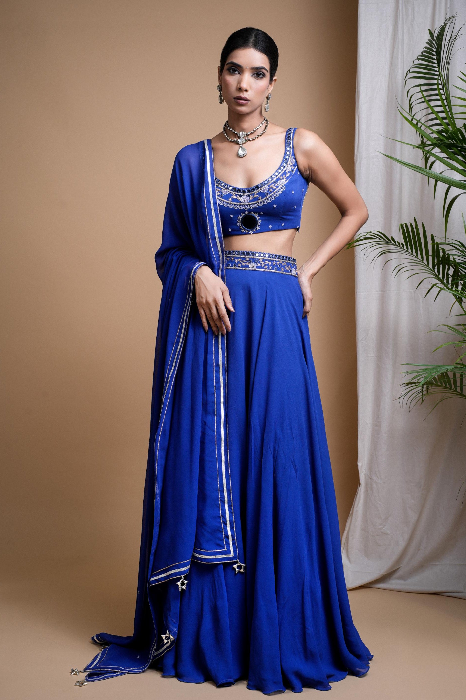 The Blue Sitara Lehenga Set is a statement in modern grace and timeless celebration. Drenched in a serene blue palette, this lehenga features delicate digital prints and a contemporary cut that seamlessly bridges traditional aesthetics with youthful charm. Lightweight and fluid, it’s designed for movement—perfect for twirling through sangeets, wedding soirées, or festive gatherings. Style it with minimal silver jewelry and a sleek braid for a chic, fuss-free ethnic look that speaks volumes.