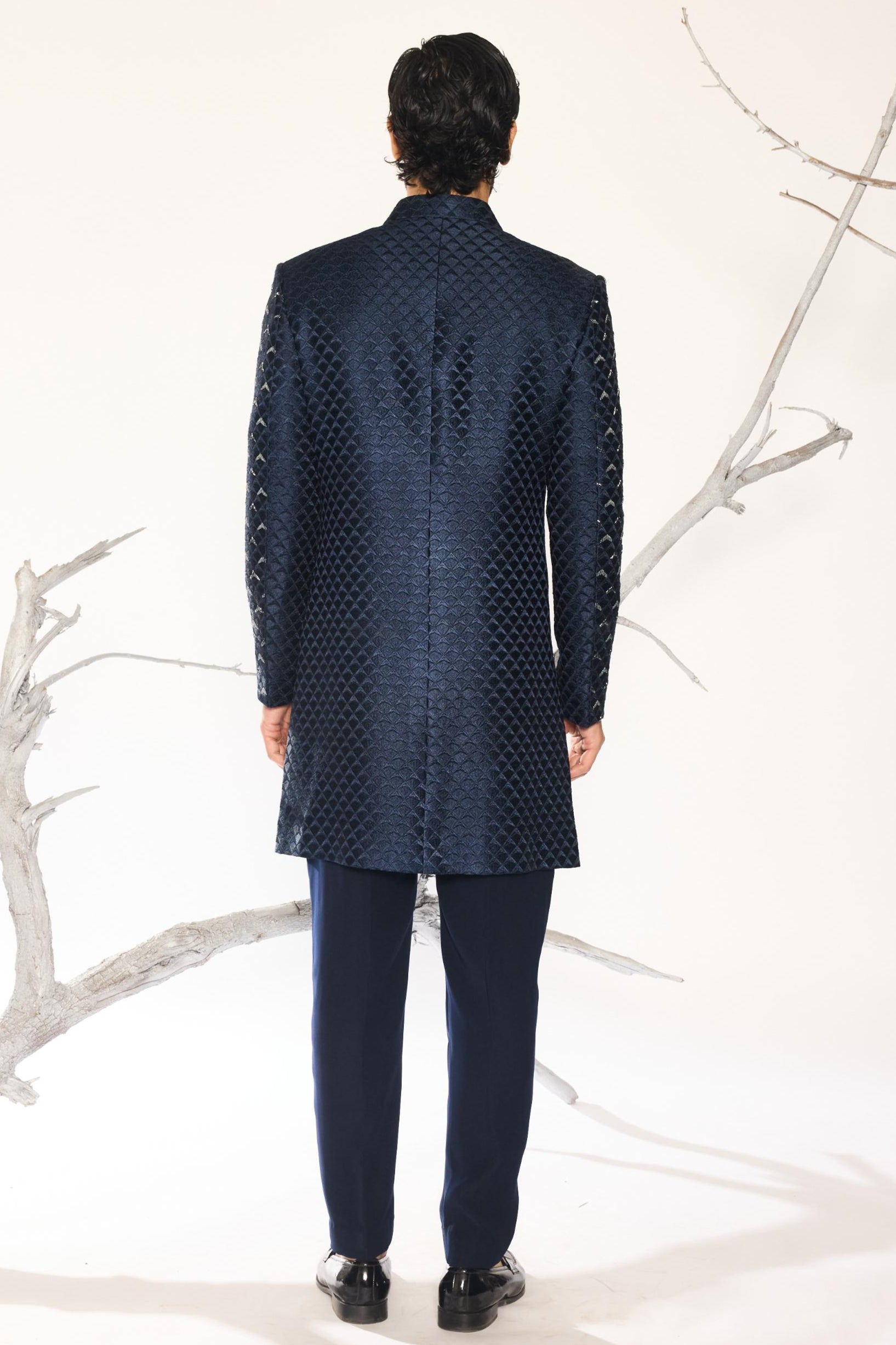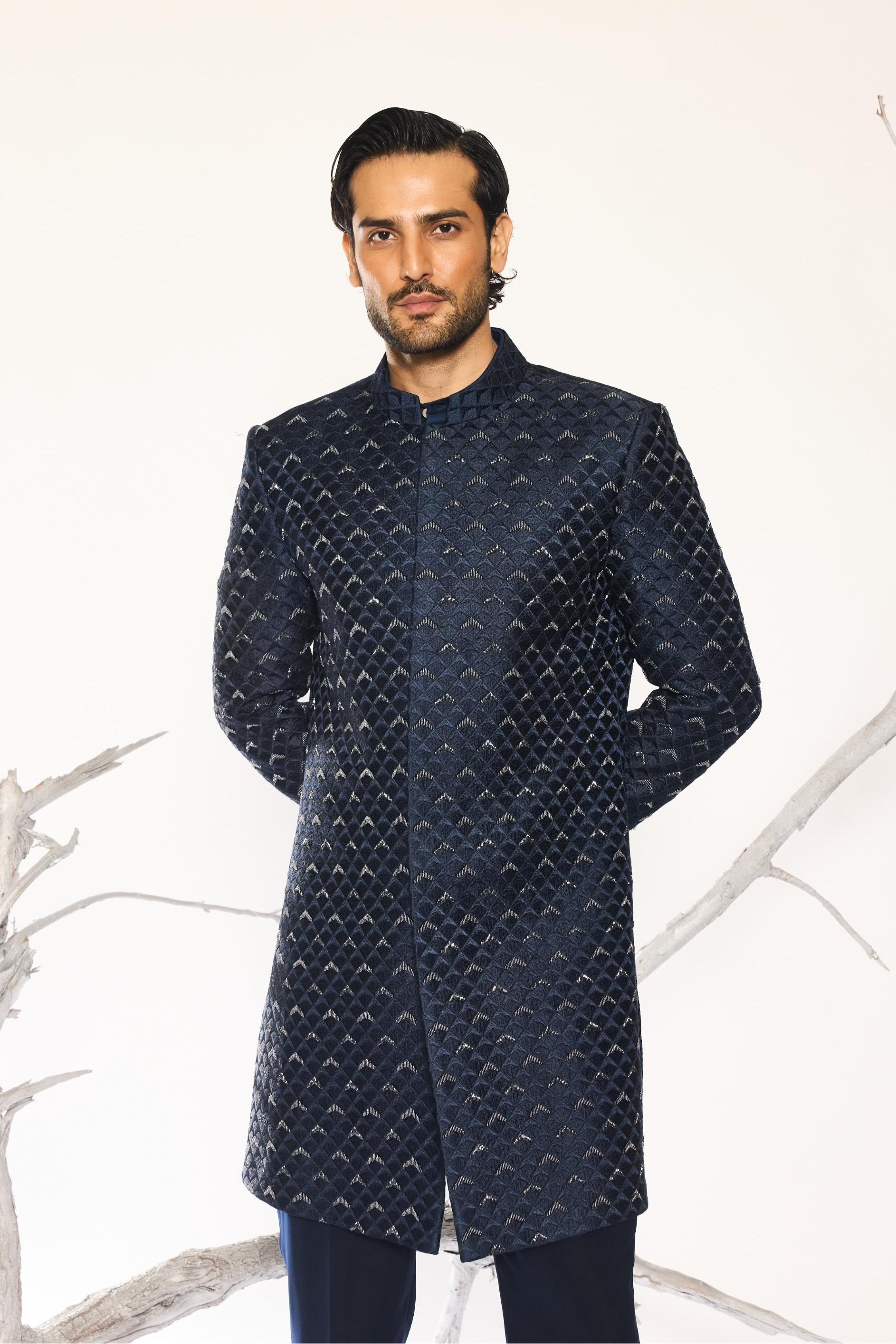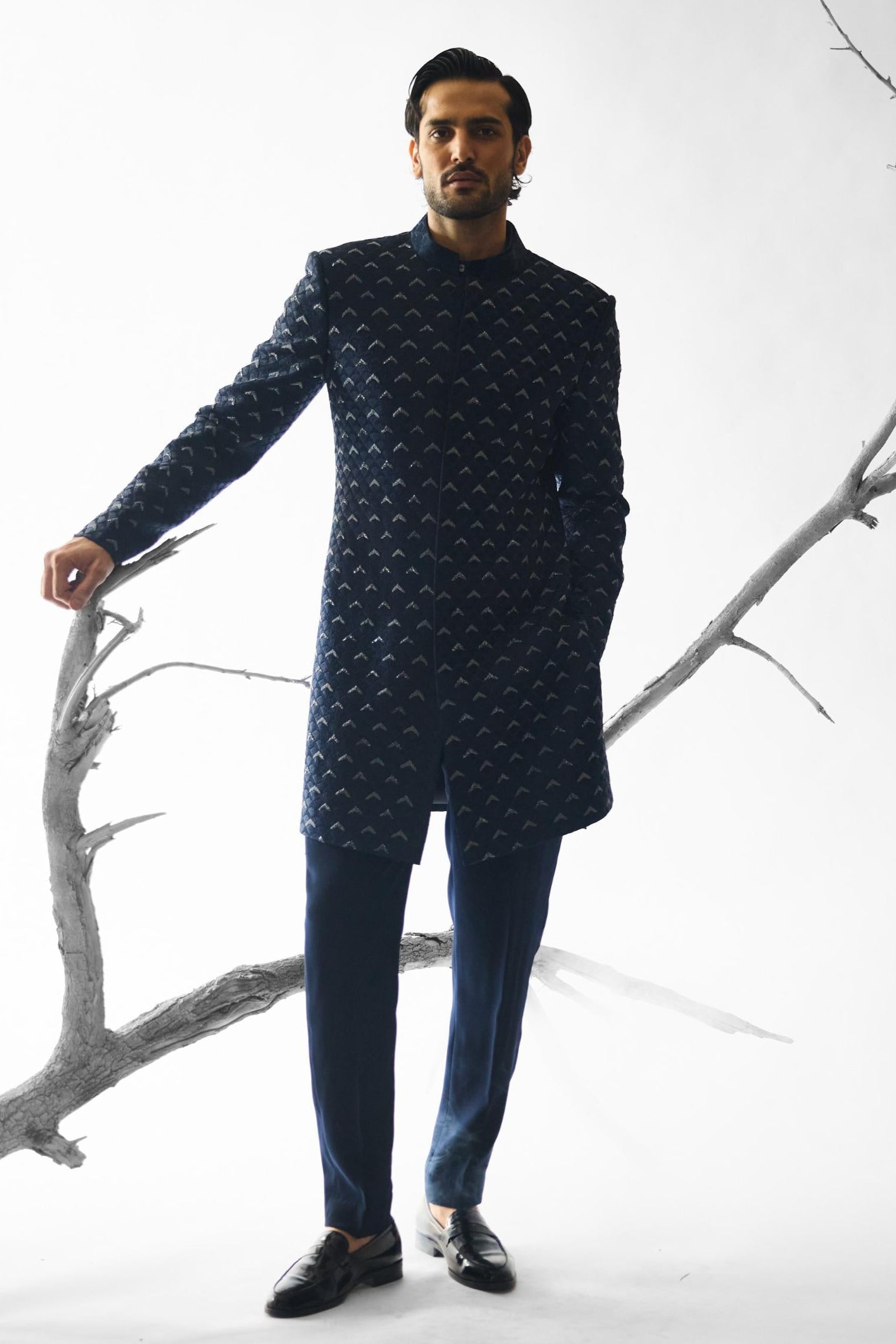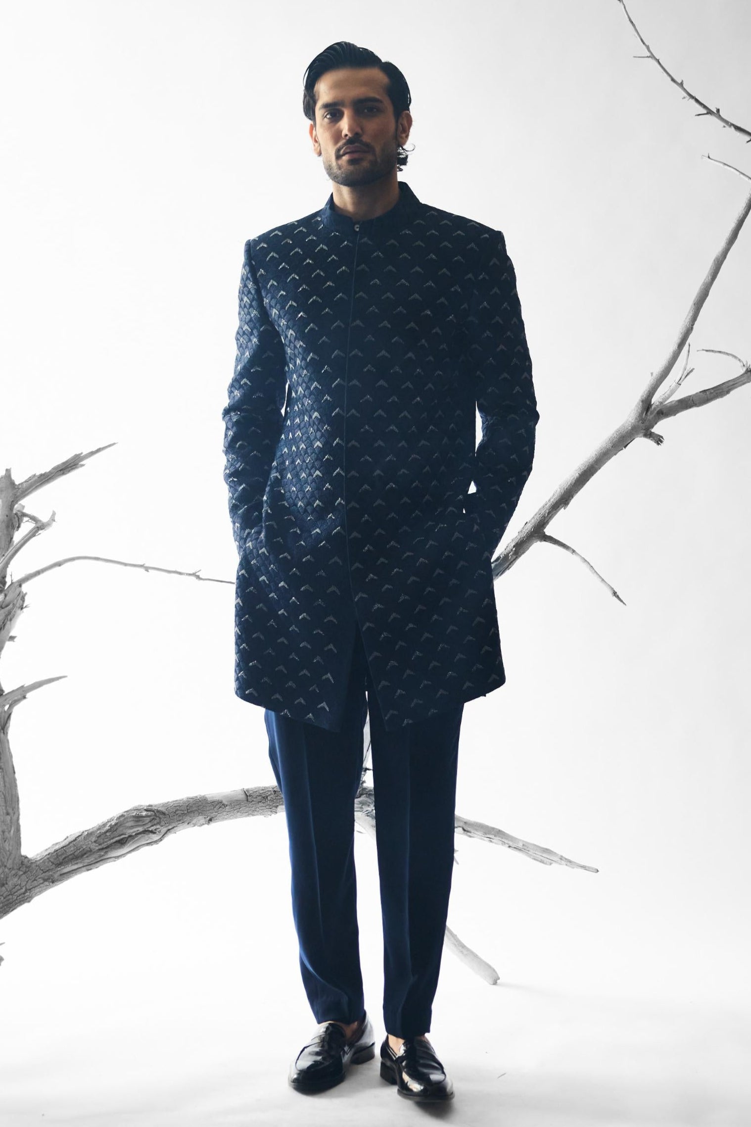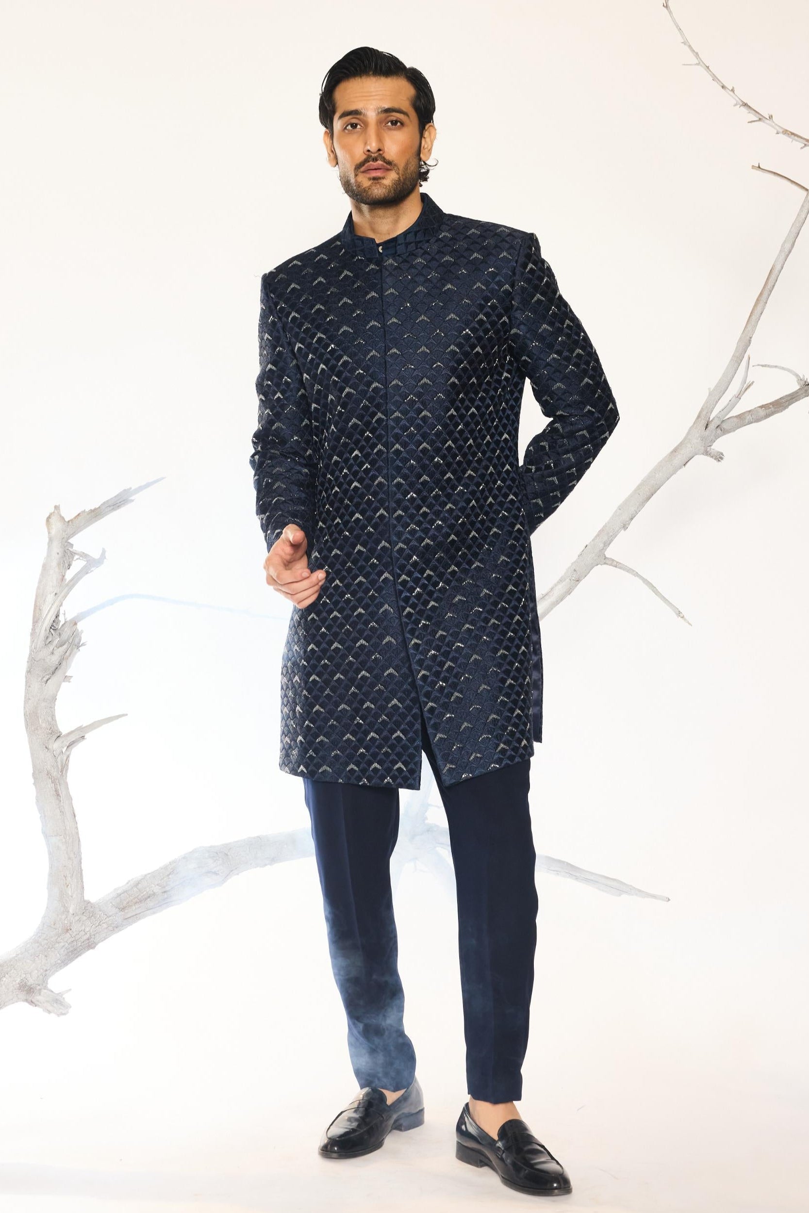 The Blue Stardust Nebula Line Indo blends celestial charm with contemporary Indian tailoring. Rendered in a deep cosmic blue, it features linear detailing reminiscent of starlit constellations, evoking a mood of modern regality. This ensemble is ideal for receptions, sangeets, or formal celebrations where elegance meets edge. Designed for the modern groom or groomsman who dares to be distinct. Style it with metallic loafers or a classic brooch for added flair.
