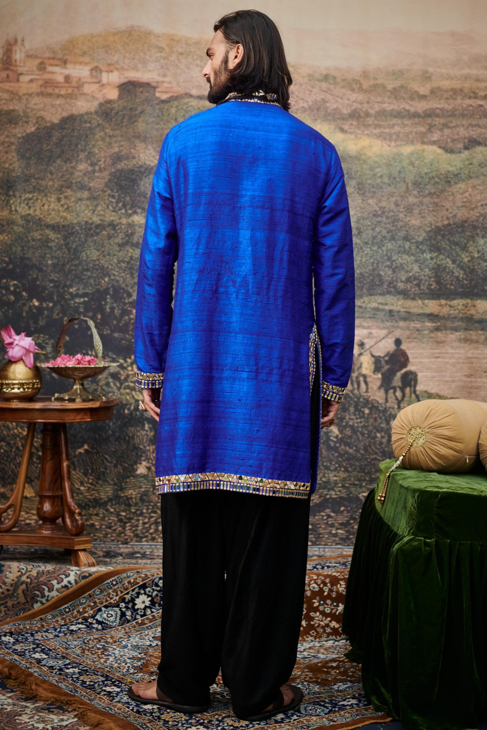 This electric blue raw silk kurta features exquisite mirror work on the neckline and full sleeves offering a sophisticated vibrant look. Paired with a classic black cotton salwar this ensemble strikes a perfect balance between elegance and comfort making it ideal for both festive and casual occasions.