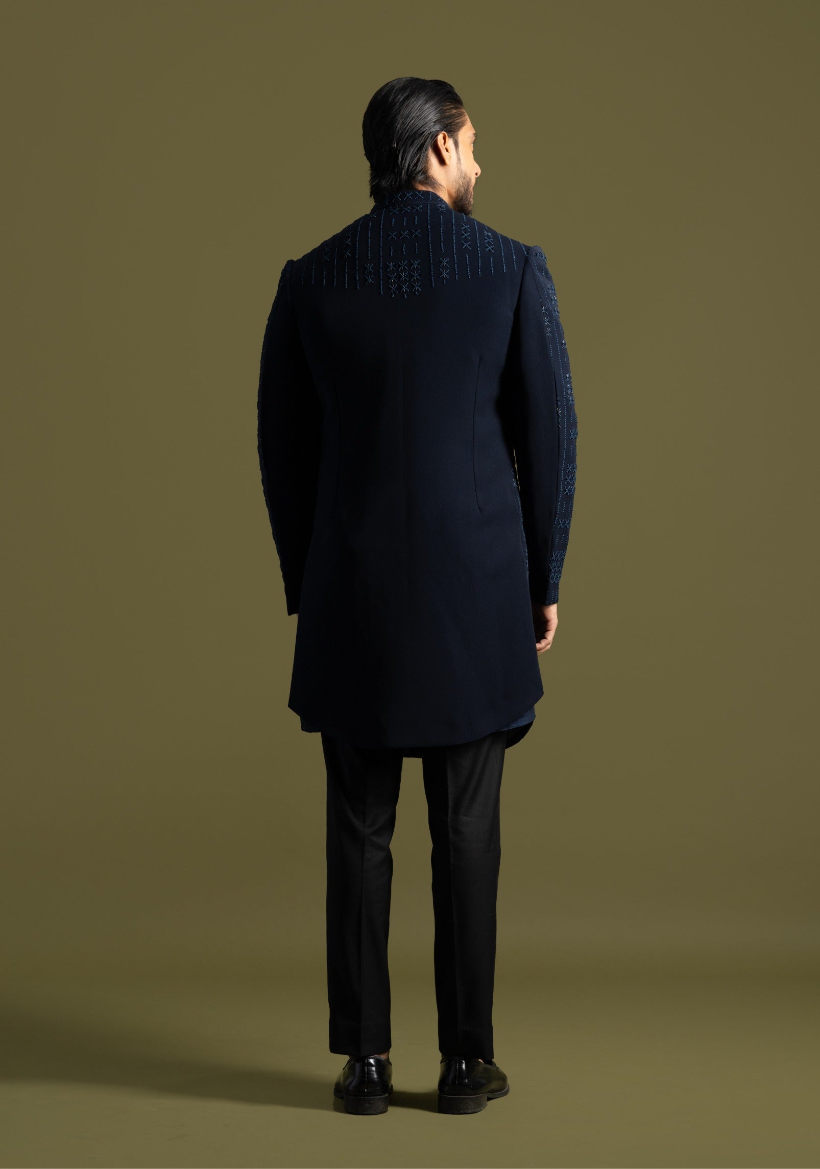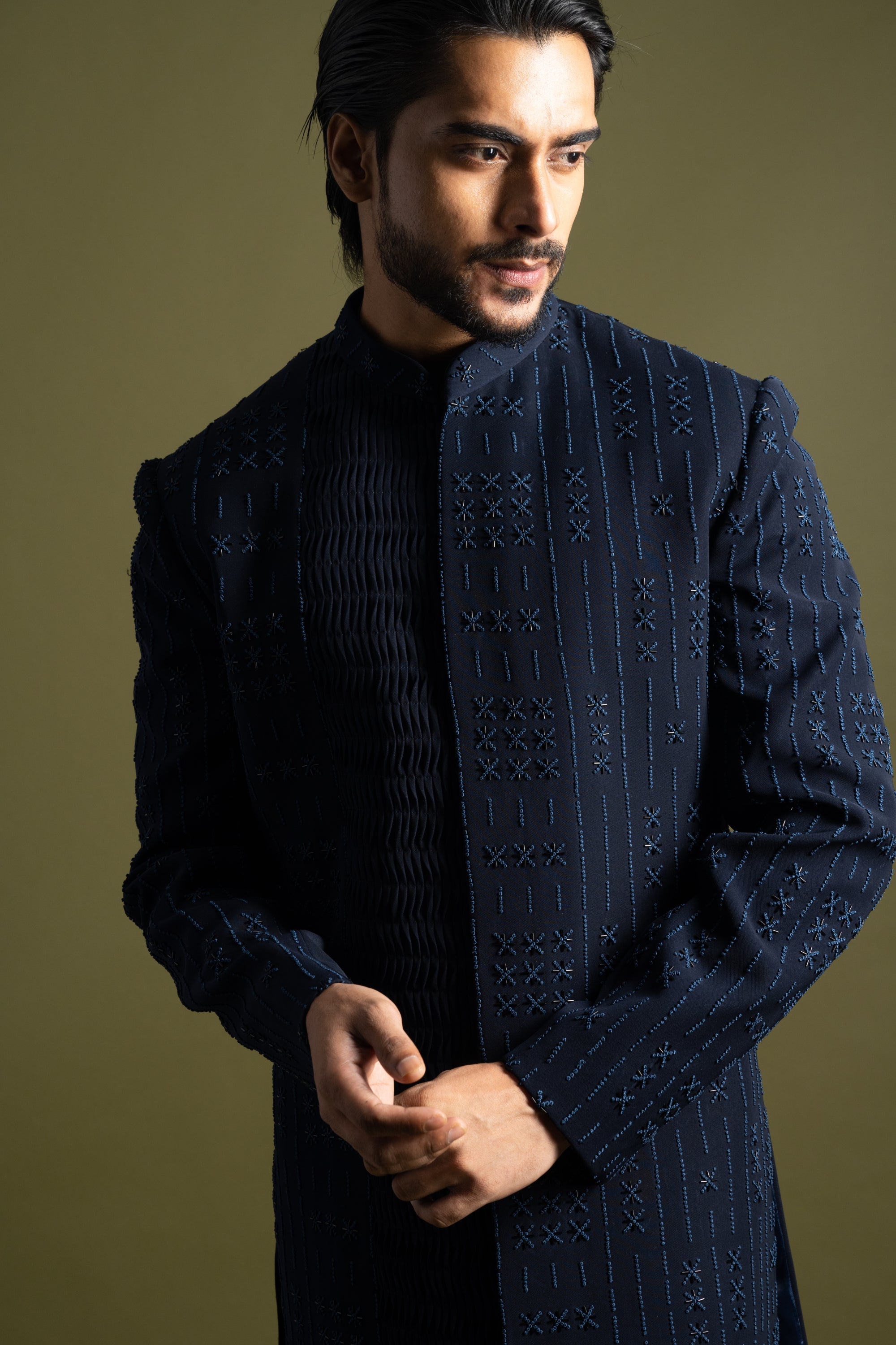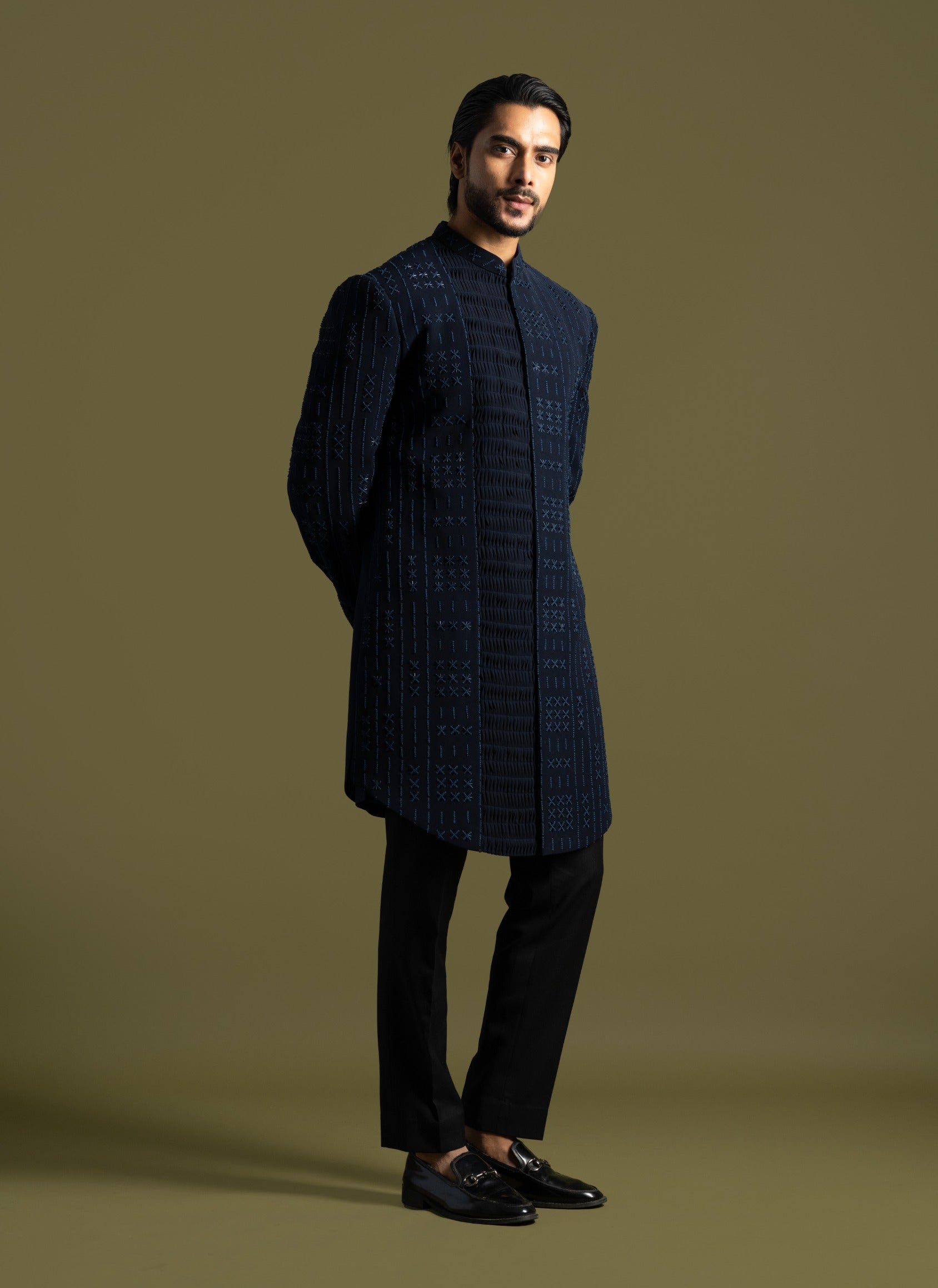 Discover the epitome of refined elegance with our blue suiting fabric achkan, designed for the modern connoisseur. This distinguished piece features a unique brick design crafted with intricate French knot embroidery, adding a textured, artisanal touch. Highlighted with shimmering cutdana embroidery on the right panel, the achkan exudes sophistication and craftsmanship. Paired with slim fit trousers, this ensemble offers a seamless blend of classic style and contemporary flair, perfect for formal occasions and upscale events.