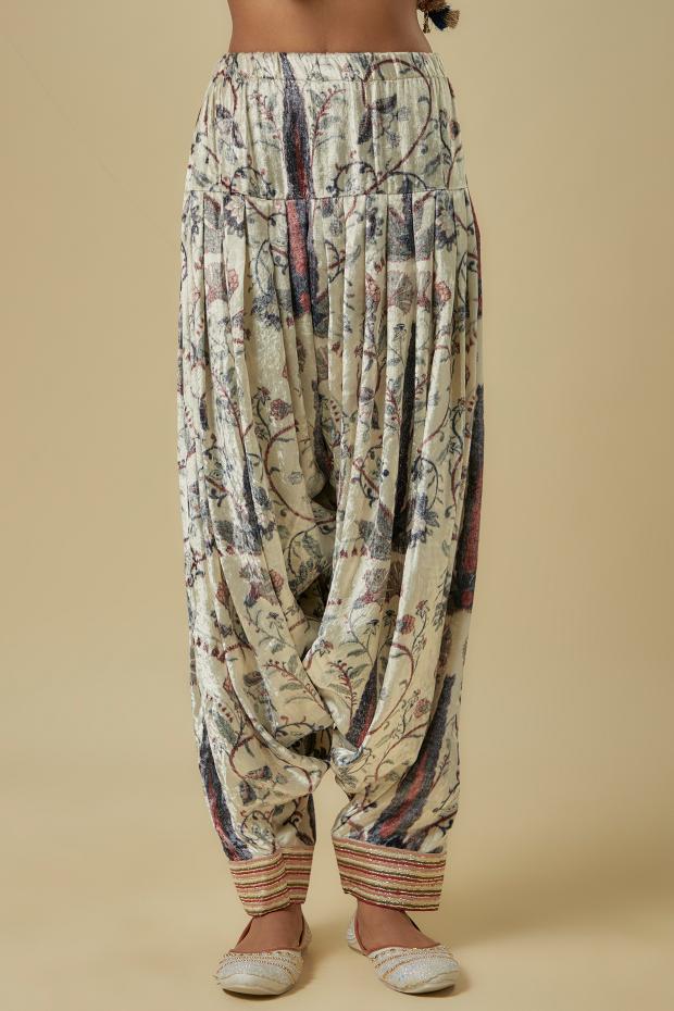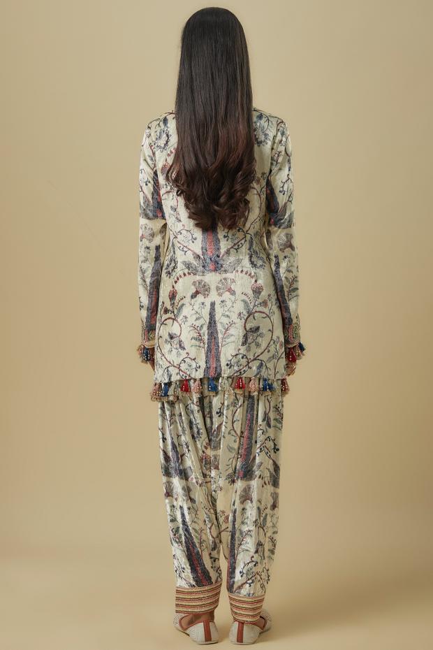 Rich in texture and charm, our Blue Forest Whisper Print Velvet Kurta Set features an embroidered yoke that adds elegance to the plush velvet silhouette. Paired with a classic Patiala salwar for a traditional touch, the ensemble is beautifully balanced with a mint mukaish organza dupatta that lends lightness and shimmer. Perfect for winter weddings, festive gatherings, or evening celebrations, this set brings together heritage and high fashion seamlessly.