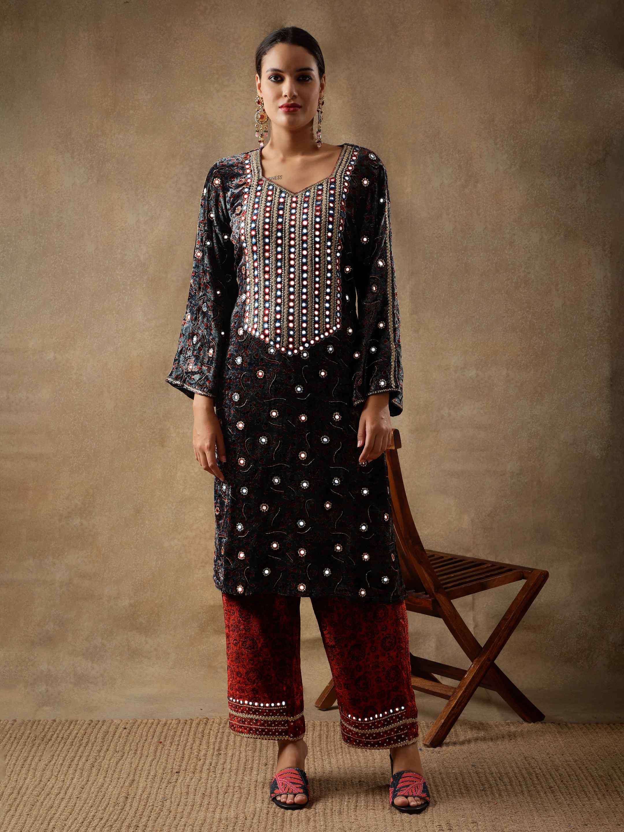 Exude royal magnificence in our Gem-Toned Sapphire Blue Velvet Suit. This opulent kurta features a unique hand block design and a flattering sweetheart neckline. The exaggerated long yoke is exquisitely hand-embroidered with our signature sheeshakari, resham, zari, aari, and beadwork, creating a stunning visual impact. The bell sleeves are also ornately embroidered, enhancing the kurta’s elegance. Paired with Rustic Red Velvet Pants that are hand-embroidered to perfectly complement the kurta, this ensemble is completed with a Rustic Red Dupatta featuring heavy hand embroidery, adding an extra layer of sophistication.