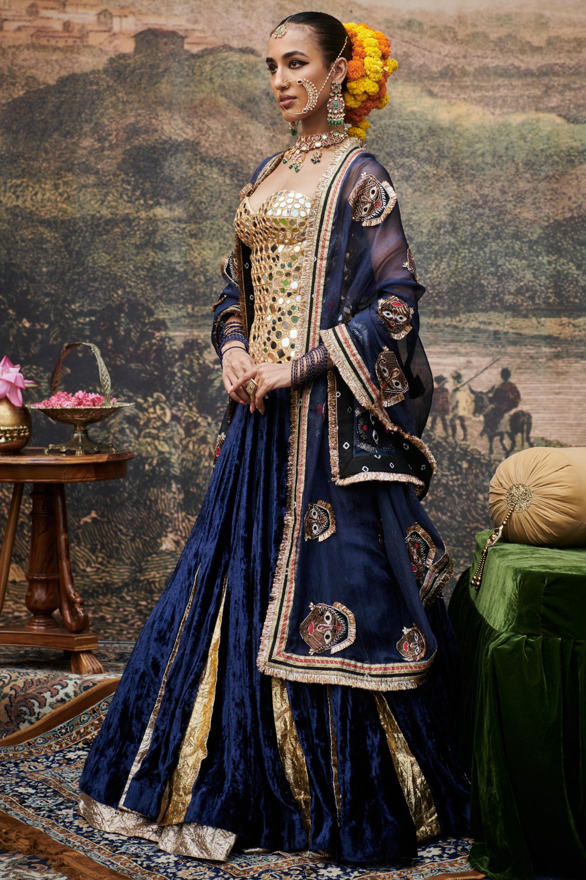A luxurious velvet lehenga with alternating silver-gold lampi godets, paired with an intricately designed mirror work corset. Complementing the ensemble is a striking blue dupatta, beautifully embroidered with bold face motifs, adding a unique and artistic touch to this stunning outfit, perfect for grand celebrations.