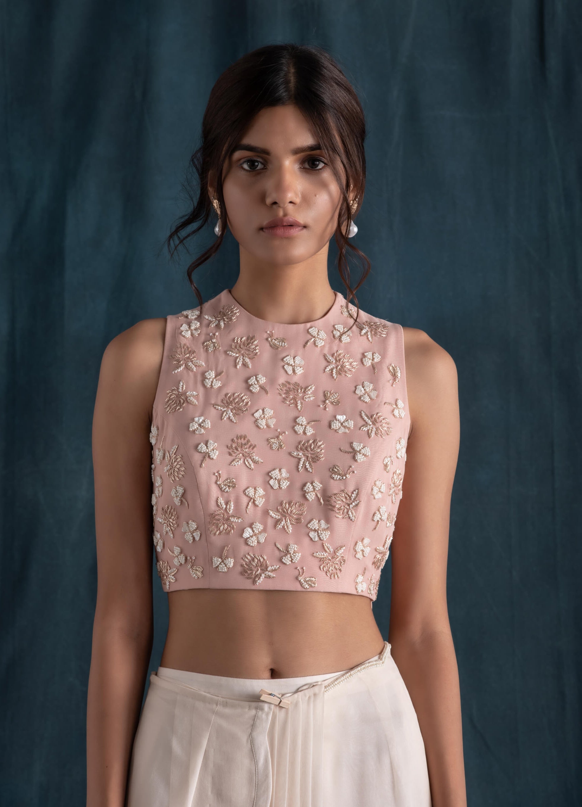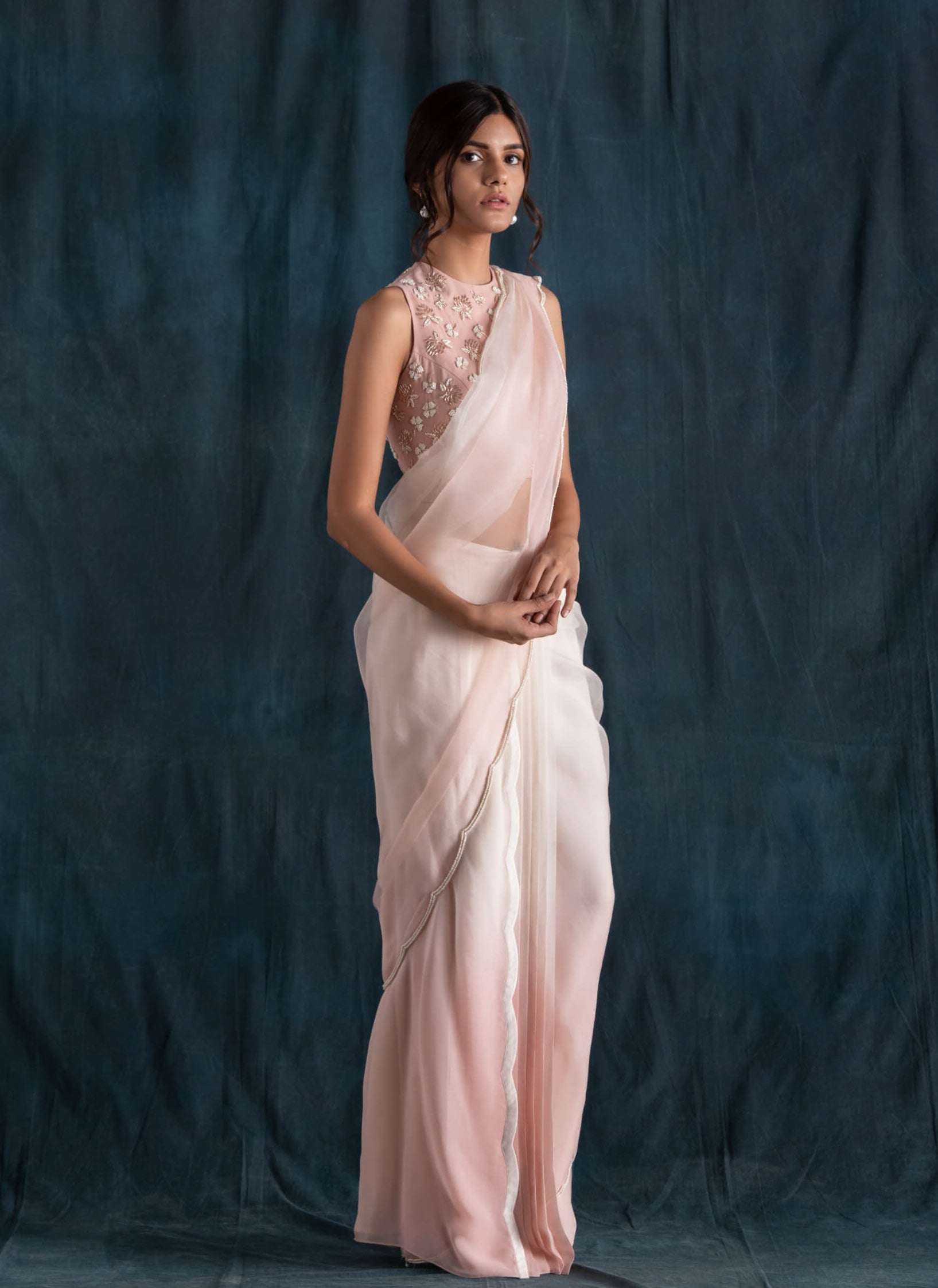 Embrace refined elegance with our blush and ivory pre-stitched saree, a masterful blend of grace and sophistication. This exquisite ensemble features a pleated wrap skirt in luxurious georgette, complemented by an attached silk organza drape adorned with a beaded scallop border and intricate scallop detailing on the pleats. The blush georgette blouse, delicately embroidered with light golden dabka, ivory beads, and sequins, creates a captivating shimmer. Finished with a satin petticoat for enhanced comfort and seamless wear, this saree embodies timeless allure and is perfect for making a stunning impression at any special occasion.