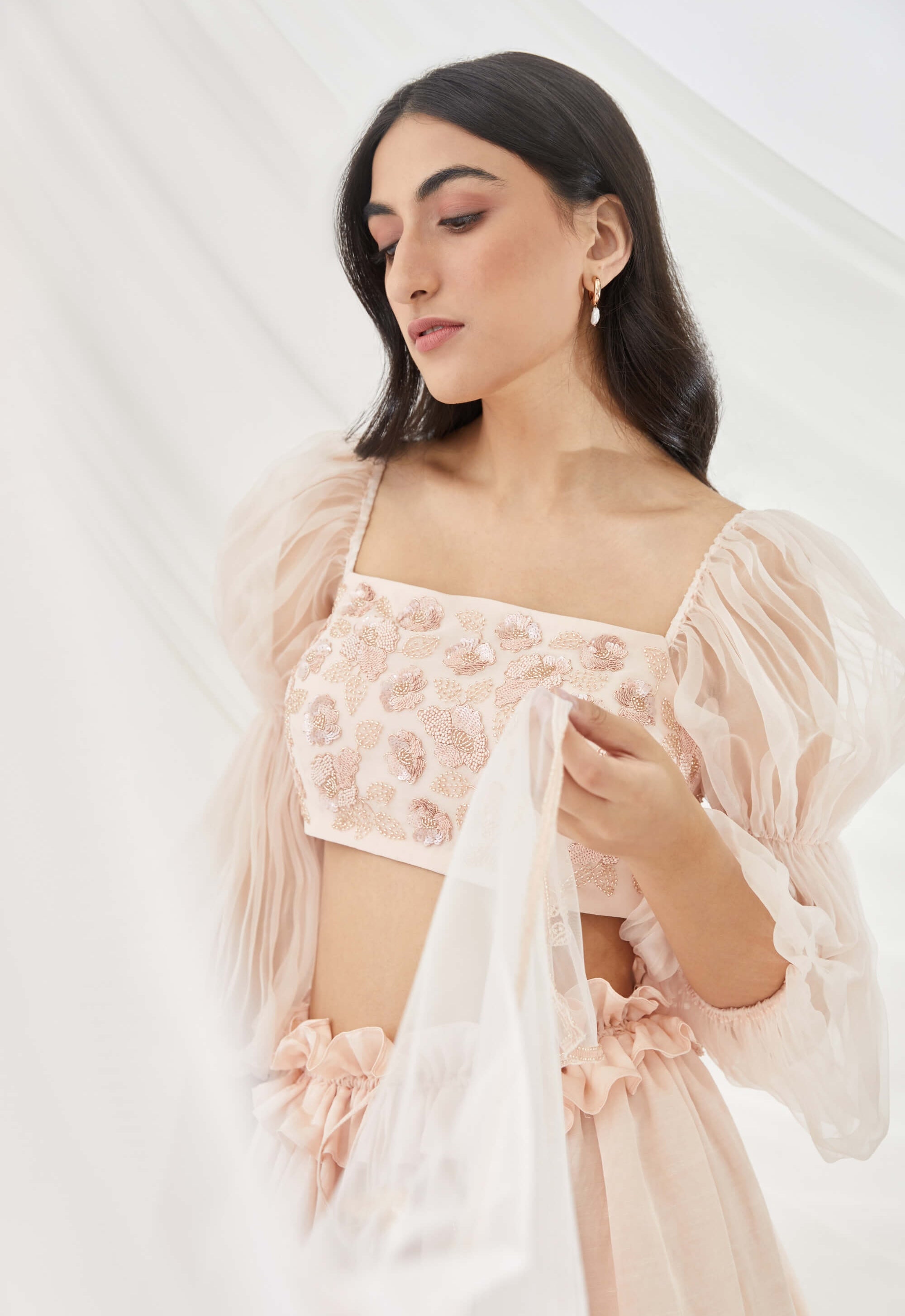 Embrace effortless charm with our meticulously crafted set, designed for both style and comfort. The ensemble features a beautifully embroidered blouse with gathered organza sleeves, paired with a skirt that boasts a drawstring waist and practical pockets for added convenience. Completing the look is a lightly embellished net dupatta, which adds a subtle touch of elegance. Ideal for daytime celebrations, this set blends sophistication with practicality. Its light, fuss-free design ensures you'll look effortlessly chic while enjoying all-day comfort. Perfect for those seeking a stylish yet practical choice for various occasions.