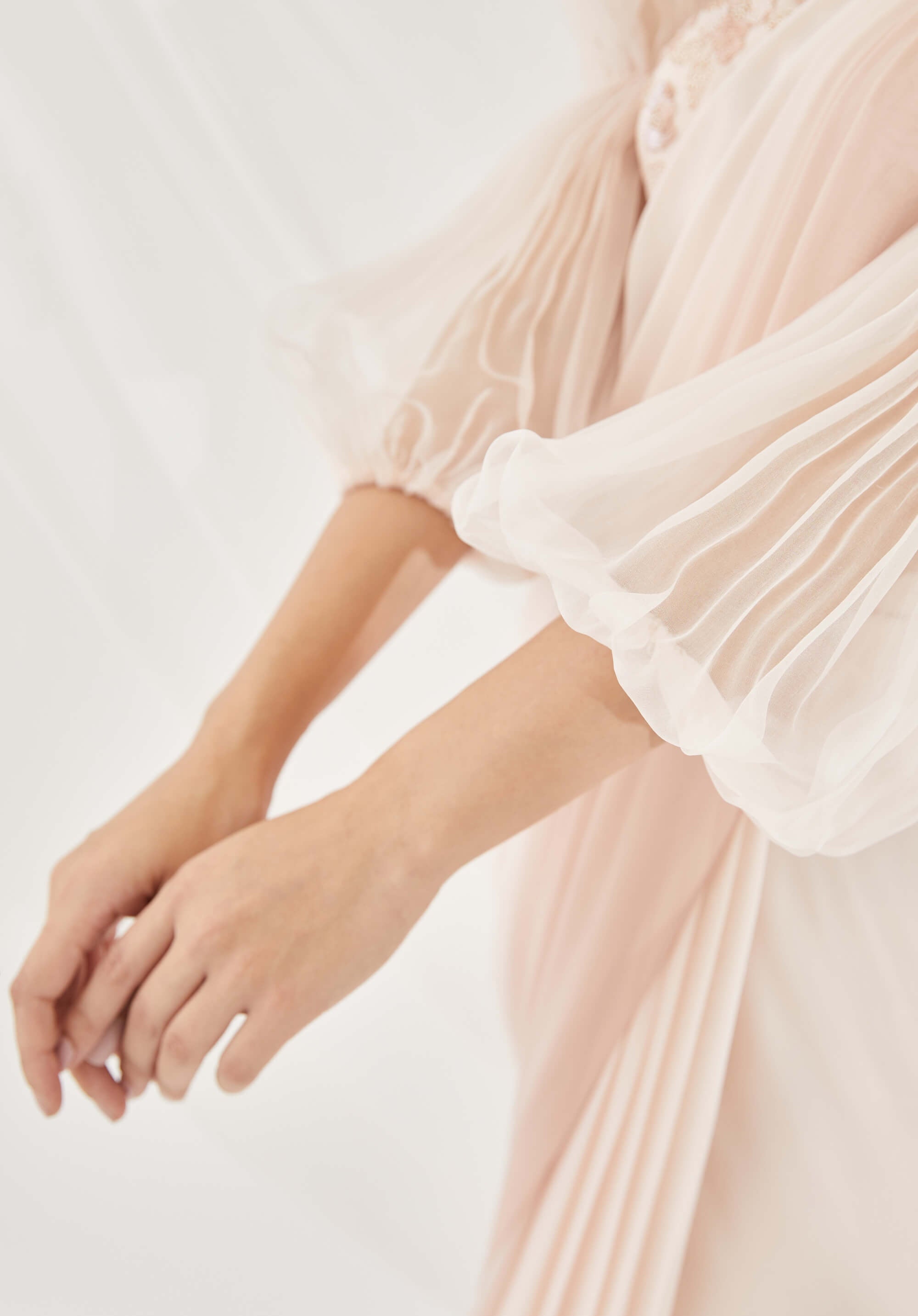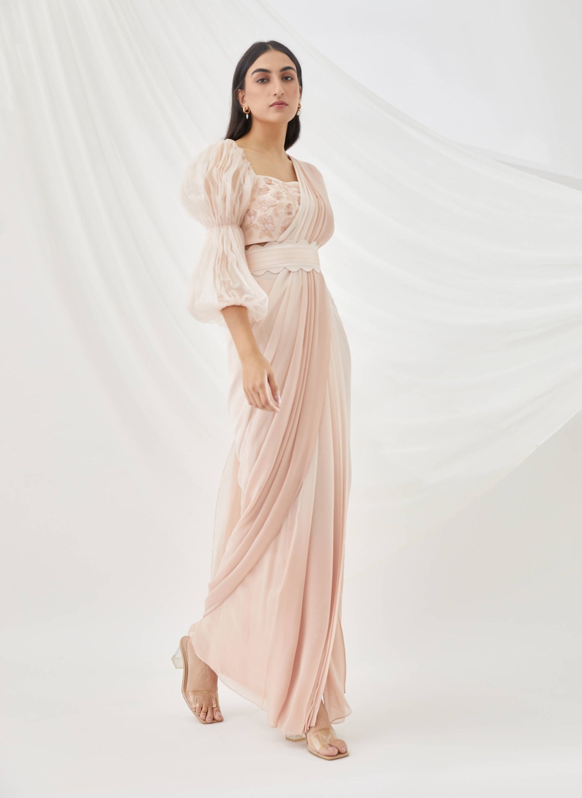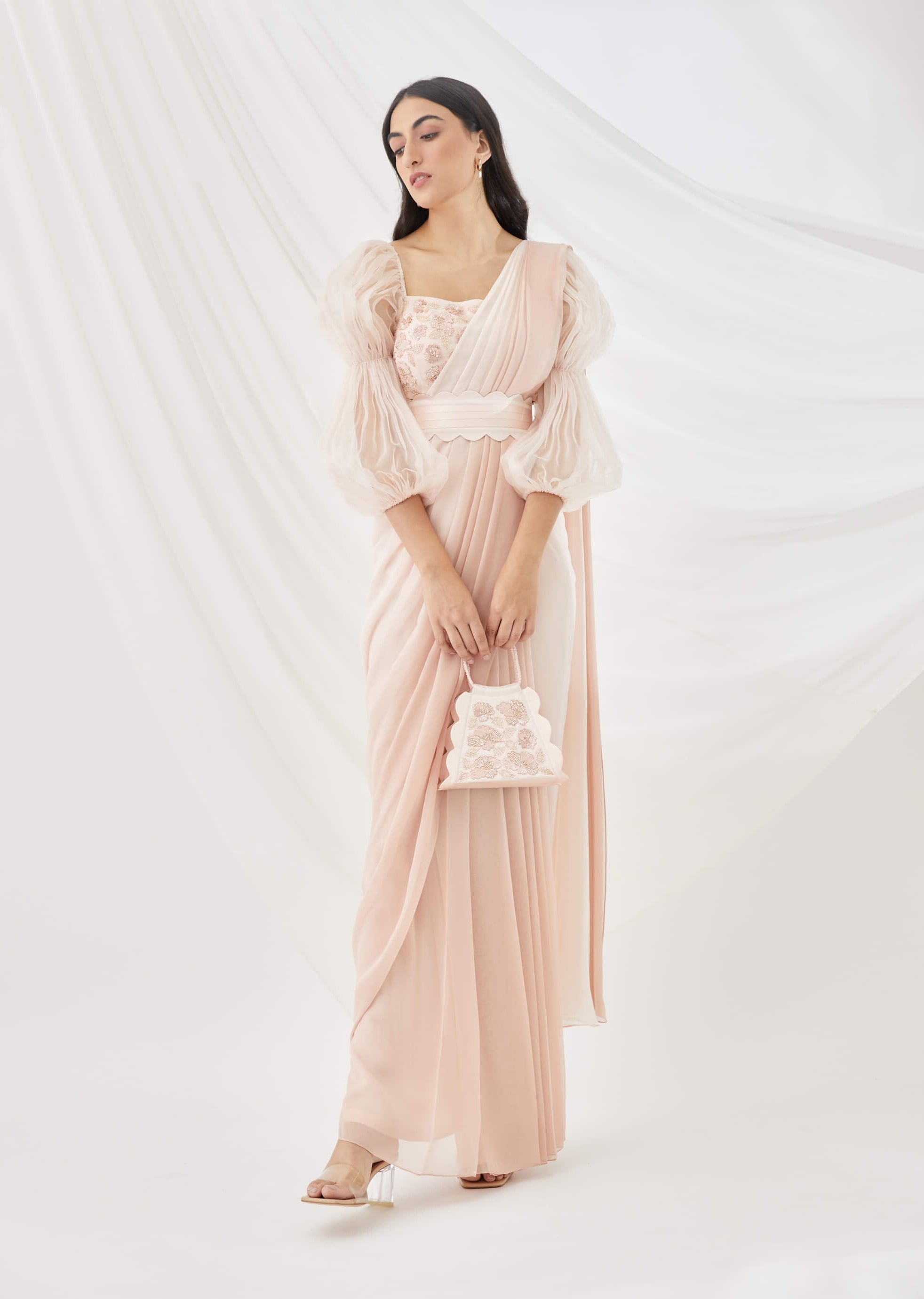 Discover understated elegance with our exquisite saree ensemble, featuring a pleated wrap skirt with an attached saree drape and a stitched satin petticoat. Paired with an embroidered blouse adorned with billow sleeves in silk organza, and accented by a separate pleated belt showcasing our signature scallop trim, this ensemble exudes a quietly romantic mood. Lightweight and effortlessly chic, it strikes the perfect balance between femininity and sophistication, ideal for those seeking a blend of timeless charm and contemporary style.