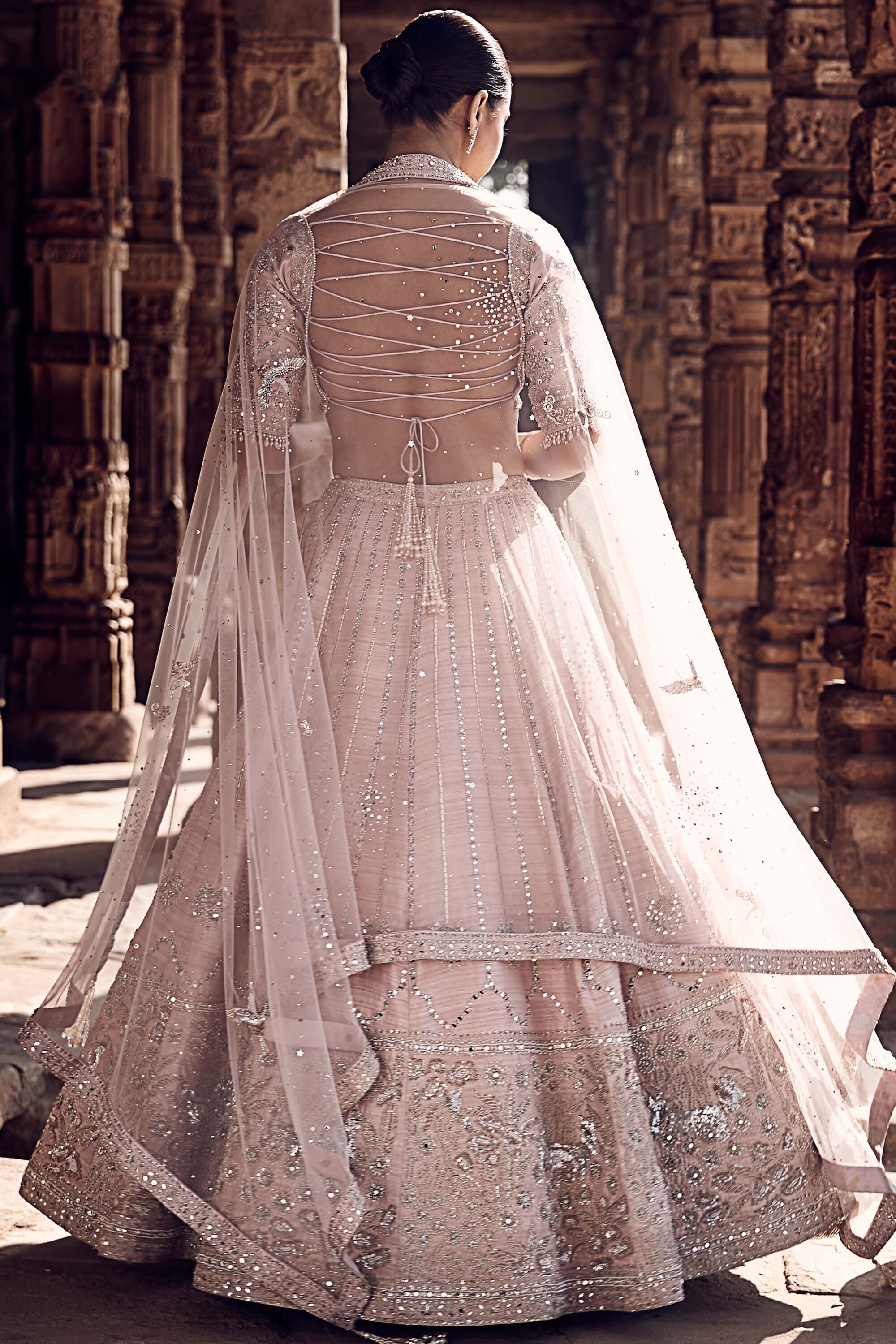 Experience timeless elegance with The Blush Tulip Sheesha Gota Lehenga. Crafted from luxurious raw silk, this lehenga features exquisite pure gota work and is beautifully enhanced with Silver Dori embroidery. The subtle allure of mirror work adds a touch of understated opulence, while the iconic Matsya V-Wing belt provides a distinctive, sophisticated finish.