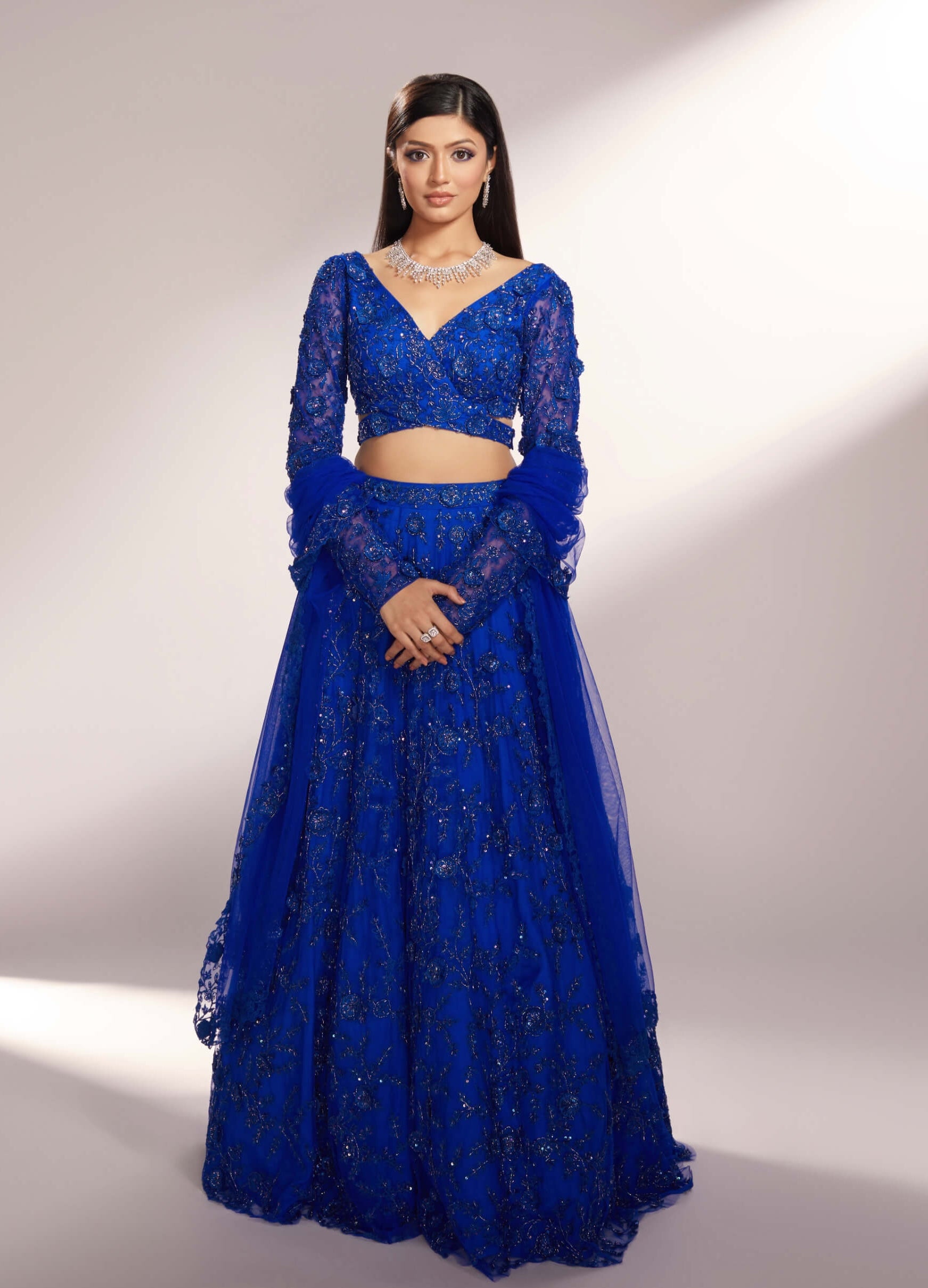 Elevate your style with our royal blue lehenga set featuring a net base adorned with intricate 3D floral details and glass-beaded embroidery. The lehenga is a stunning display of craftsmanship paired with a full-sleeve blouse that continues the theme of elaborate embroidery for a cohesive look. Completing the ensemble is a matching dupatta beautifully designed to complement the lehenga's opulent details. This set exudes a regal charm perfect for making a grand impression at any sophisticated event.