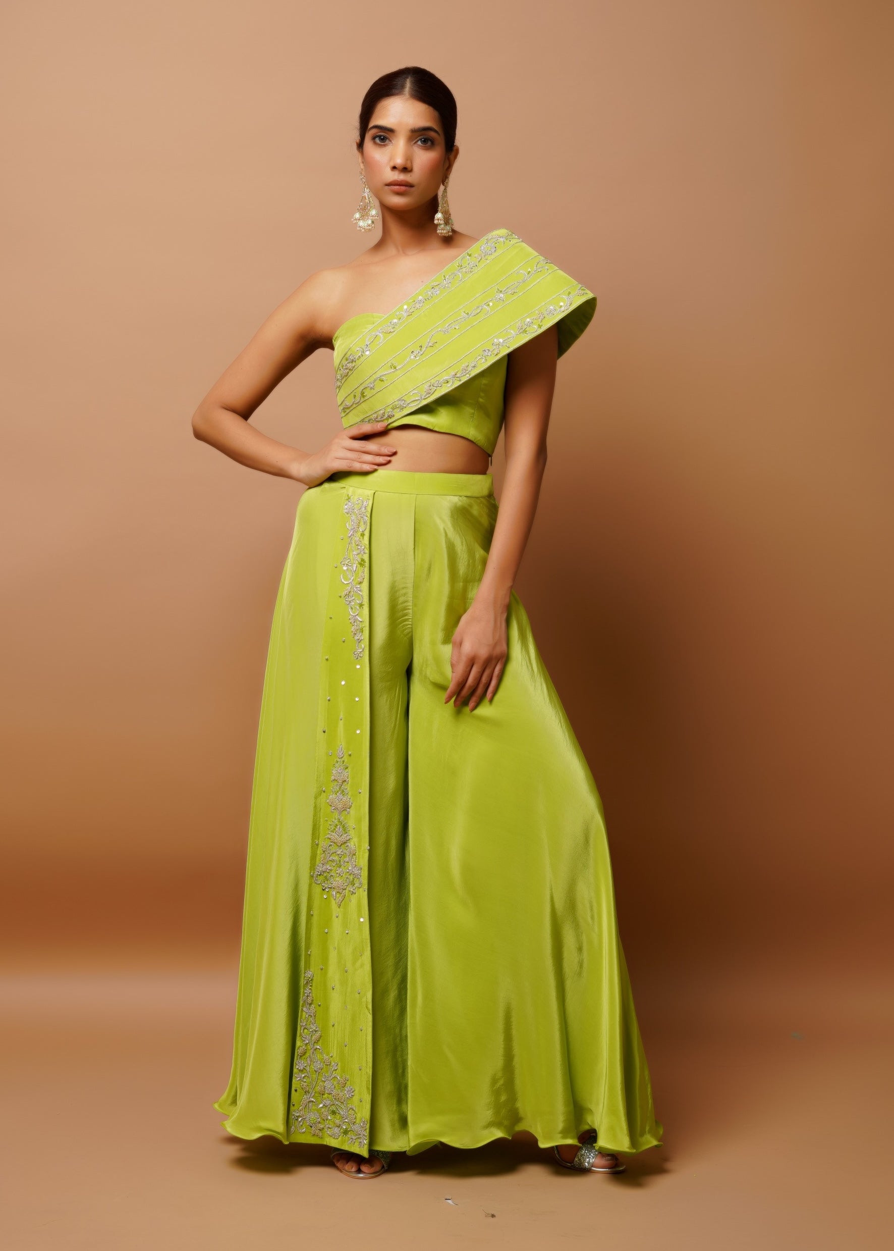 Elevate your style with this enchanting set, featuring a lavender jacket adorned with intricate cutdana, pearl, and sequins embroidery. The delicate embellishments create a mesmerizing shimmer and refined elegance. Paired with the jacket is an exquisitely embroidered palazzo, which complements the jacket with its own detailed craftsmanship. This ensemble blends classic sophistication with contemporary allure, making it an ideal choice for any elegant occasion.