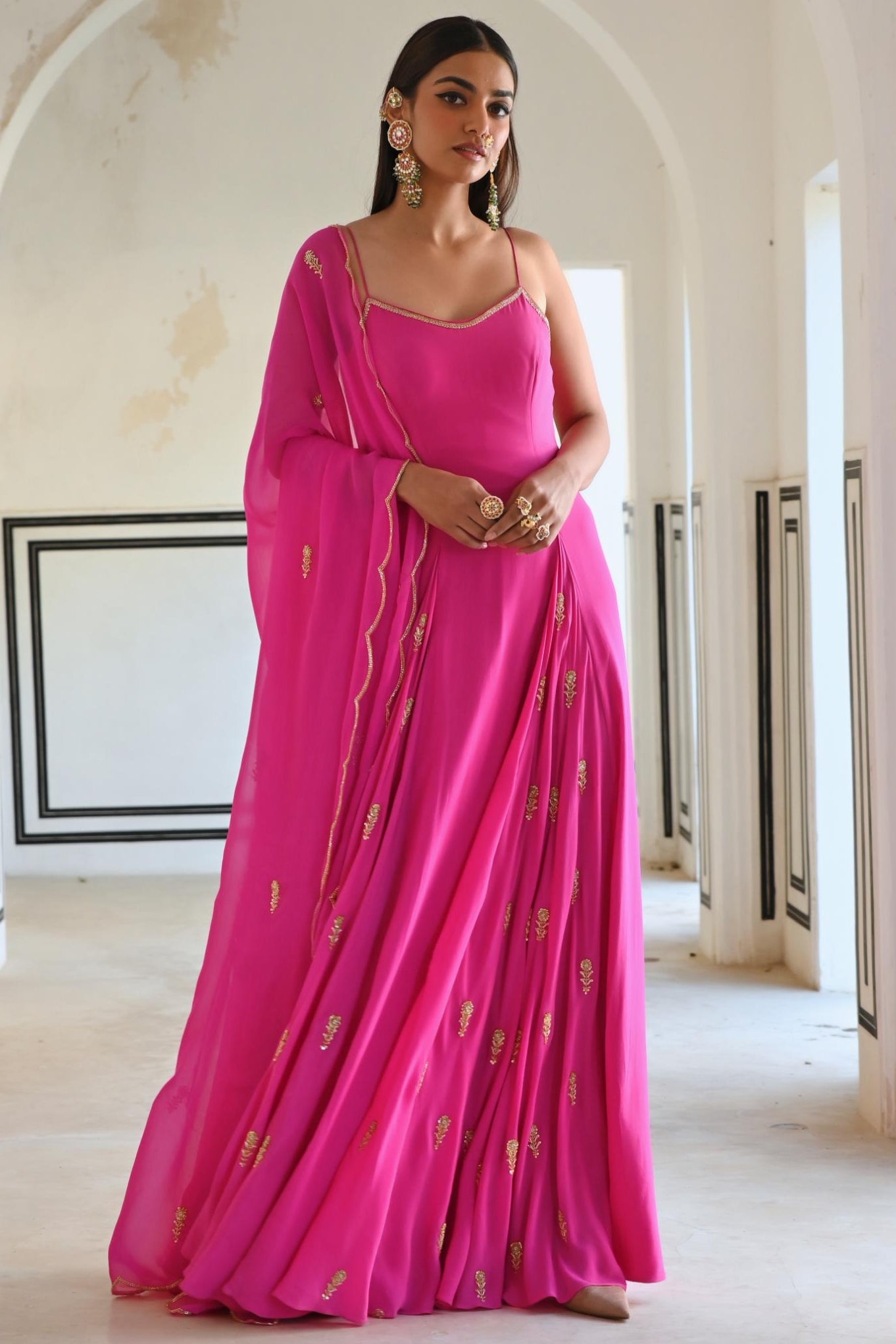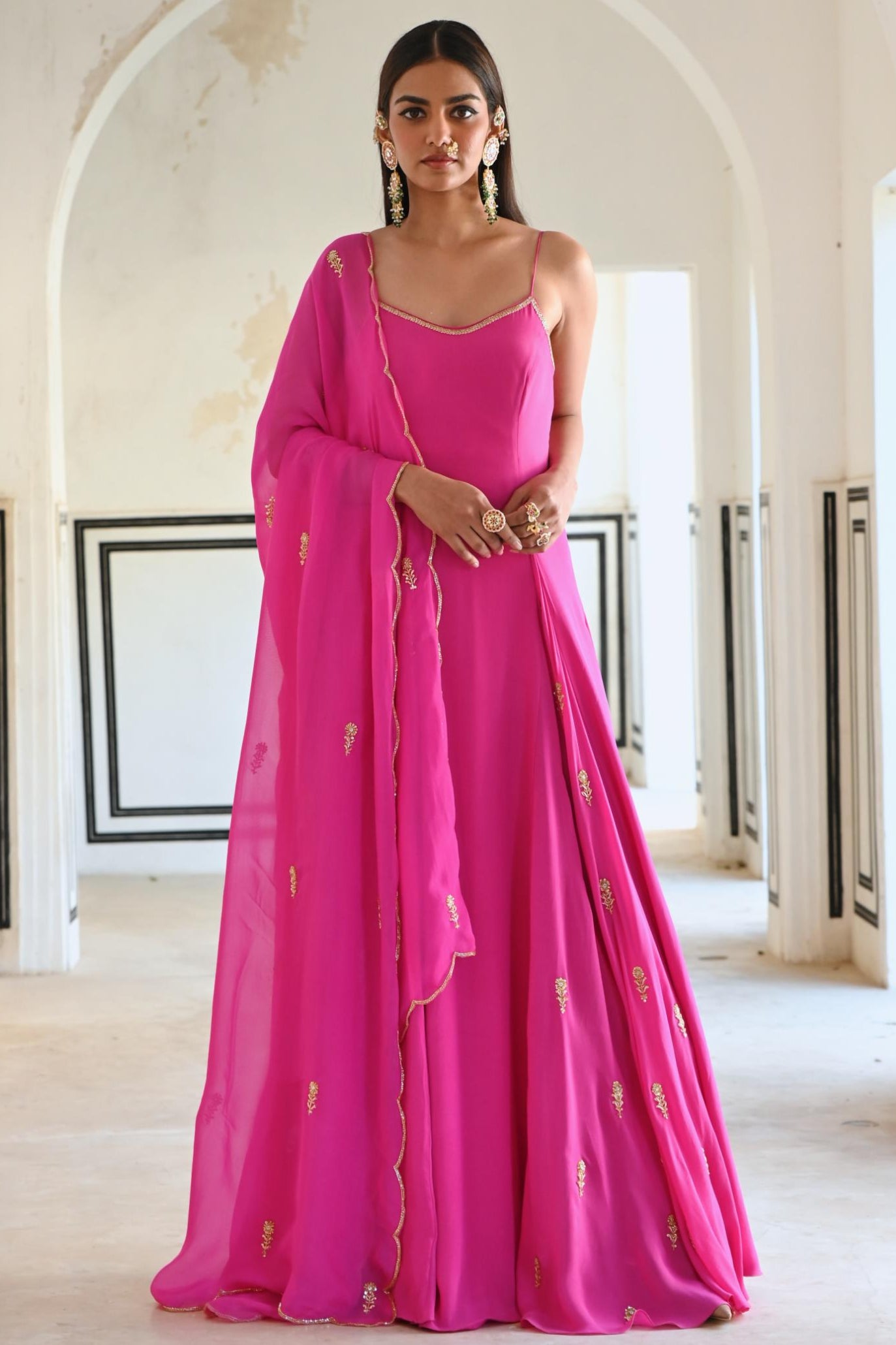 Make a stunning statement in the Bright Pink Rahi Floor-Length Anarkali with Dupatta. Featuring a vibrant hue and a graceful silhouette, this ensemble is perfect for weddings, festive celebrations, and special occasions.