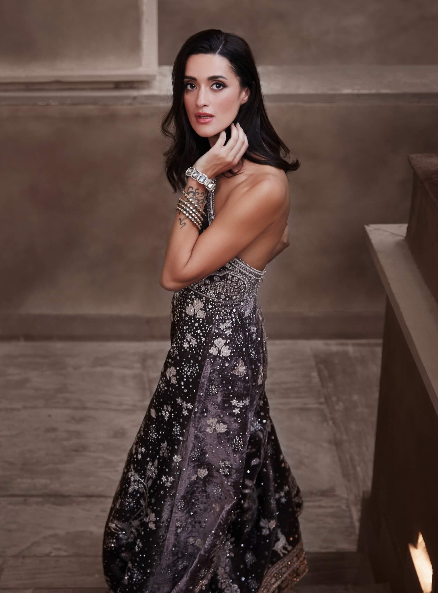 Experience the perfect blend of tradition and modernity with the British Charcoal Celestial Jumpsuit. This striking silhouette seamlessly integrates elements from both traditional and Western aesthetics. Adorned with tarnished silver dori work and intricate hand embroidery, including nakshi, dabka, sequins, mirrors, and zardozi, it highlights the finest aspects of Indian craftsmanship.