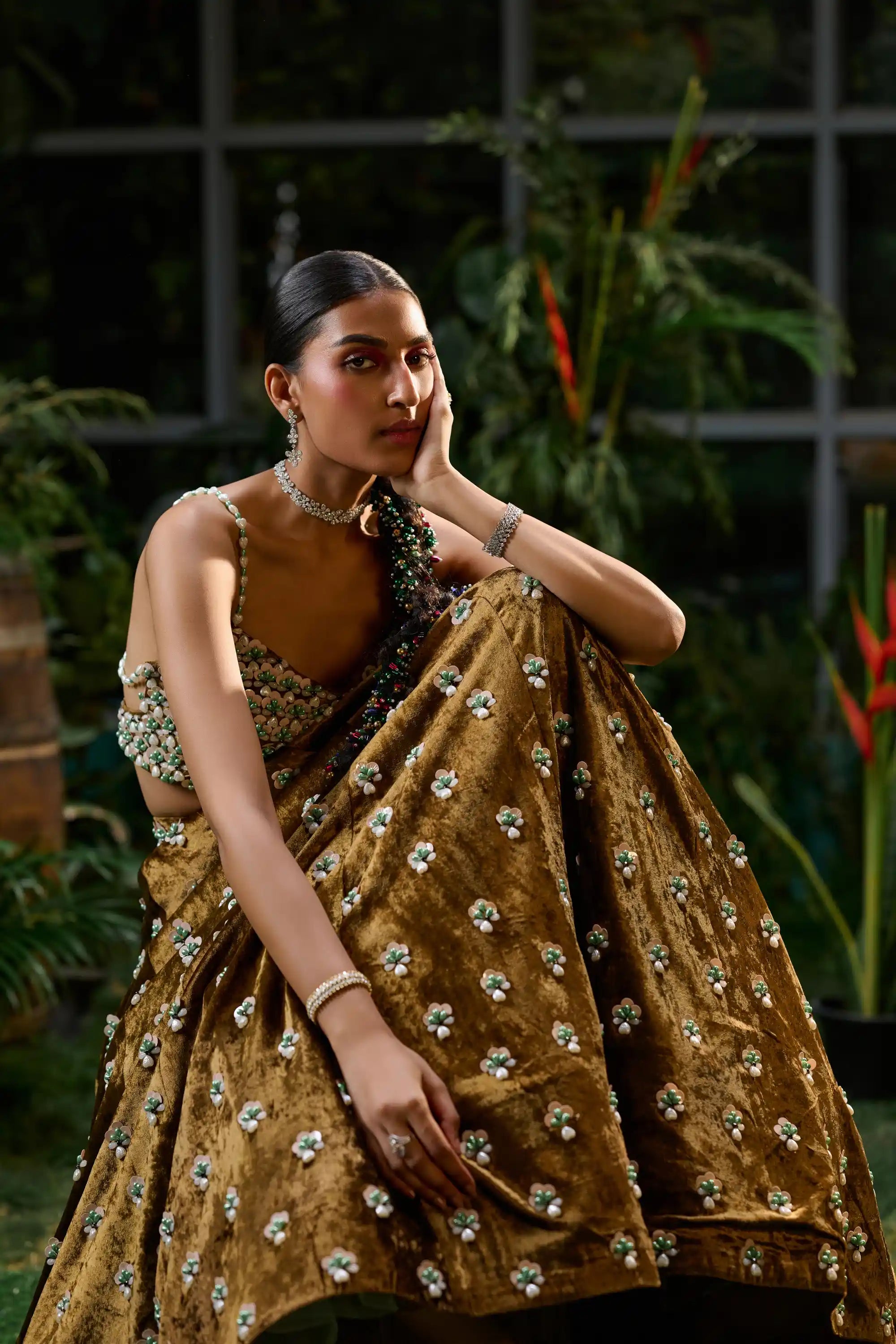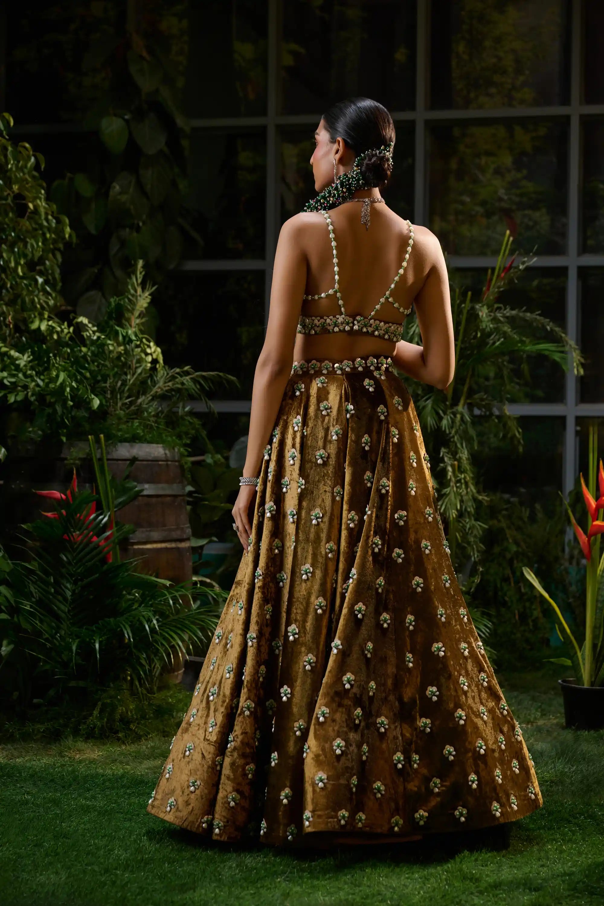 Indulge in royal elegance with this exquisite velvet lehenga, adorned with handcrafted mini motifs embellished with sequins, beads, and pearls. The luxurious fabric radiates richness, creating a stunning silhouette. Complementing the lehenga is a sleeveless blouse, accentuated with a uniform pattern of surface embellishments that adds character and sophistication. Perfect for any grand occasion, this ensemble promises to leave a lasting impression.