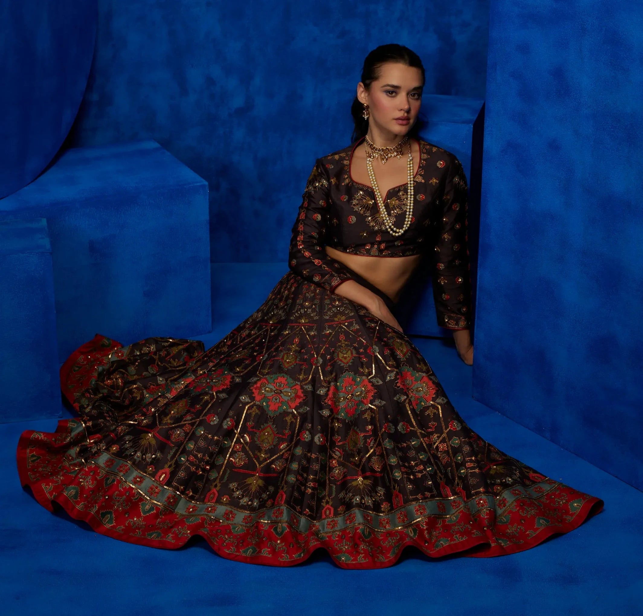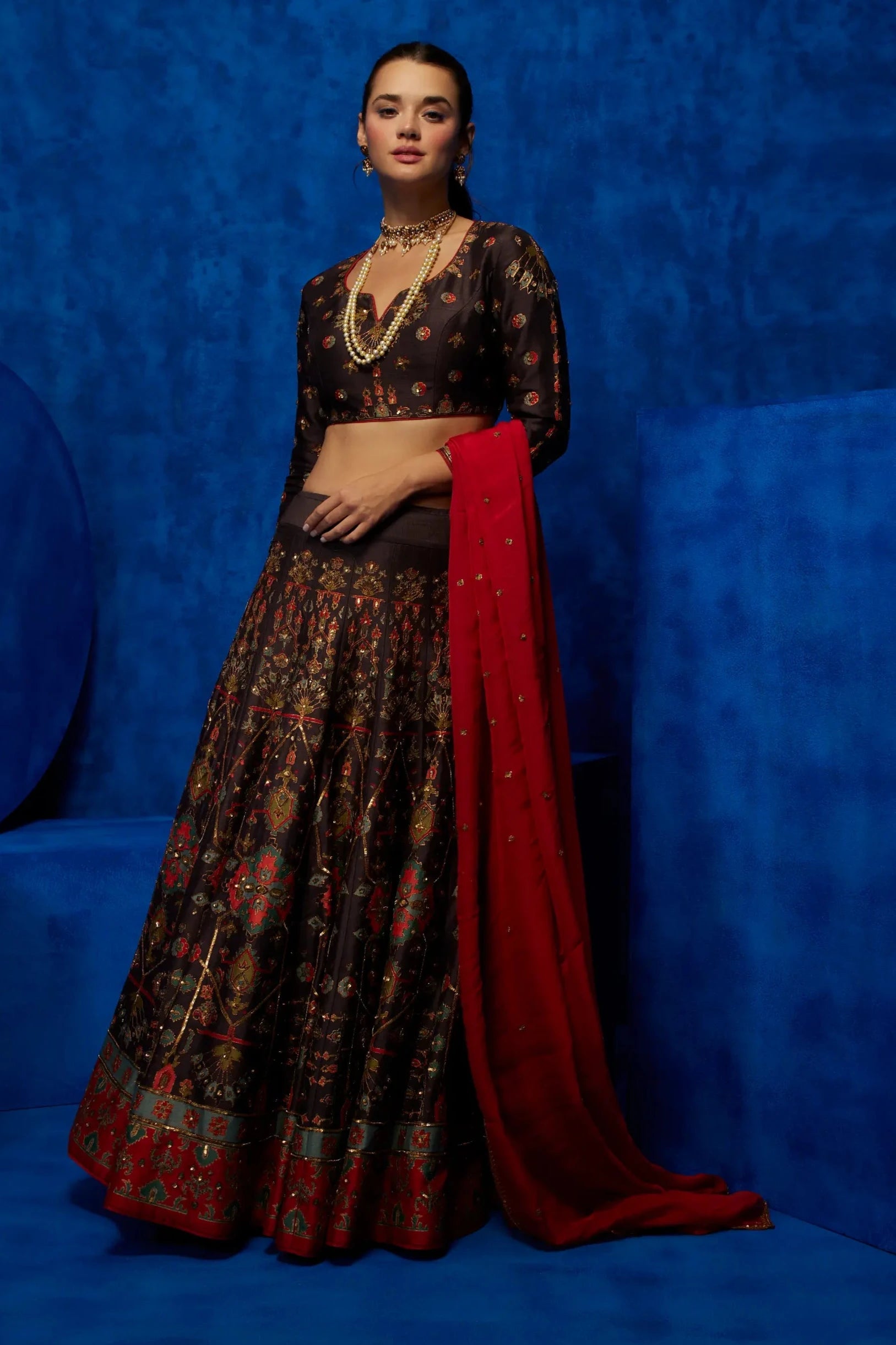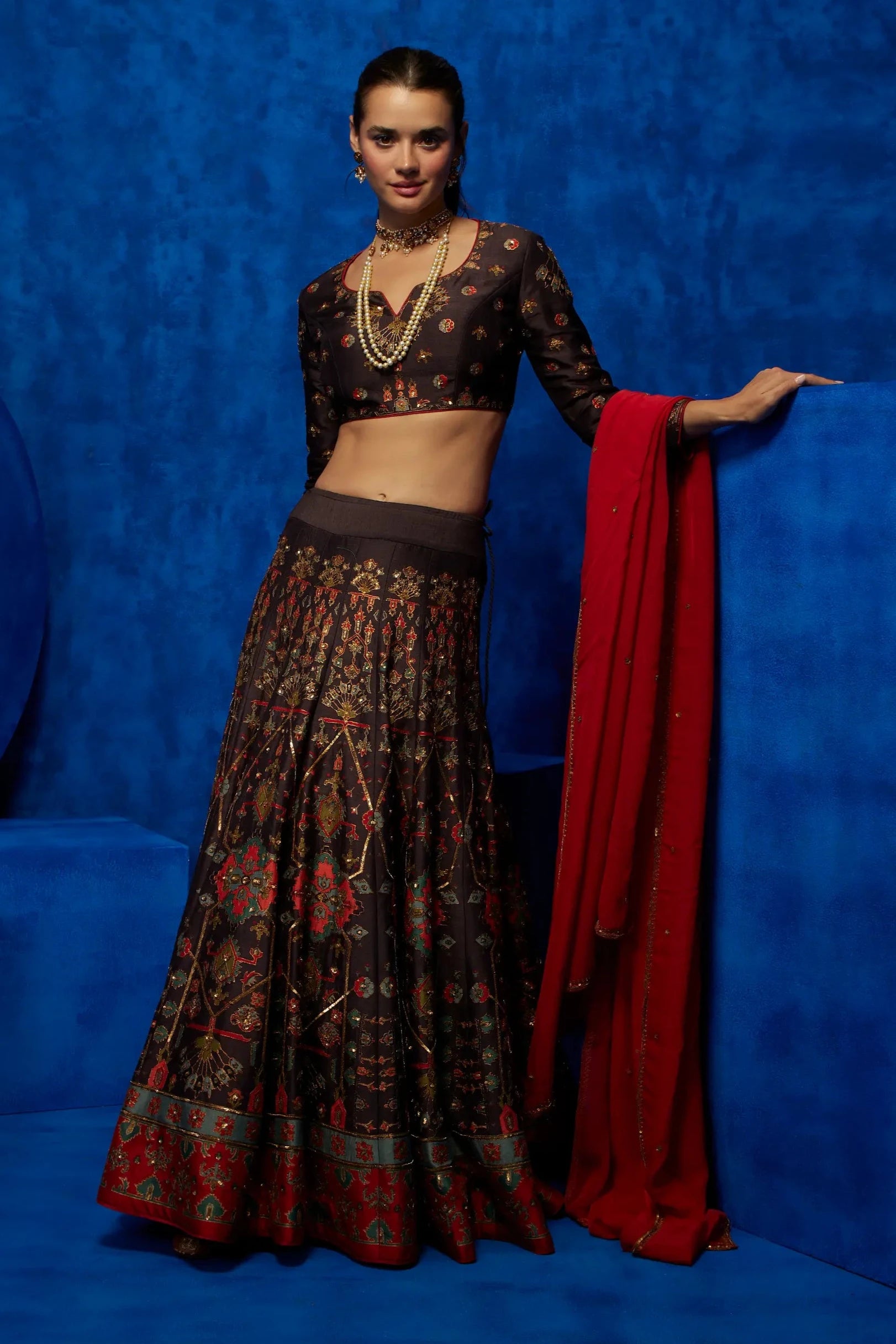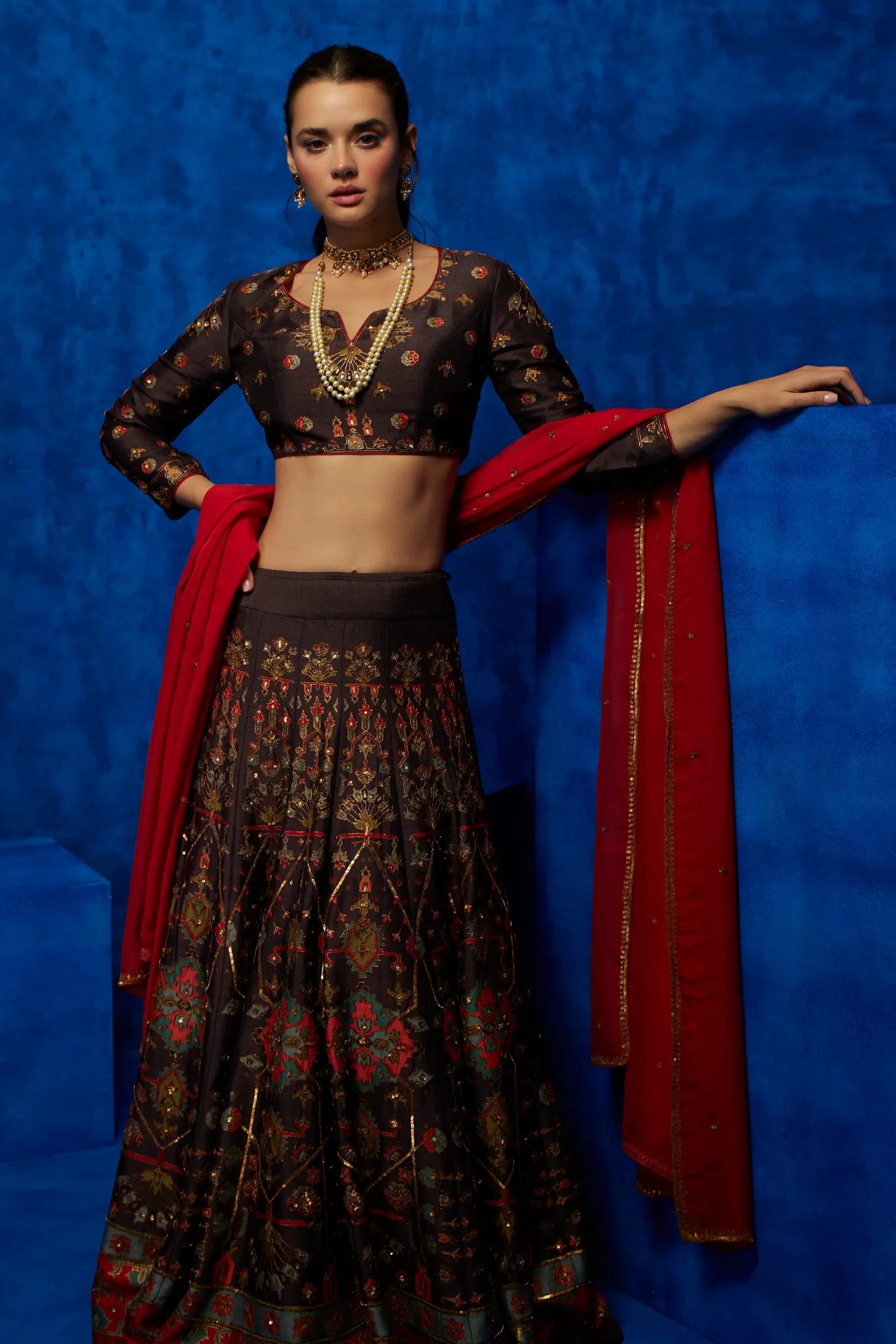 Elevate your festive style with this brown printed lehenga and blouse with red dupatta. The earthy brown lehenga, adorned with intricate prints, pairs beautifully with the matching blouse, creating a chic and sophisticated look. The vibrant red dupatta adds a bold contrast, completing the ensemble with a pop of color. Perfect for weddings, receptions, or cultural celebrations, this set combines timeless elegance with contemporary flair.