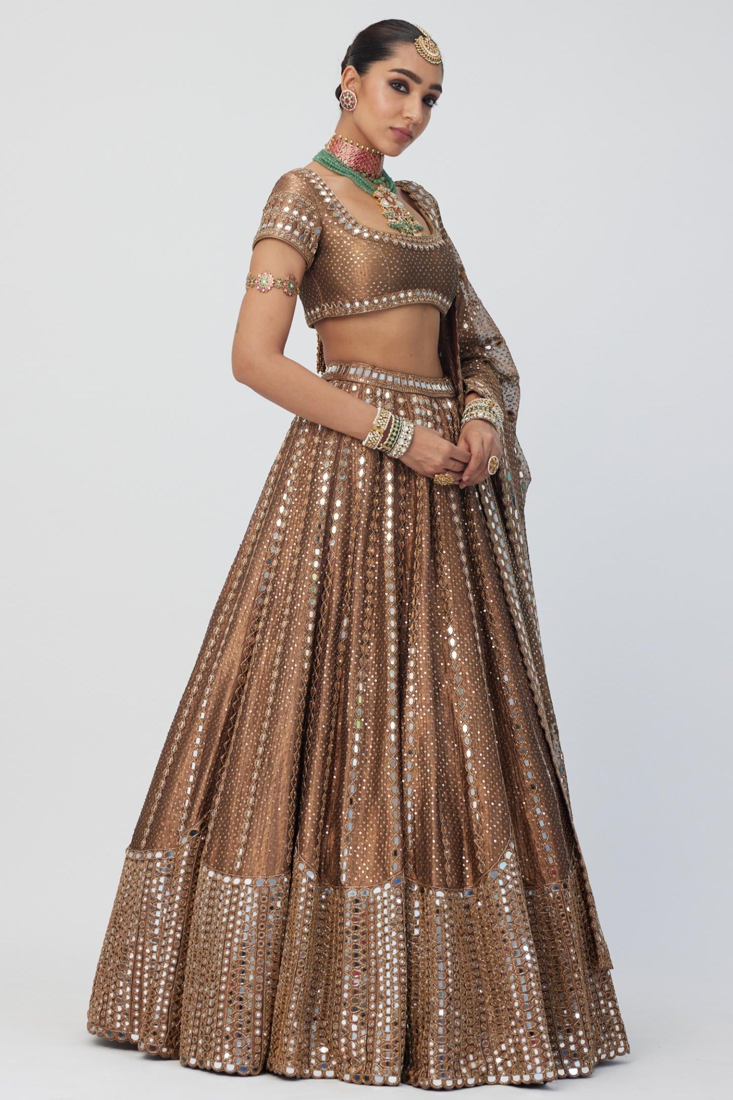 Subtle yet striking the Brown Tara Regal Affair Organza Sequins Lehenga Set is an exquisite blend of undetated elegance and modern sparkle. Crafted in sheer organza the lehenga features delicate sequin embellishments that catch the light with effortless grace. The rich brown tone adds a contemporary edge while the intricately designed blouse brings structure and sophistication. Finished with a lightweight dupatta this ensemble is perfect for receptions cocktail soirées or intimate weddings. For the woman who favo depth detail and refined glamour this lehenga set makes a lasting impression.
