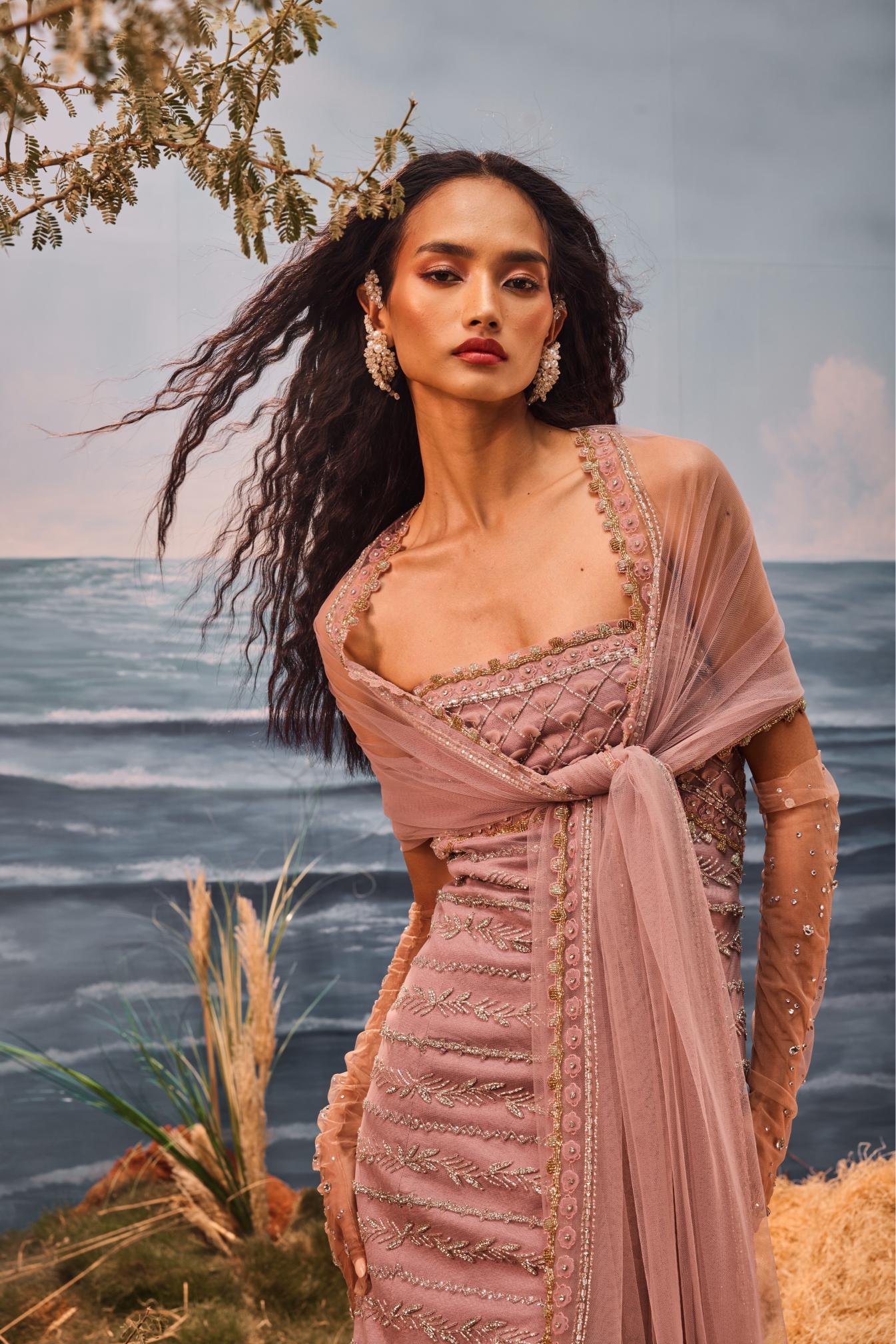 Radiant, sophisticated, and undeniably elegant, the Burnt Pink Florentia Dress with Lehenga and Dupatta is a perfect blend of modern design and traditional beauty. The structured dress exudes contemporary elegance, while the flowing lehenga adds a regal touch that moves gracefully with every step. The rich burnt pink hue adds depth and warmth, making this ensemble perfect for weddings, festive celebrations, or grand occasions. Paired with a delicately draped dupatta, this set offers the ideal balance of timeless charm and modern flair. For the woman who loves to make a statement with elegance and poise, this ensemble is the ultimate choice.