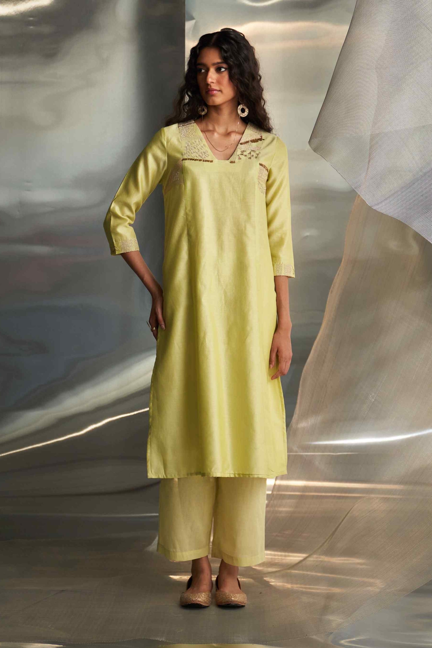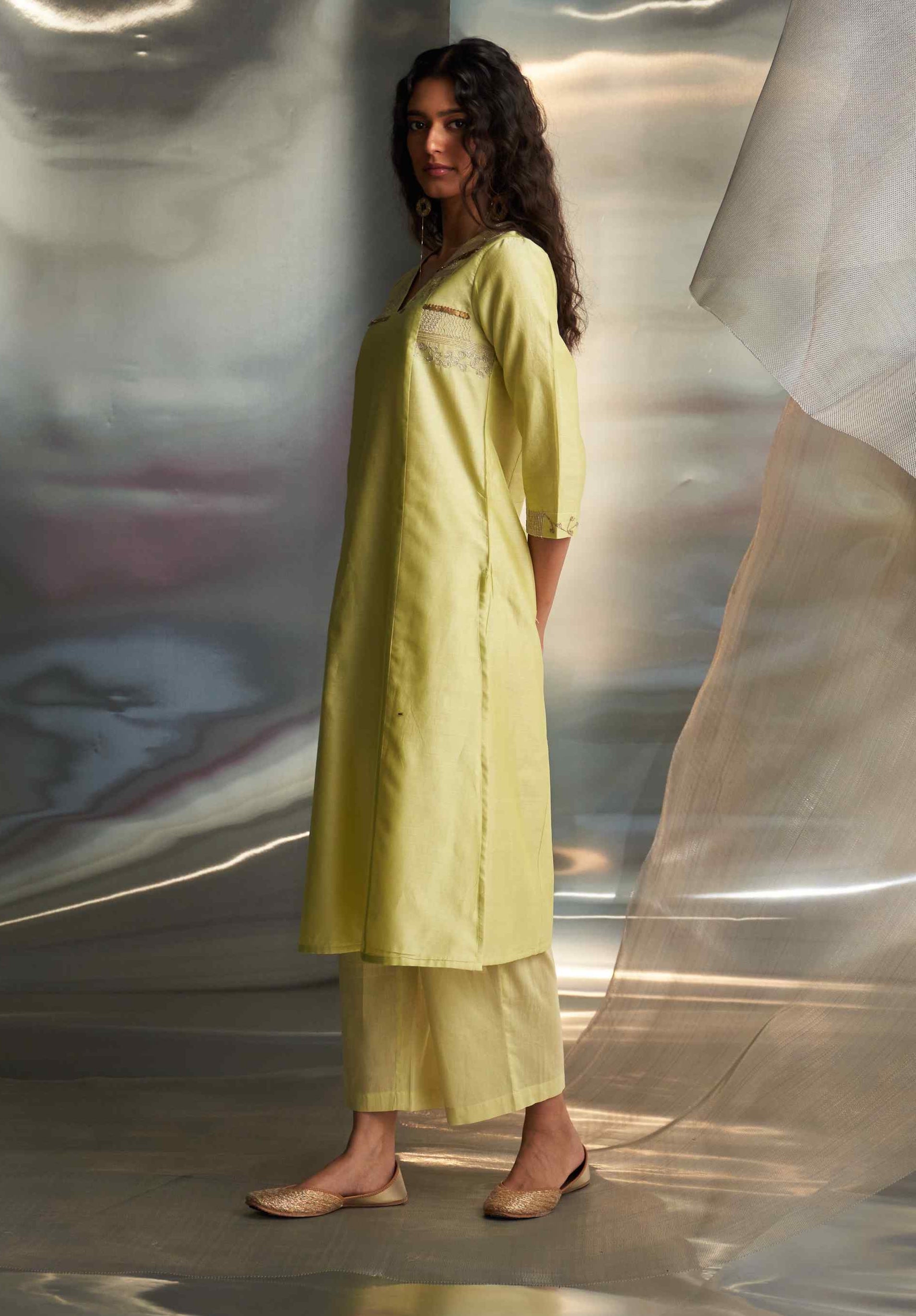 Elevate your style with this butter yellow kurta, adorned with intricate embroidery inspired by the grandeur of pharaonic regalia. The kurta features exquisite embellishments on the neckline and side panels, creating a tapestry of regal elegance. Paired with an embroidered dupatta showcasing vibrant, contrasting panels and accented with gold-polished edge hangings, this ensemble perfectly blends sophistication with cultural richness. Ideal for any occasion, it combines timeless charm with luxurious detail, making it a standout addition to your wardrobe.