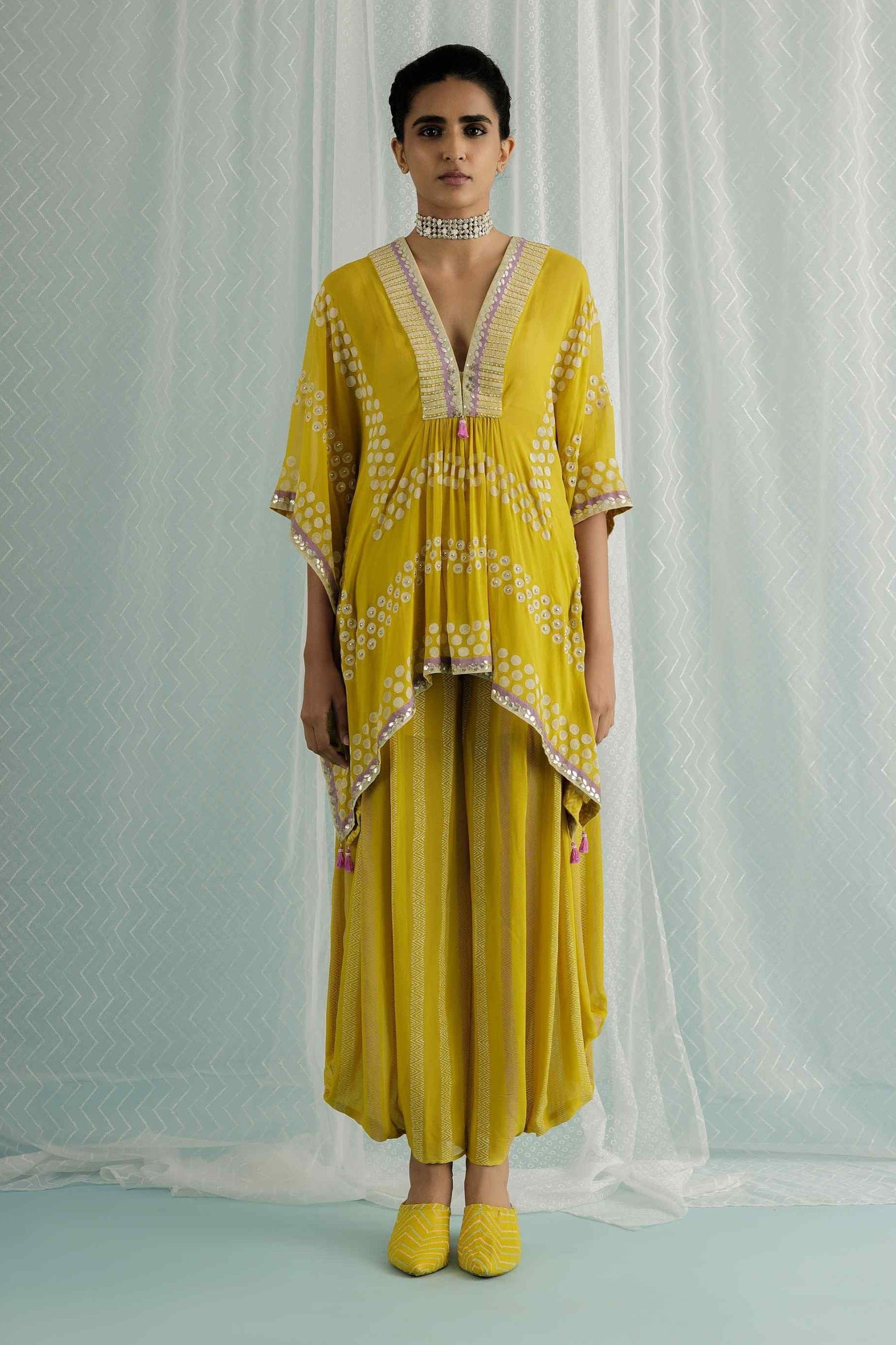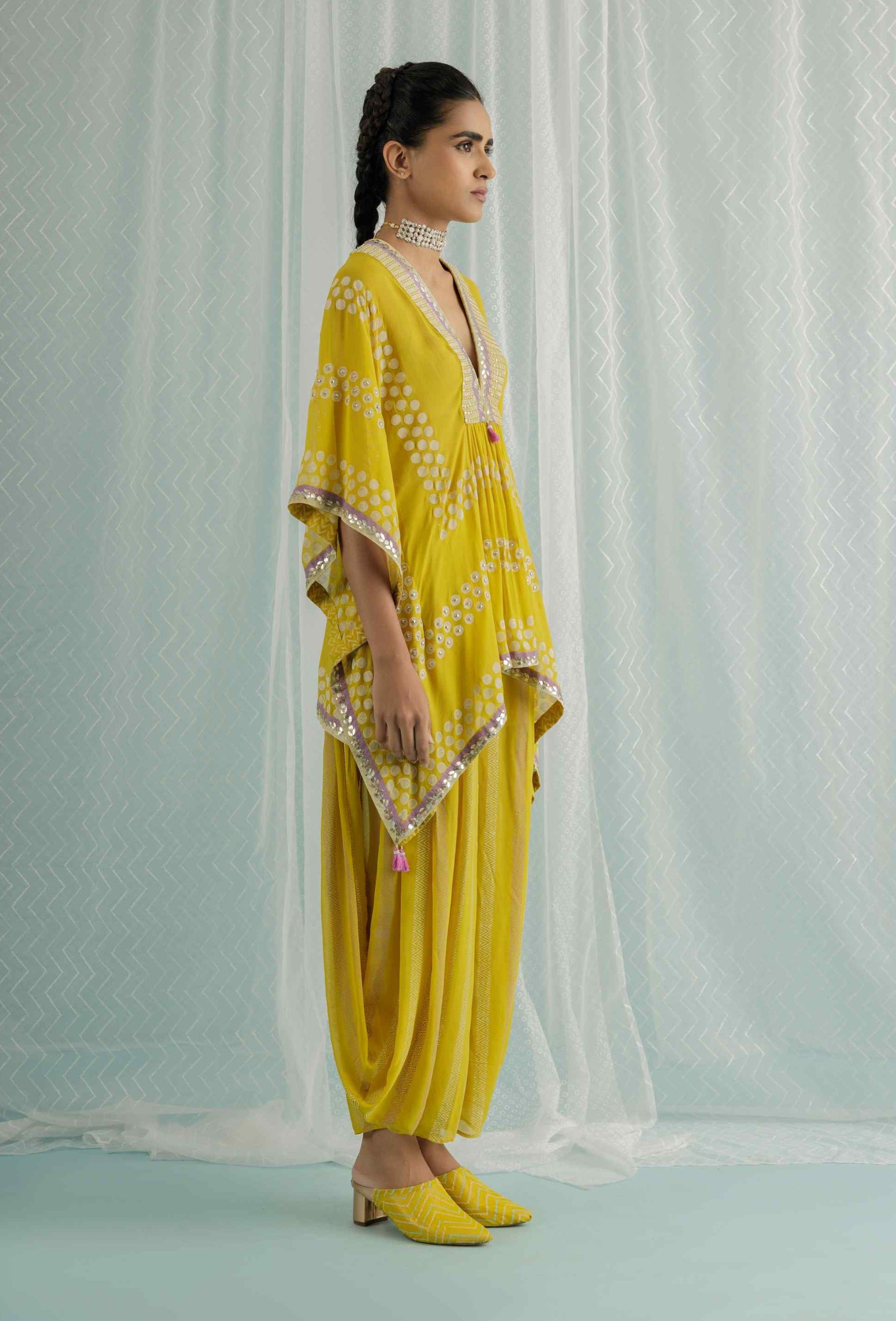 Our canary georgette short kaftan features custom block printing in soft lilac and ivory tones, enhanced with hand-embroidered gota, sequins, and beads. Paired with a printed dhoti pant and a stylish short inner, this set combines traditional charm with modern elegance, perfect for making a chic statement at any occasion.