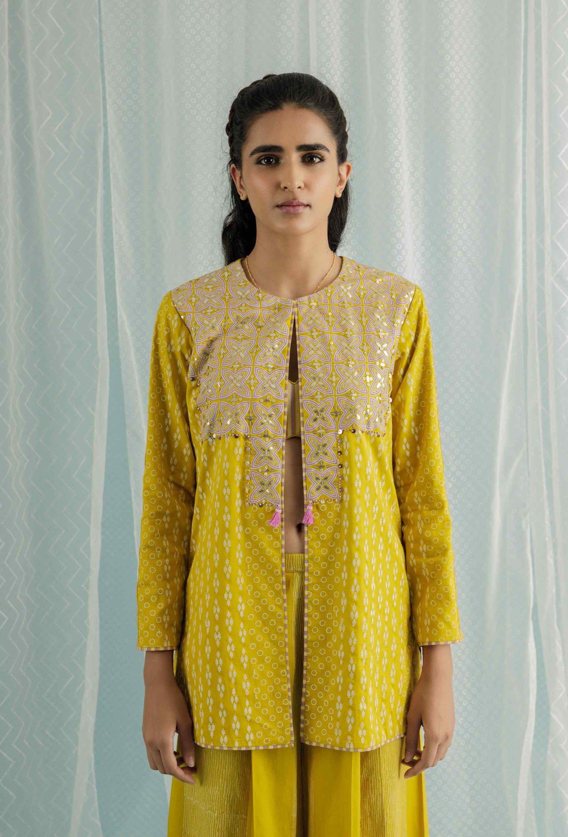 Discover refined style with our canary cotton silk jacket, featuring custom block printing in lilac and ivory, enhanced with hand-embroidered gota, sequins, and beads. Paired with a coordinating stripe-print blouse and printed pleat wide-hem trousers, this ensemble offers a sophisticated blend of traditional artistry and contemporary flair. Ideal for making a statement at any special occasion, it combines luxurious detailing with modern elegance.