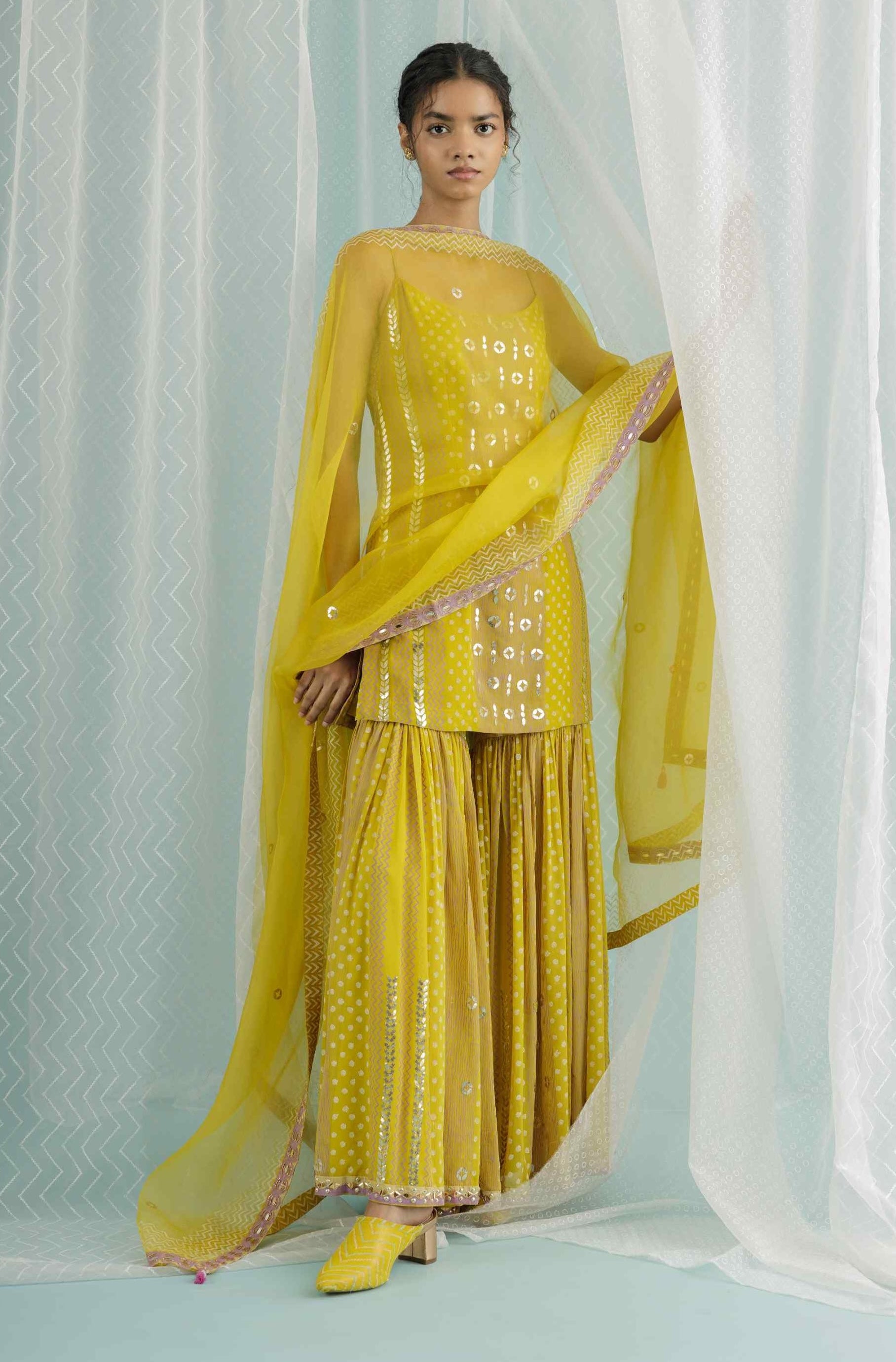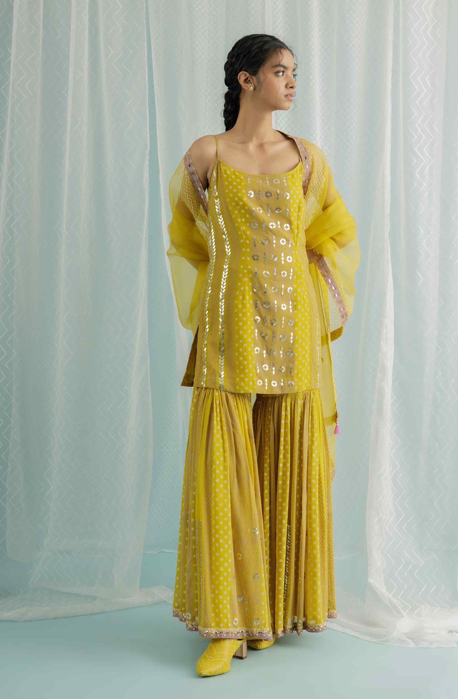 This canary georgette short kurta features custom block printing in elegant shades of lilac and ivory, further enhanced with intricate hand embroidery in gota, sequins, and beads. Paired with a printed and embroidered organza dupatta, this set seamlessly blends traditional charm with contemporary style, making it a perfect choice for any special occasion.
