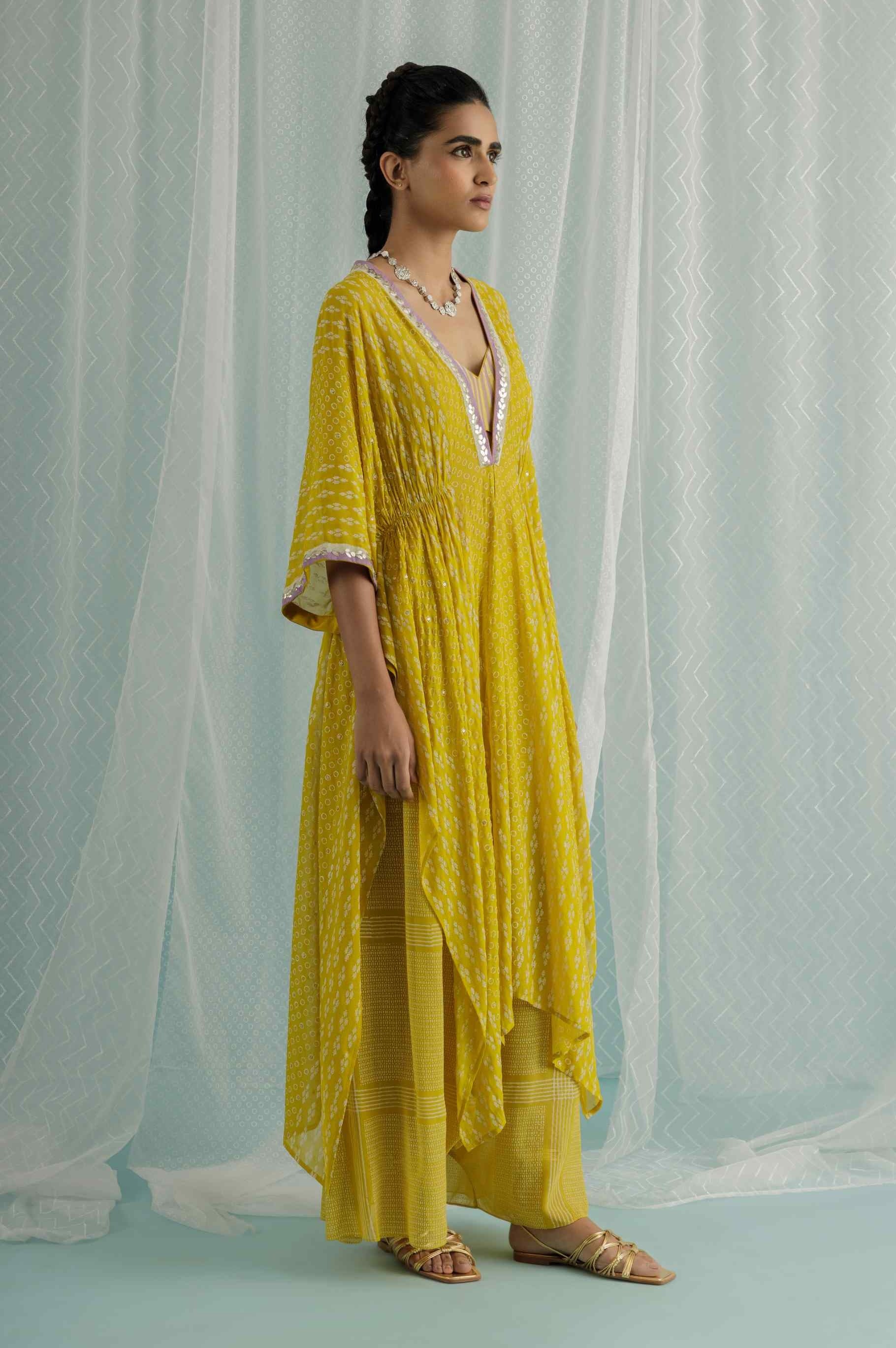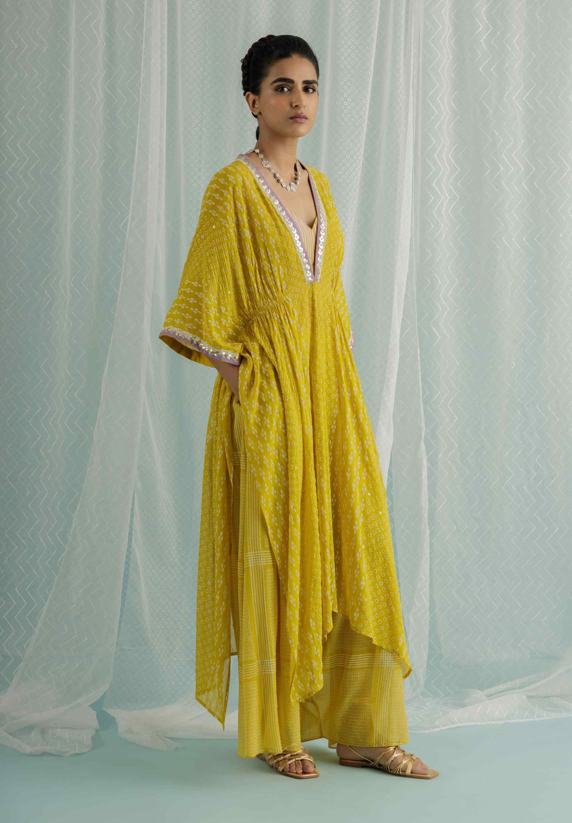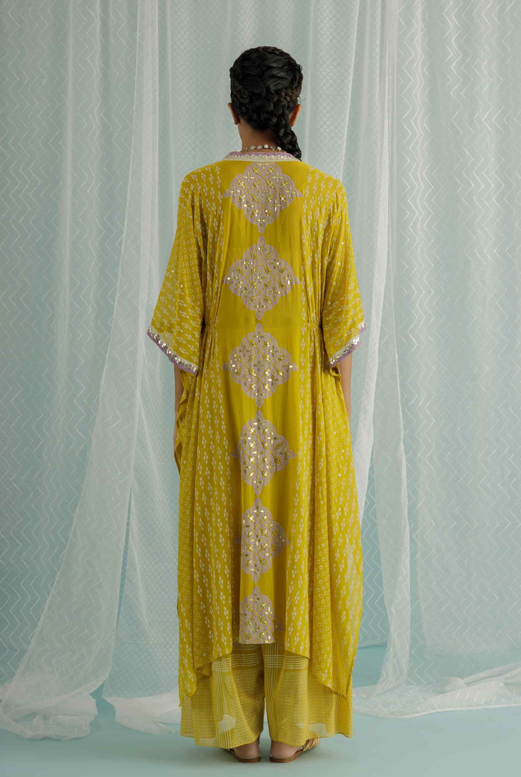 Our canary georgette cape features custom block printing in delicate lilac and ivory hues, enhanced with hand-embroidered gota, sequins, and beads. This elegant cape is paired with a stripe-printed blouse and printed low-crotch trousers, offering a sophisticated blend of traditional artistry and modern design. Perfect for special occasions, this ensemble ensures a standout look with timeless charm and contemporary flair.