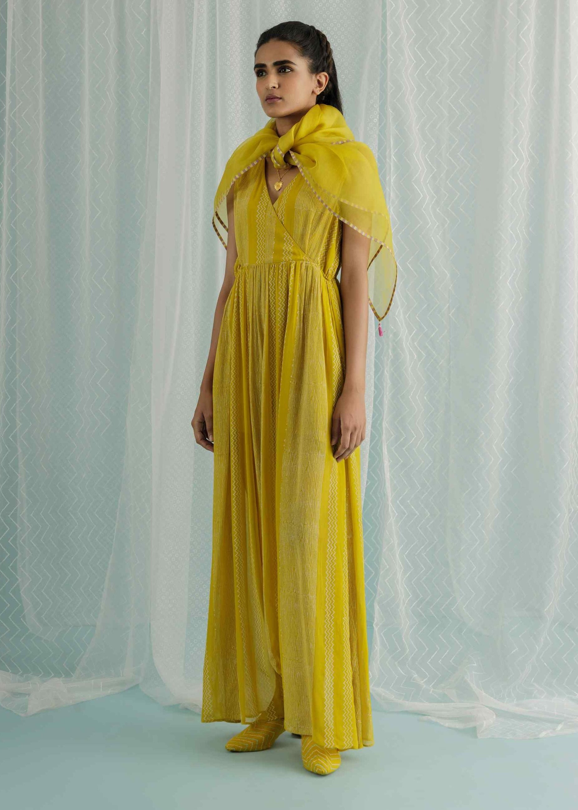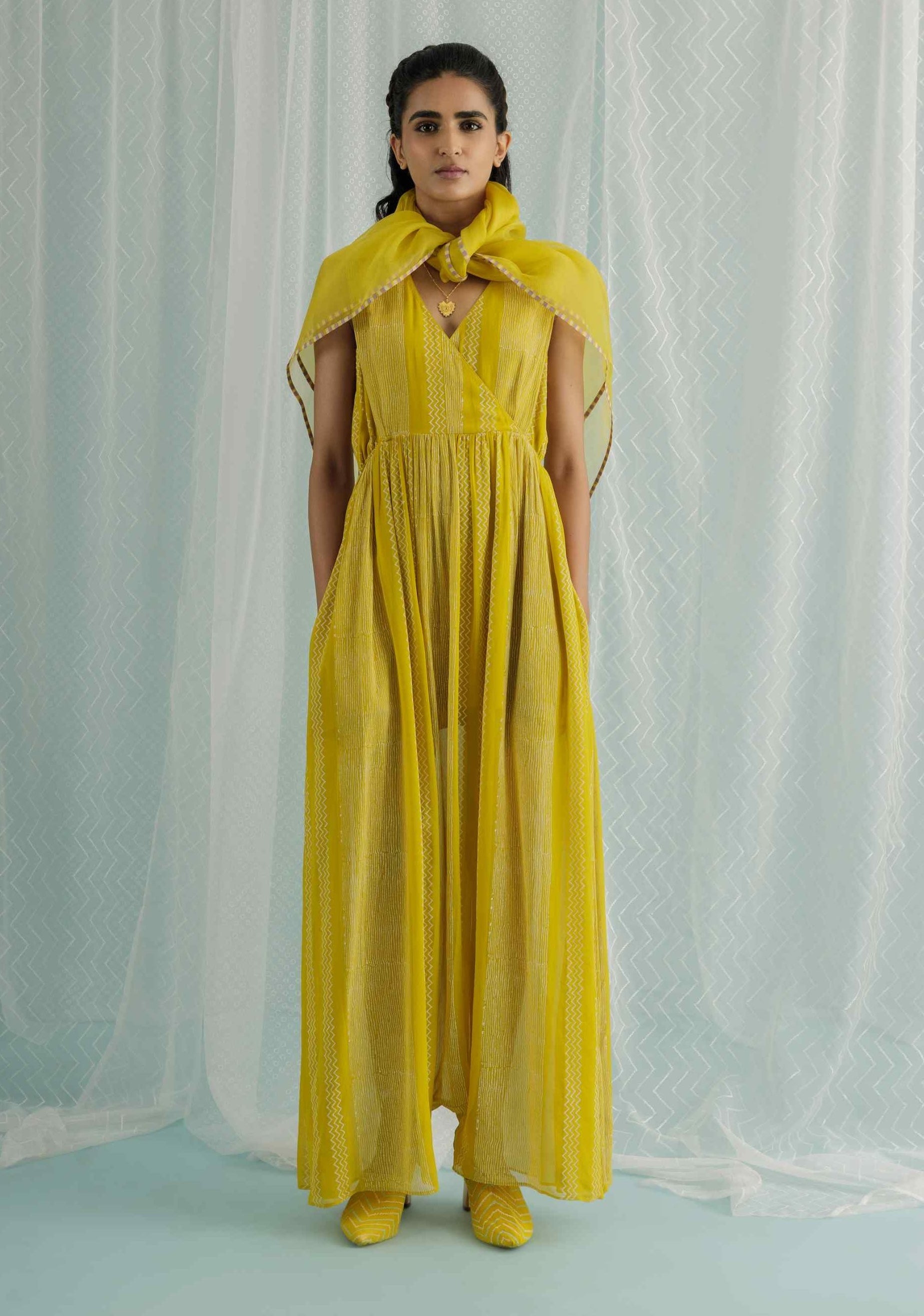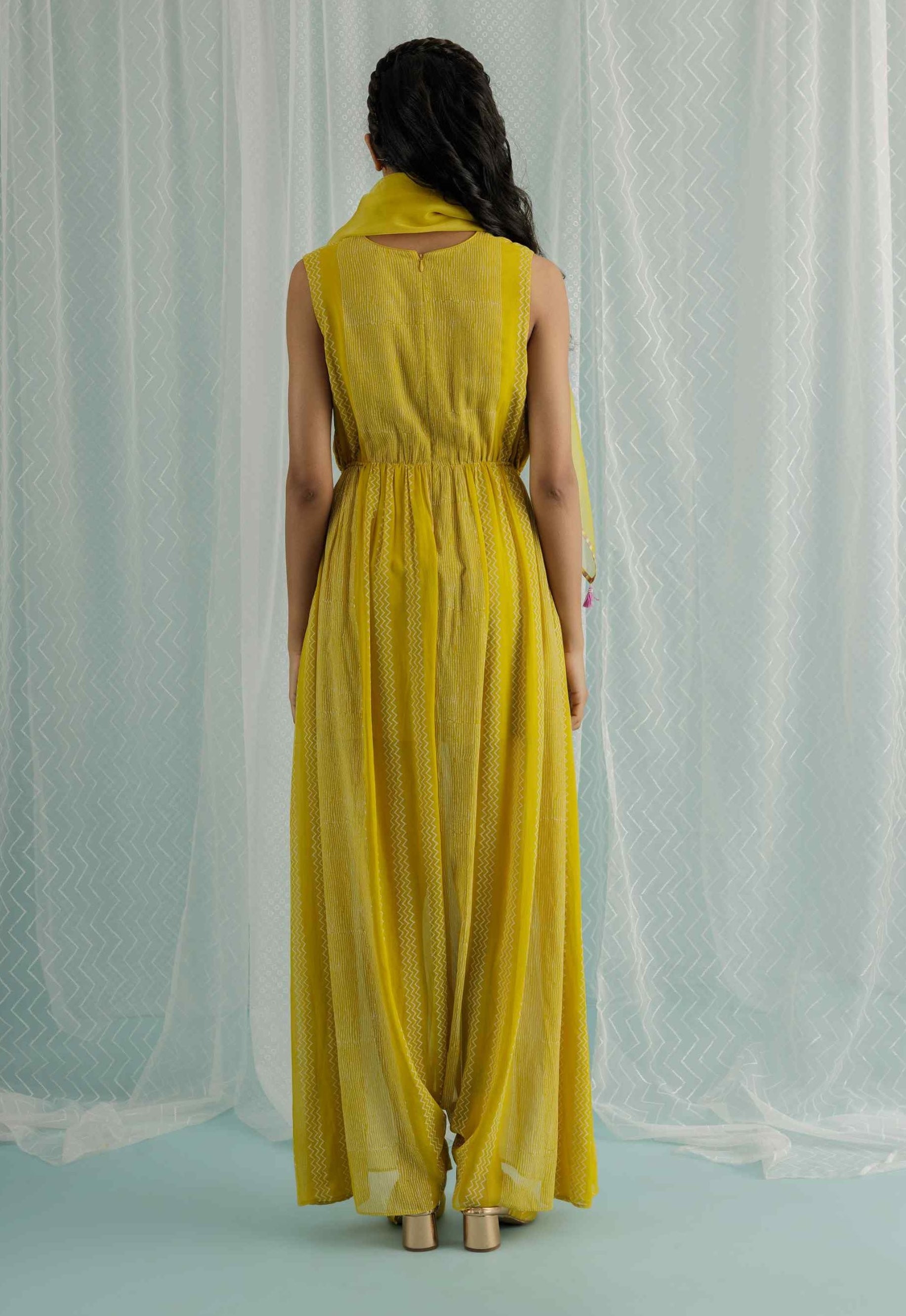 Discover vibrant sophistication with our canary georgette jumpsuit, featuring custom block printing in elegant shades of ivory. This eye-catching jumpsuit is perfectly paired with a stylish organza stole, accentuated with refined stripe finishing. Combining contemporary design with timeless charm, this ensemble is ideal for making a chic statement at any special occasion. Embrace a look that radiates both elegance and modern flair.